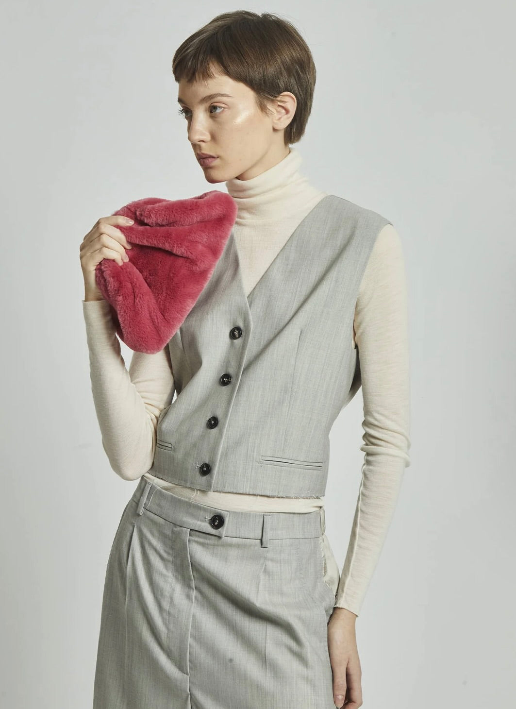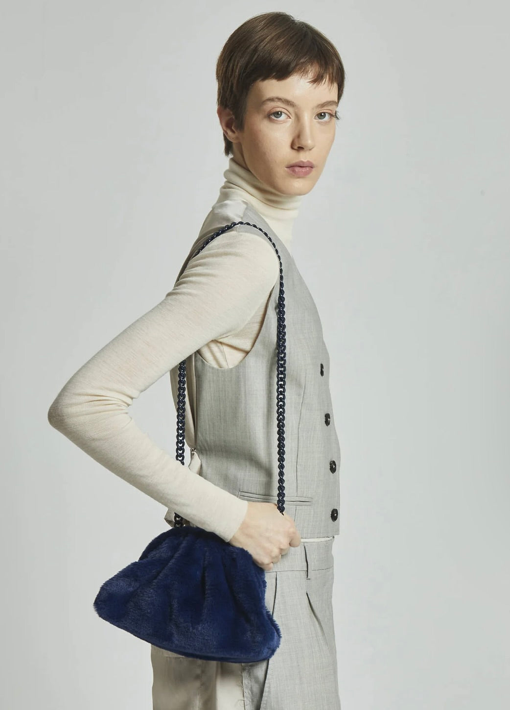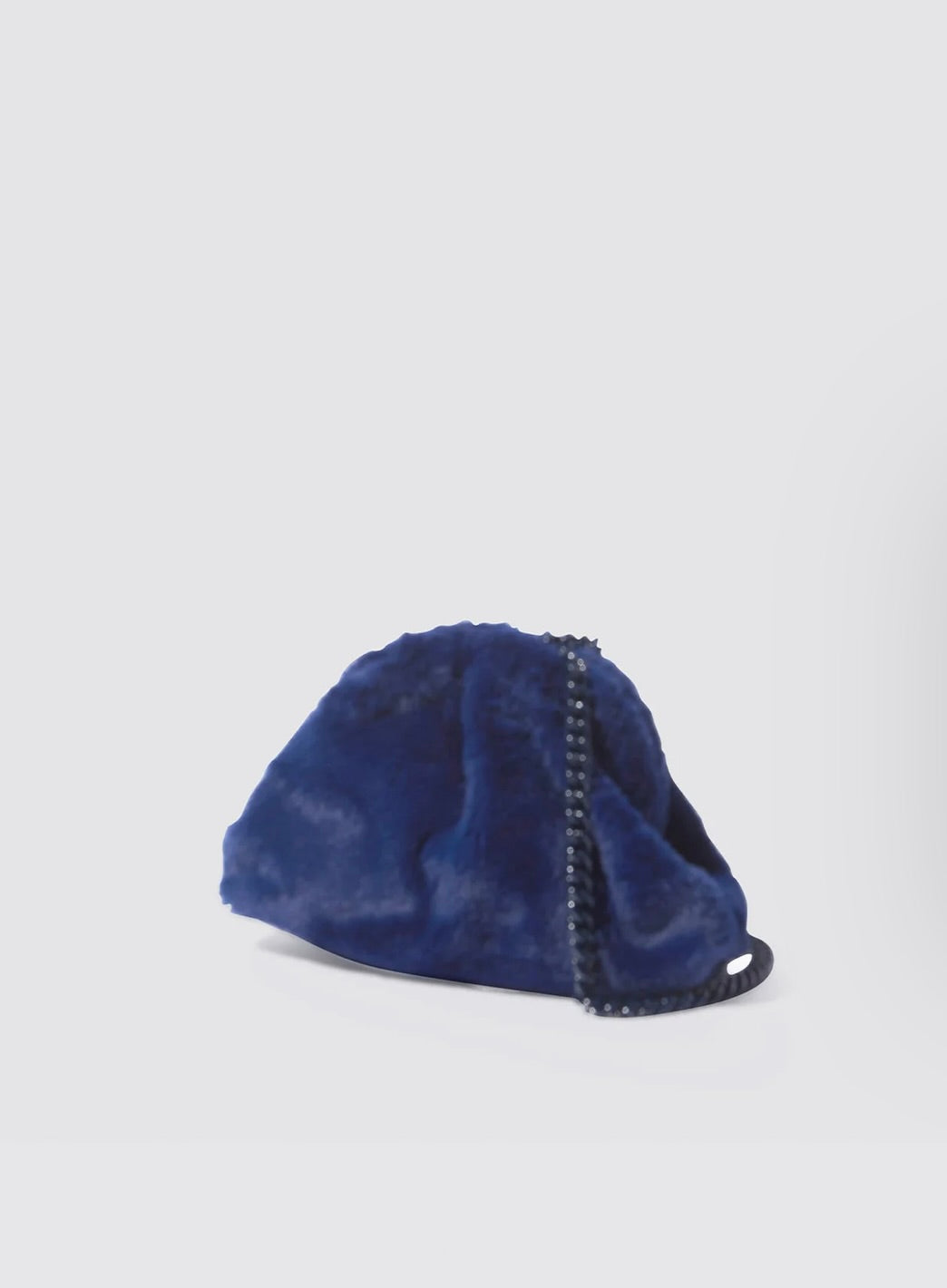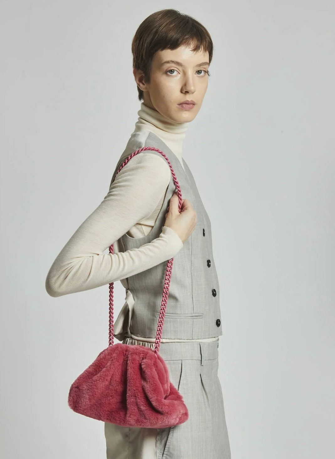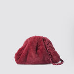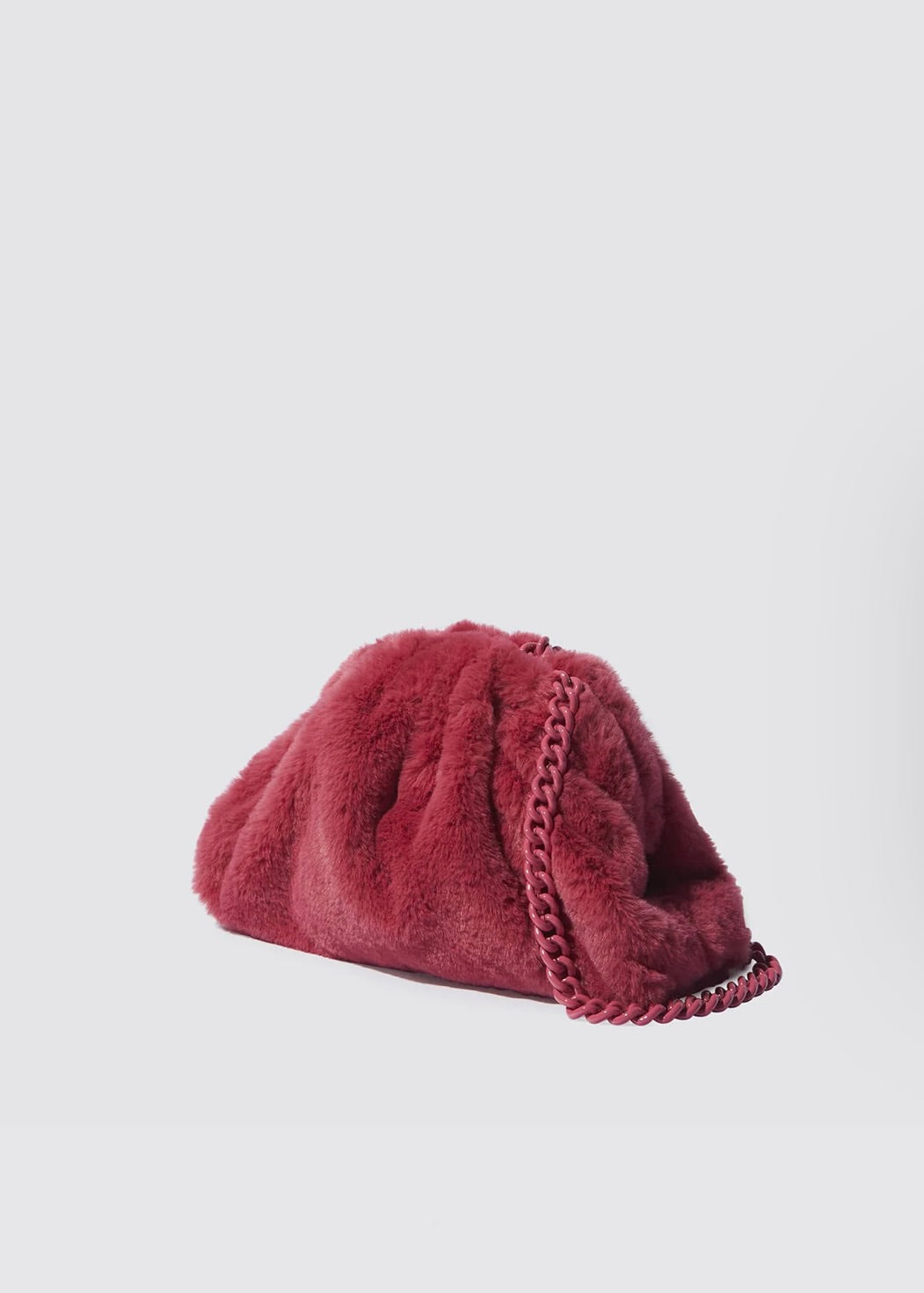 This petite women's clutch in faux fur offers a refined update to the classic Maria La Rosa design, crafted for year-round elegance. Blending metropolitan chic with practical capacity, it features a matching-tone chain for versatile shoulder wear. Exquisitely crafted and fully made in Italy, it embodies sophisticated style and functionality.