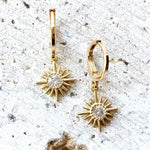 Delicate earrings featuring petite sun-shaped charms. Elegantly crafted with gold lever-back closures for a refined finish.