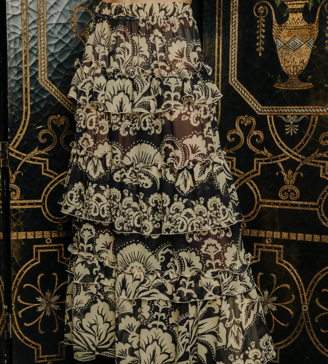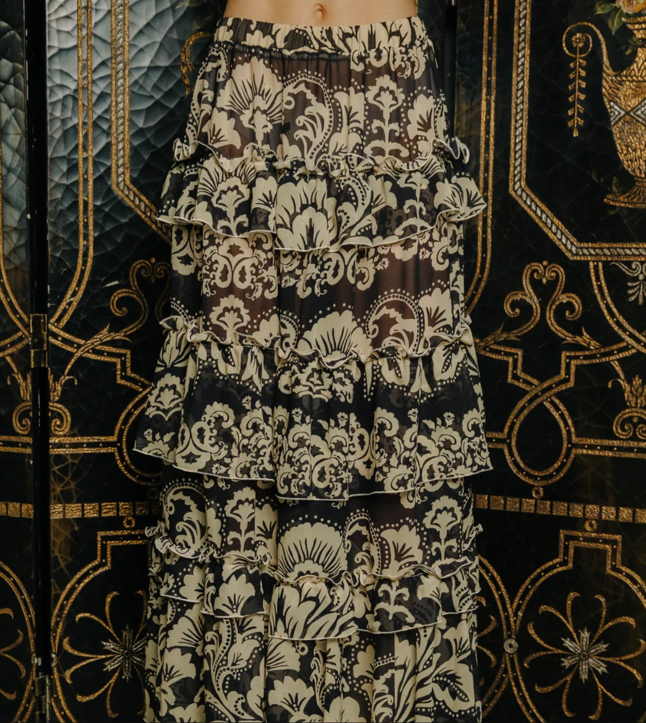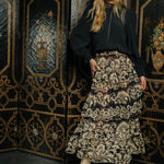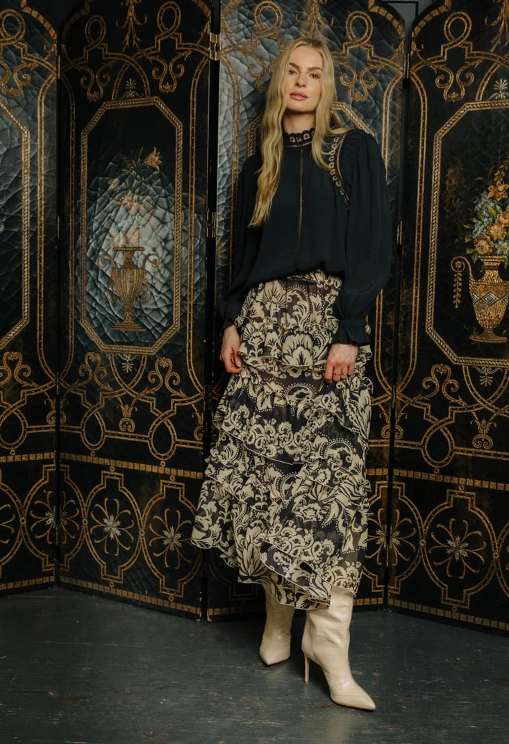 The Love the Label Alani Skirt showcases a tiered ruffle design in the elegant Richmond Floral Print, enhanced by a sheer finish that adds delicate texture and fluid movement. Crafted with an elastic waistband, it offers both comfort and ease, making it an ideal choice for sophisticated layering and effortless style.