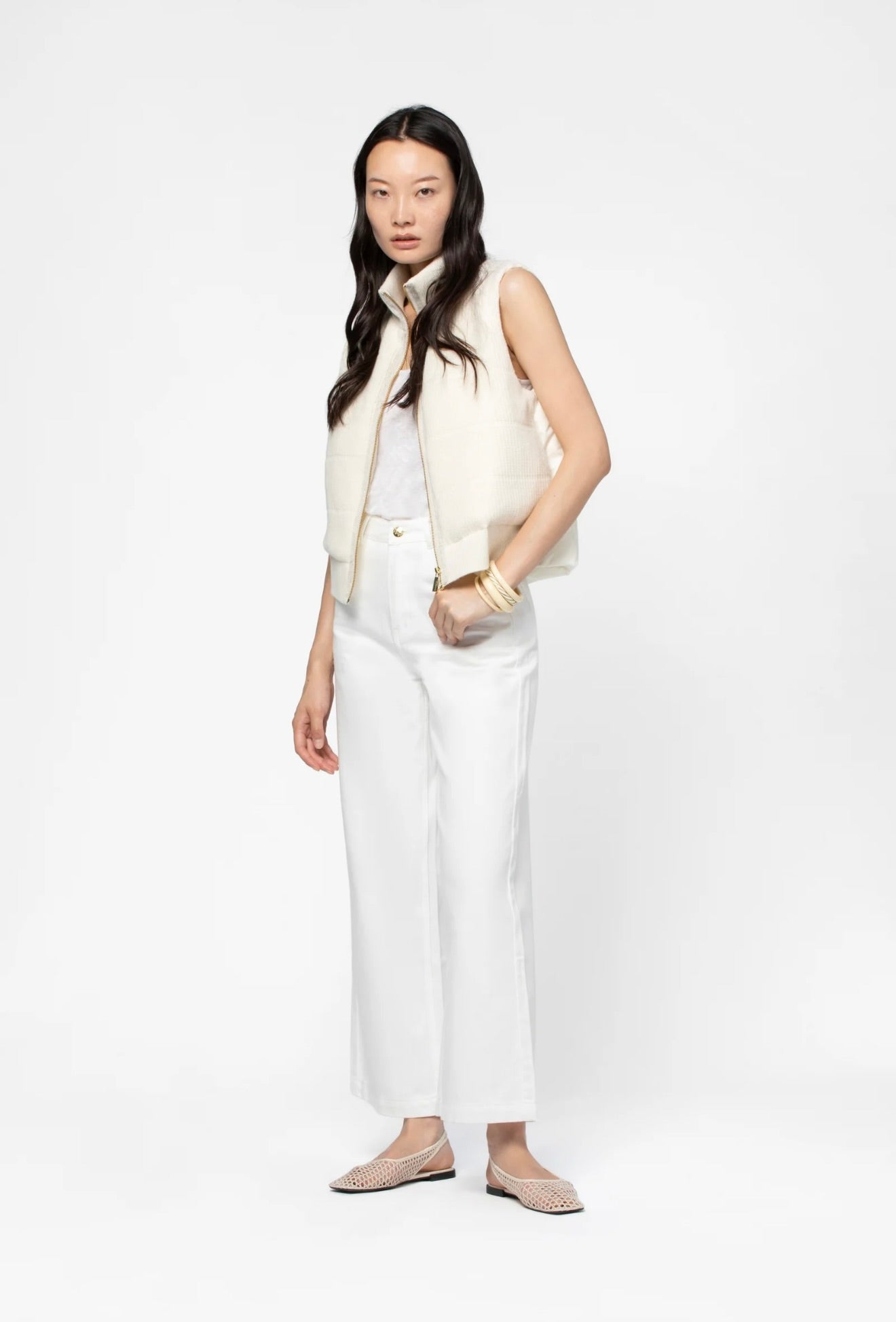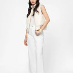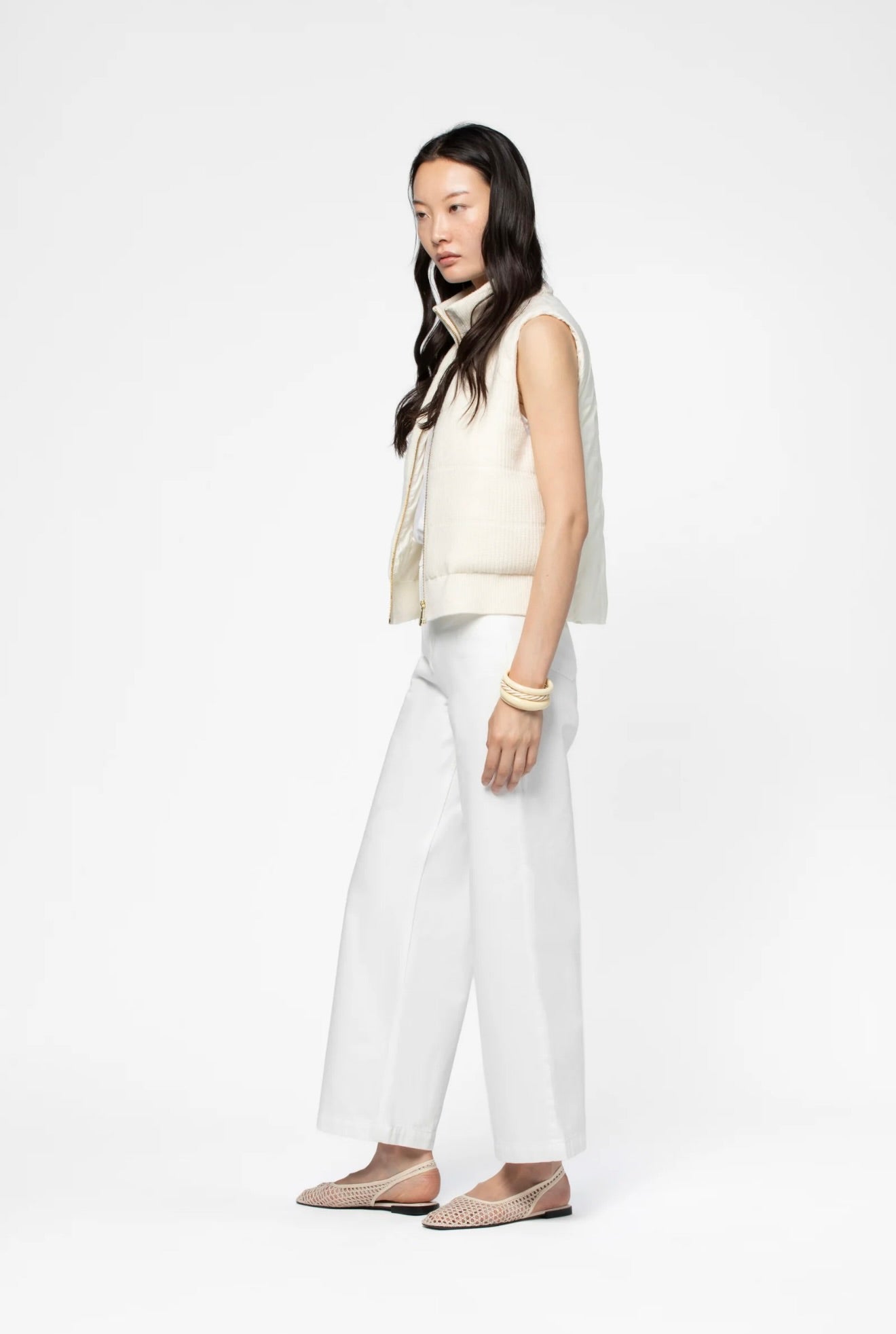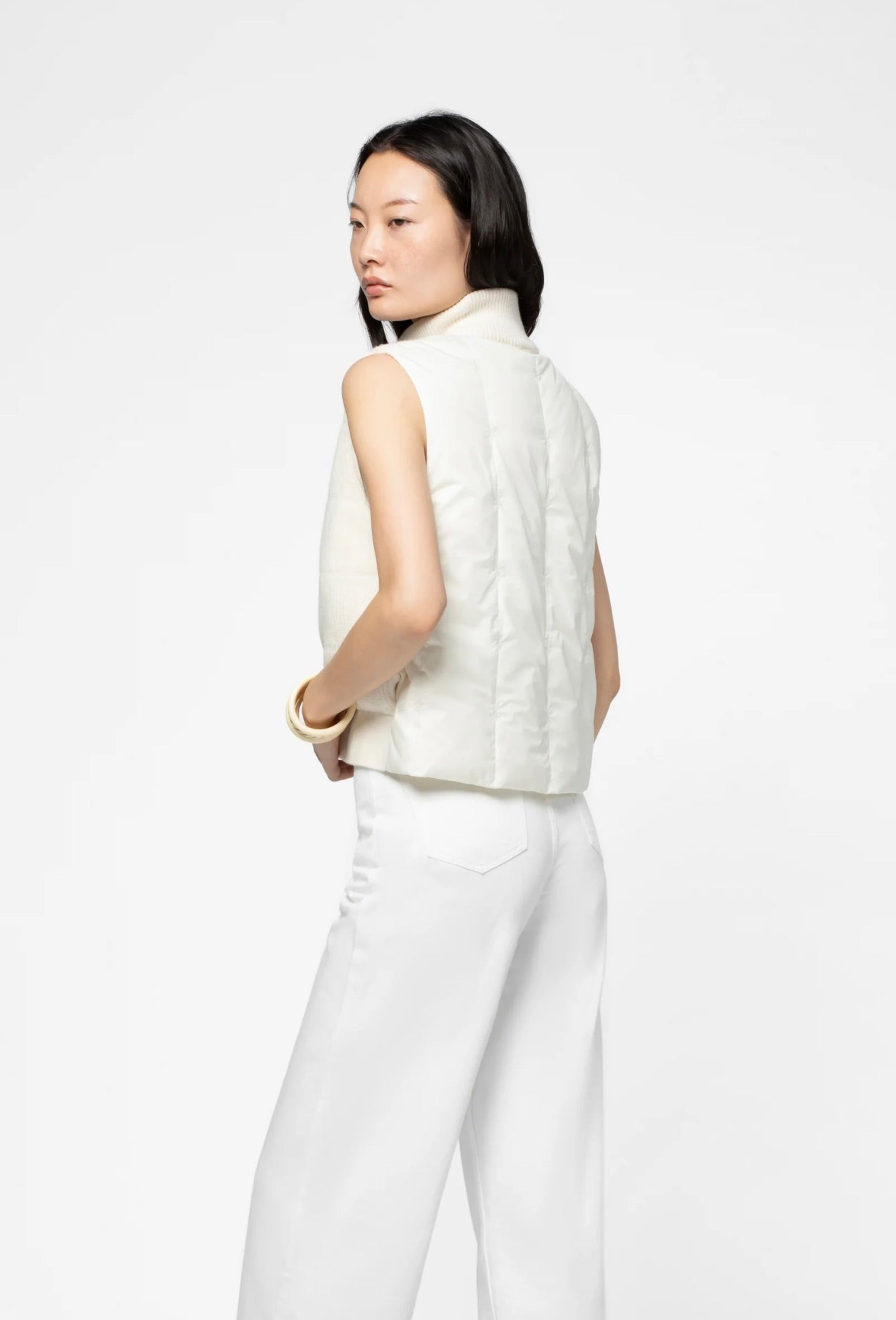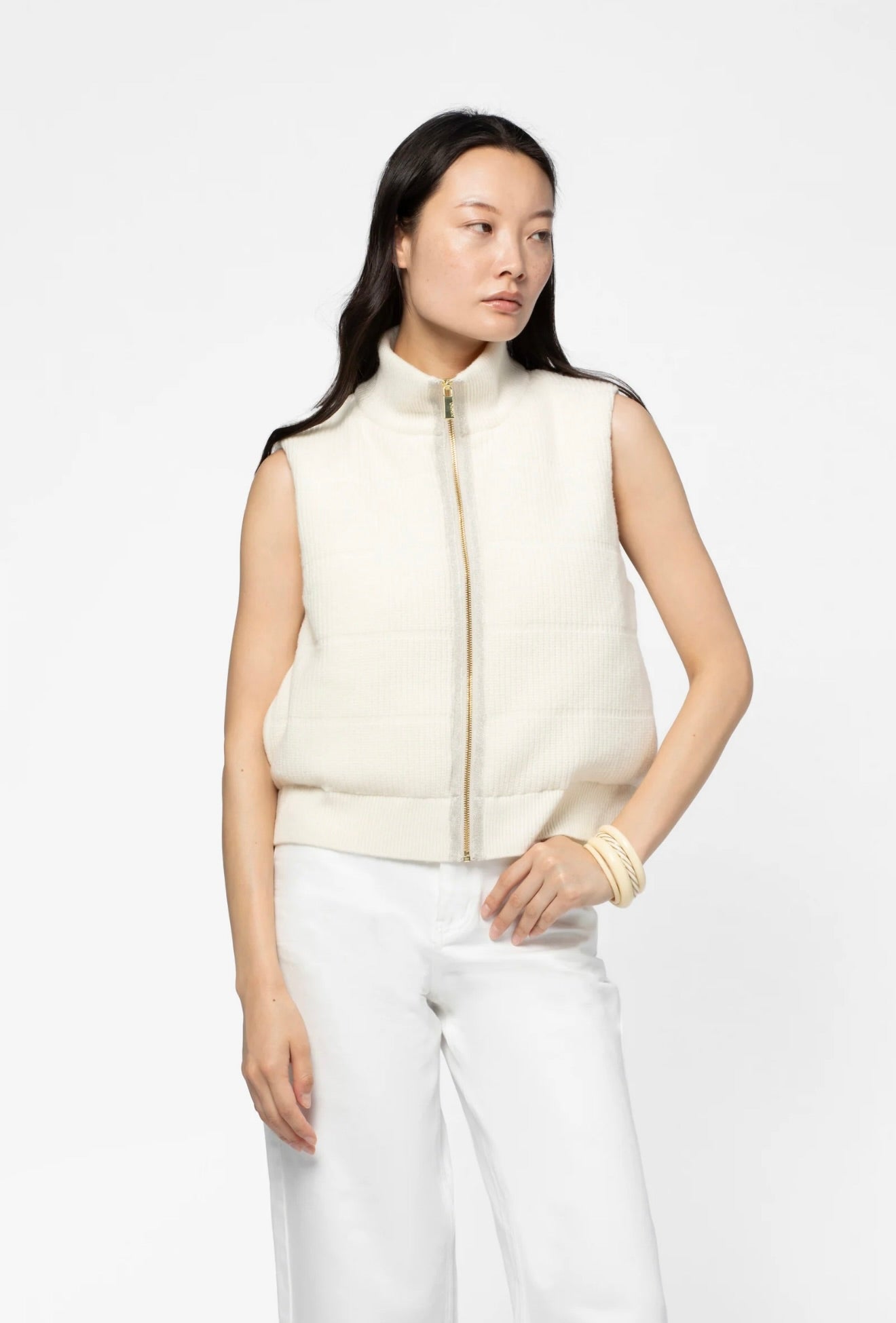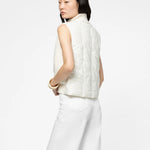 Crafted from luxurious wool and cashmere, this sleeveless puffer jacket seamlessly blends refined elegance with contemporary design. The ribbed knit front provides textural sophistication, while the nylon back features distinctive vertical quilting and MAX&MOI monogram embroidery. Lightweight padding offers subtle warmth without bulk, and the structured stand-up collar completes the polished silhouette. An effortless layering piece for the discerning wardrobe.