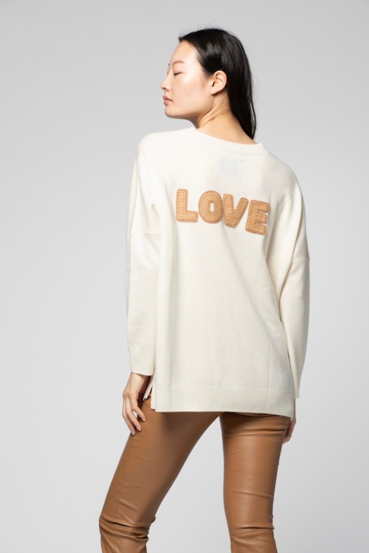 Indulge in the luxurious comfort of the Max&Moi Paola Sweater. This sumptuous sweater is crafted from premium wool and cashmere fabric, enveloping you in softness. The back showcases a striking leather "LOVE" inscription, a refined detail that transforms this essential knit into a meaningful statement piece. This sweater seamlessly complements any wardrobe with understated sophistication.