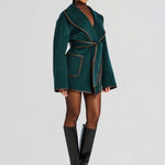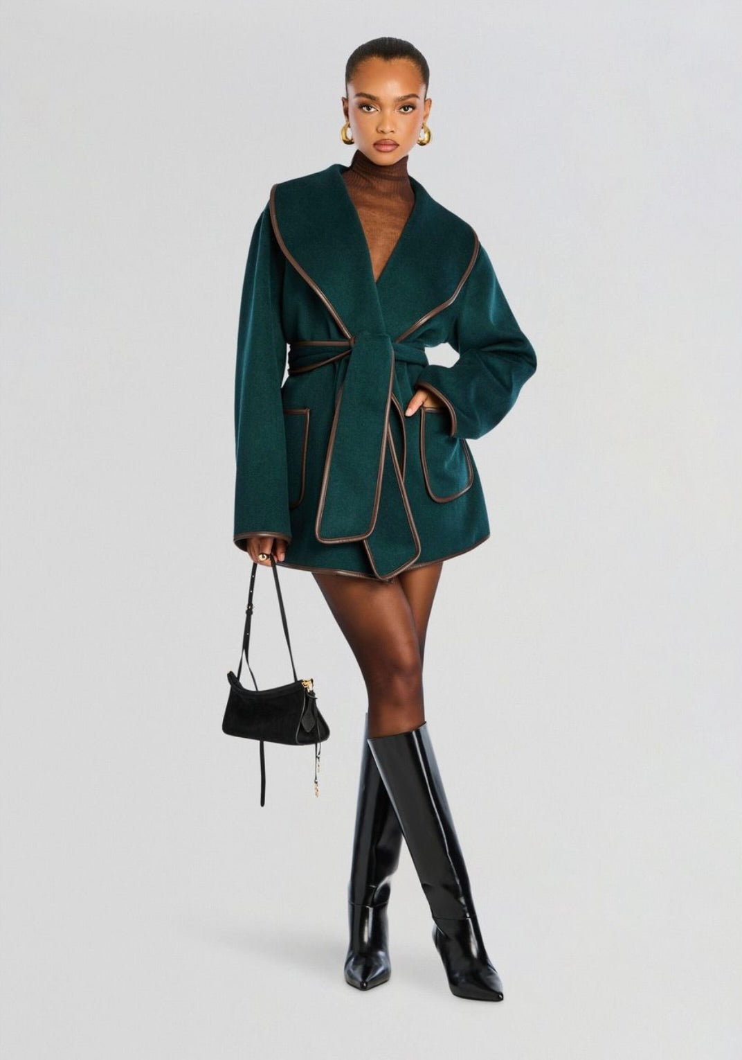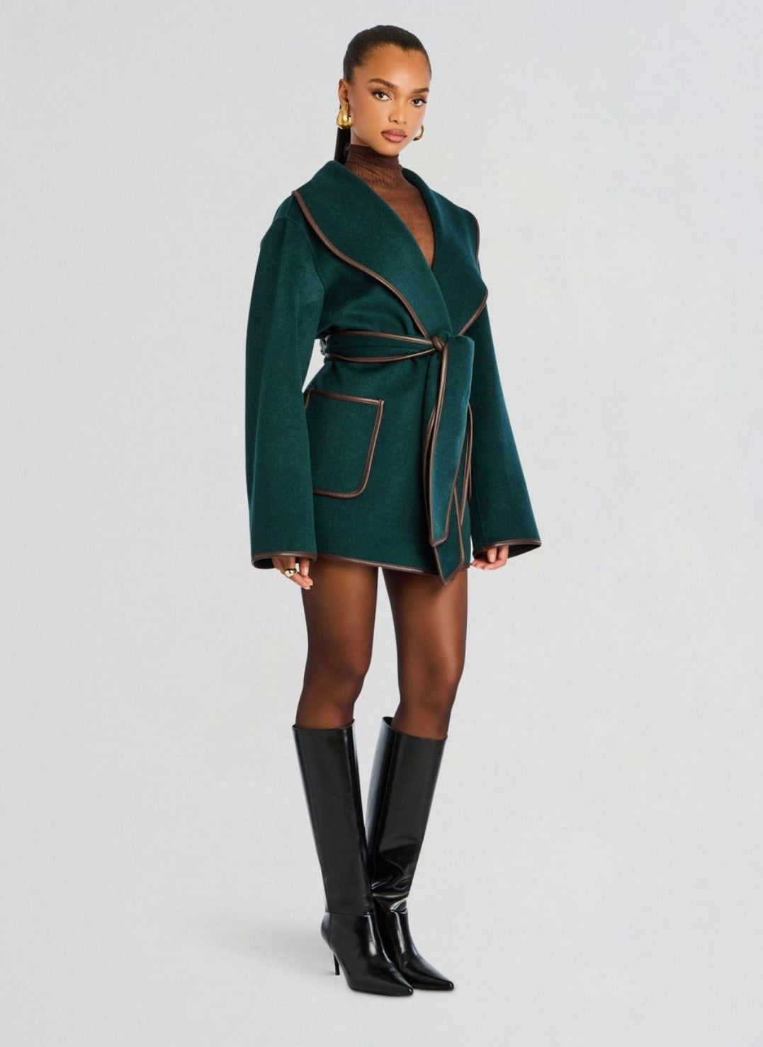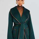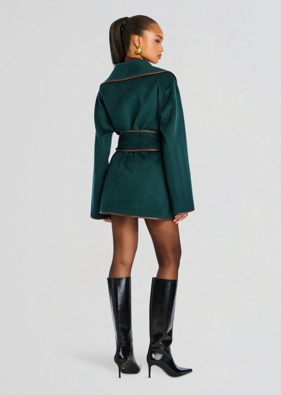 This SEROYA Dulcetta Wool Coat exudes refined elegance with its belted wrap design and gracious shawl collar. Detailed with faux leather piping for a modern touch, it also features deep front pockets for practicality. Presented in a rich Evergreen and Slate Brown palette, this coat effortlessly blends warmth and style, perfect for elevating any sophisticated wardrobe.