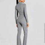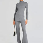 These mid-rise knit flare pants offer a sleek silhouette with a comfortable fit. Perfectly complement them with the Denise Cardigan. Available here in Medium Grey.