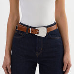 The LAMARQUE Cairo Belt in Tan showcases a striking embossed leather strap that embodies bold luxury. Its smooth, curved silver-tone buckle adds a sleek, modern touch, elevating any outfit with sophisticated style.