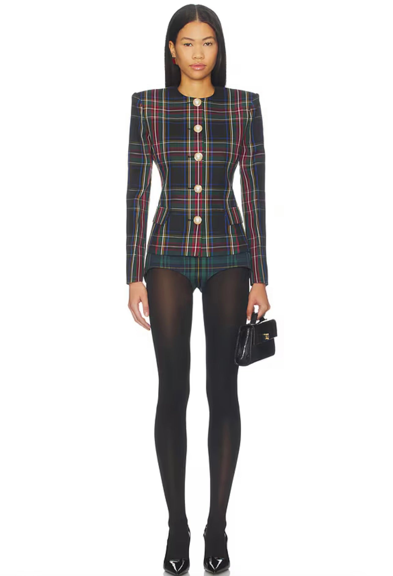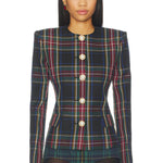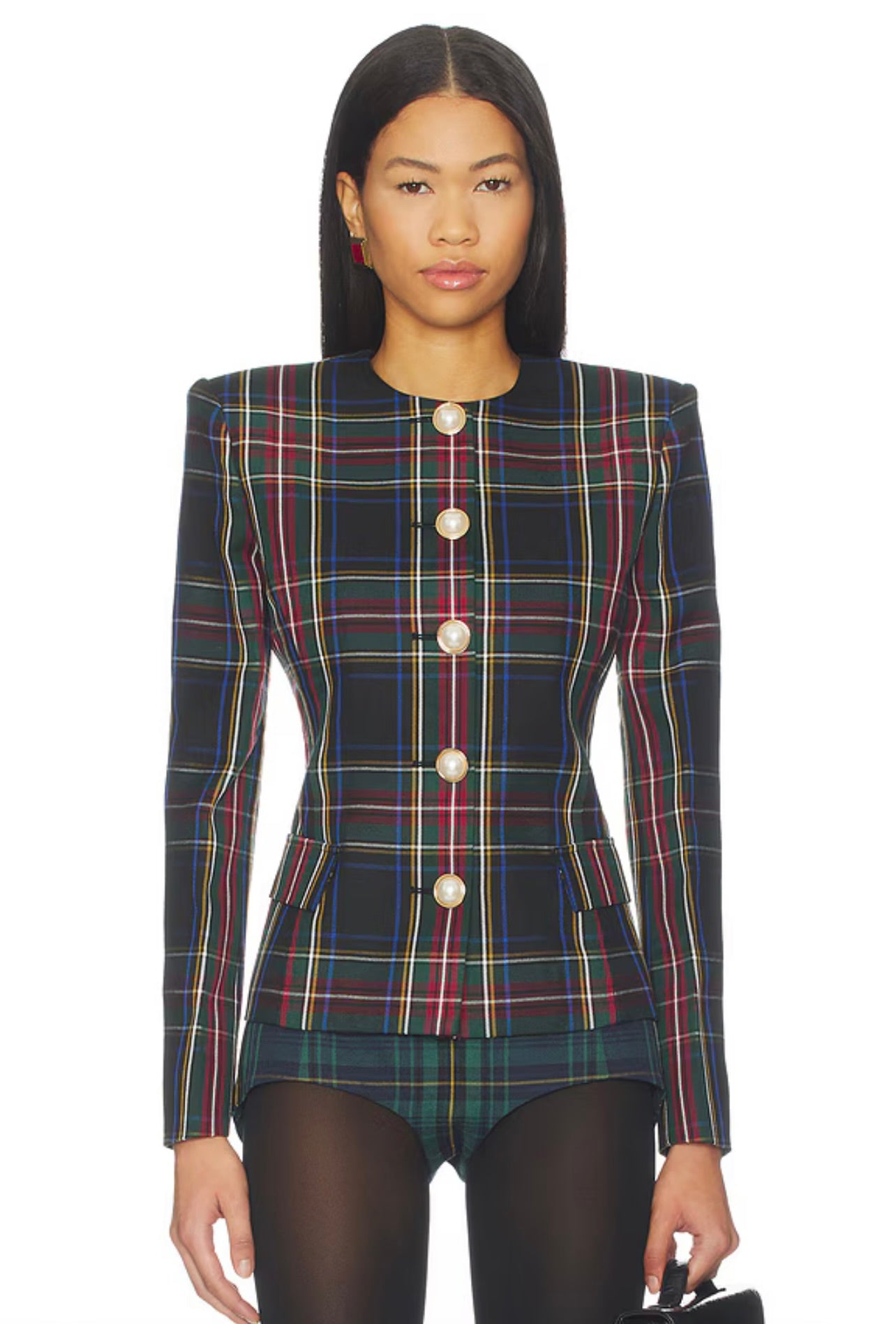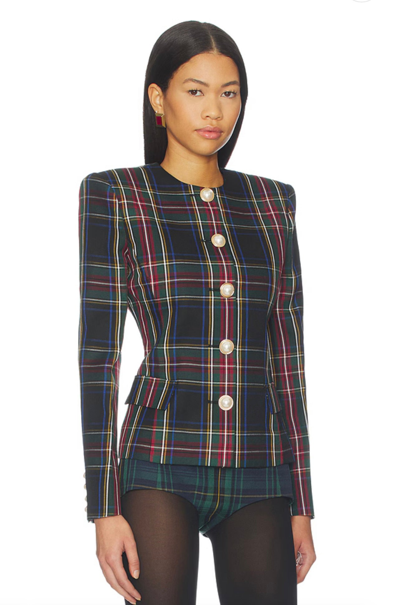 The Rora Jacket adds structured style with commanding shoulder pads and a polished round neckline. The jacket features a pearl-style button closure and faux front pocket details.