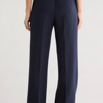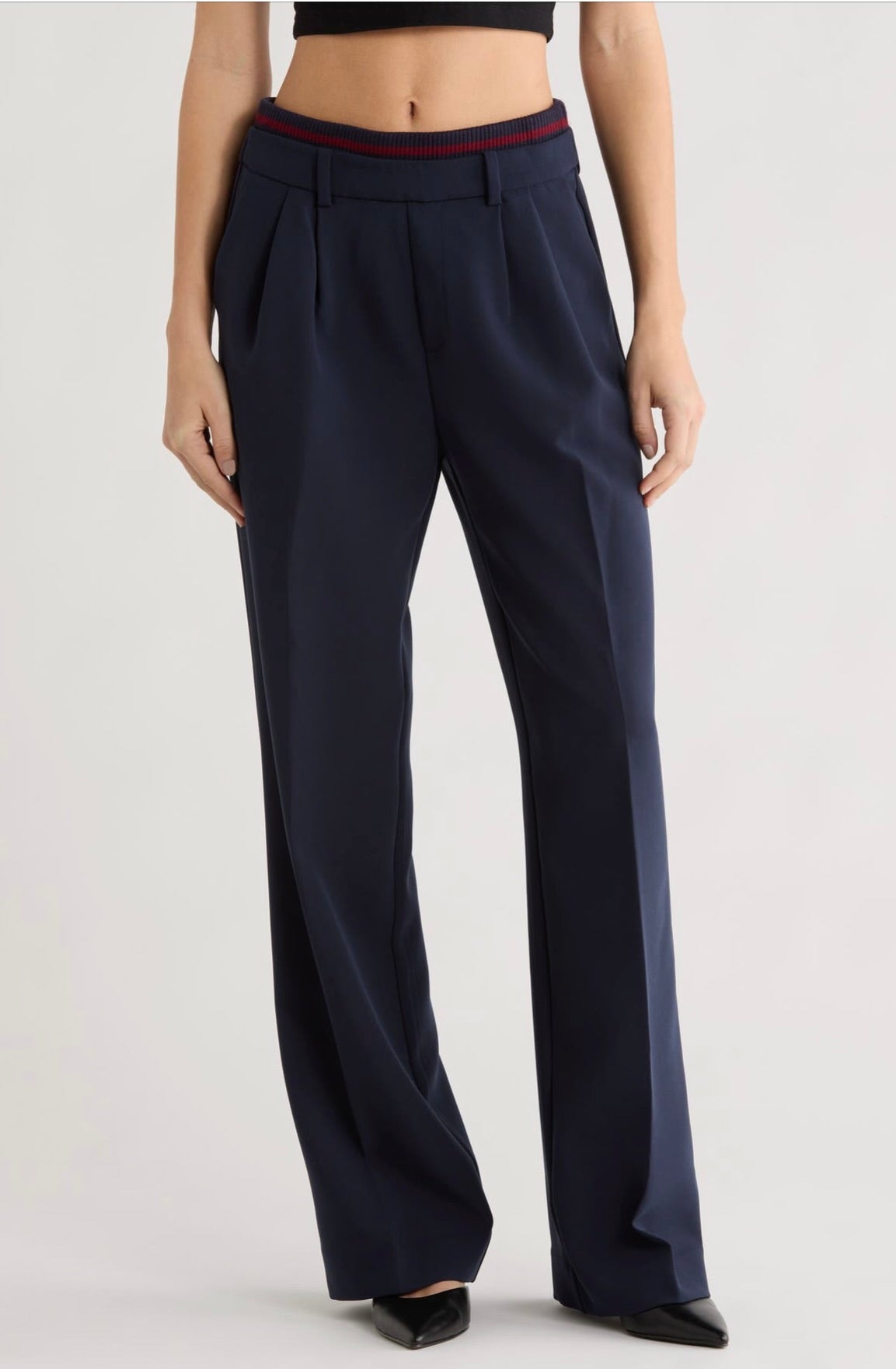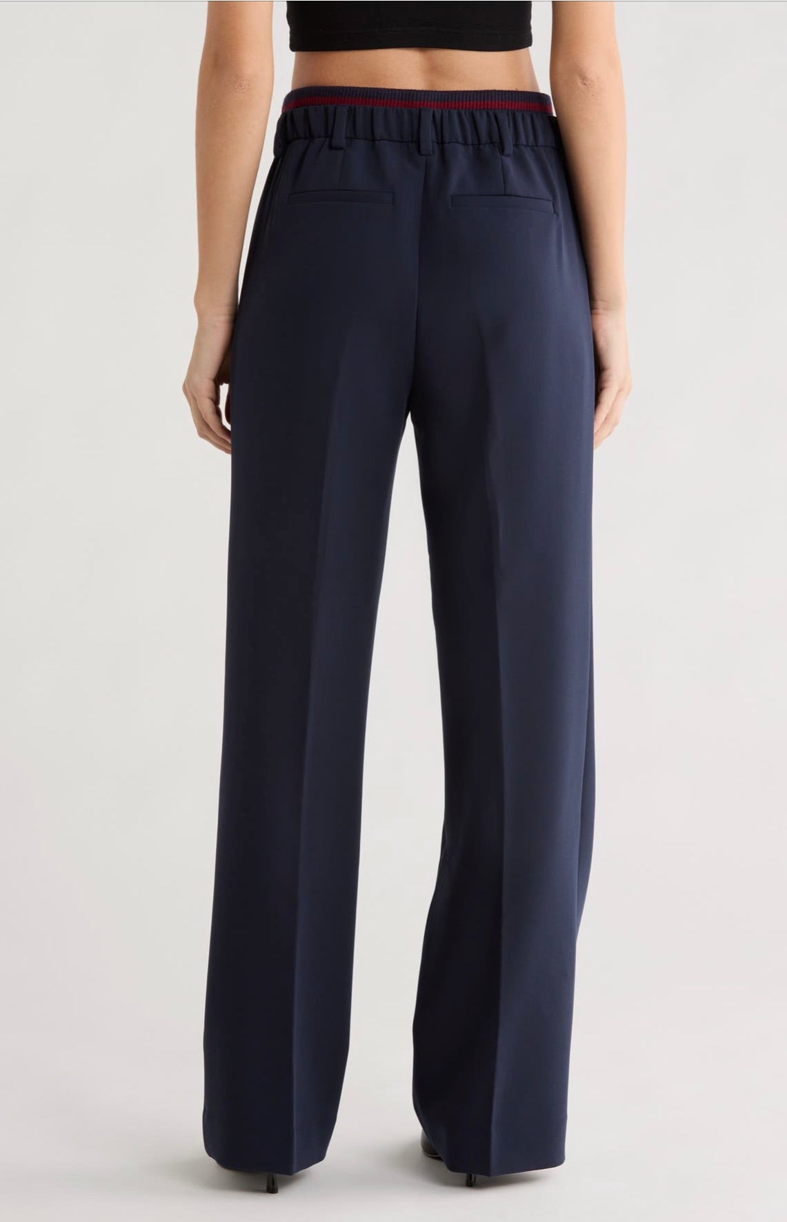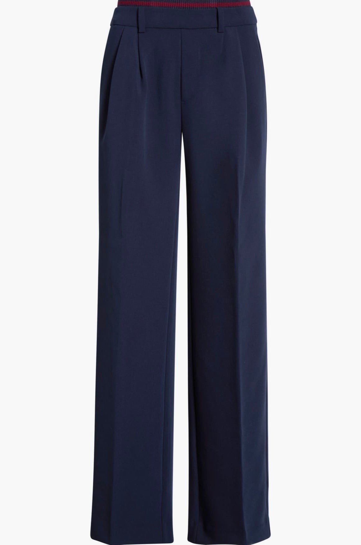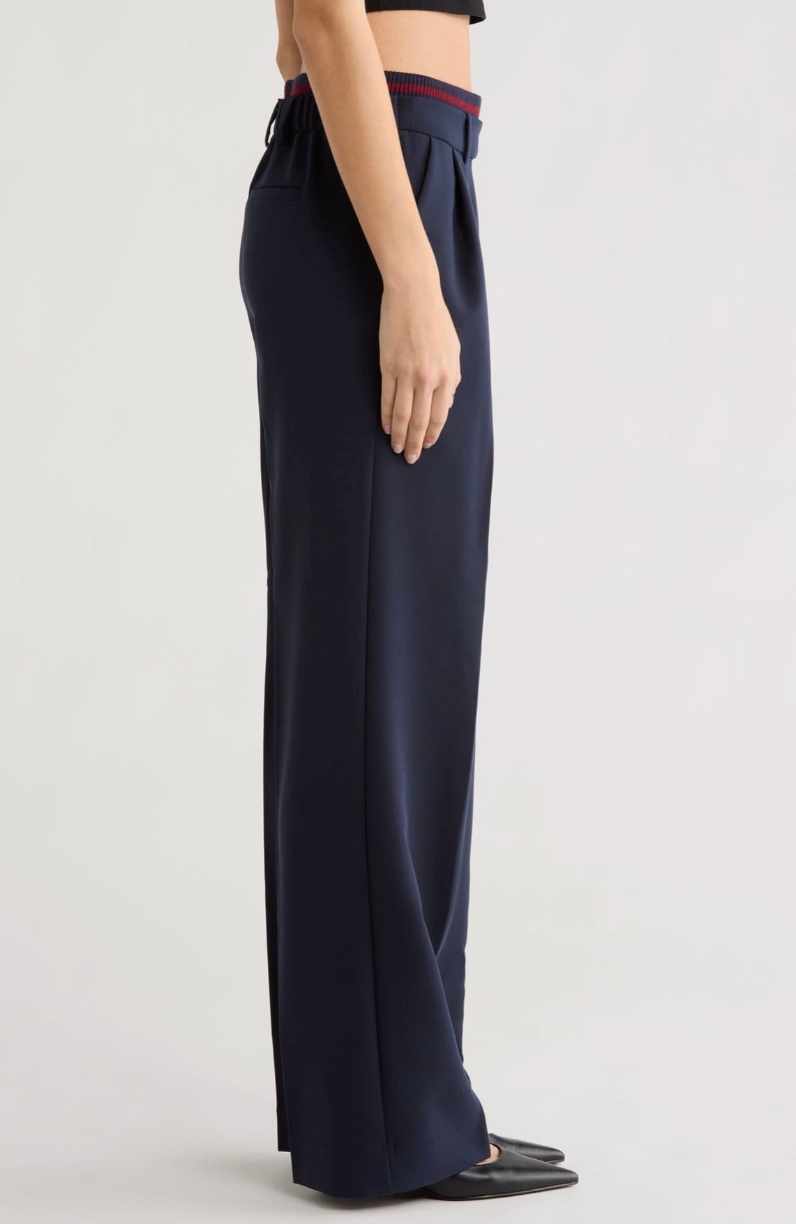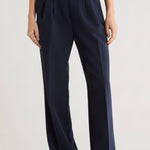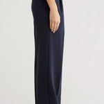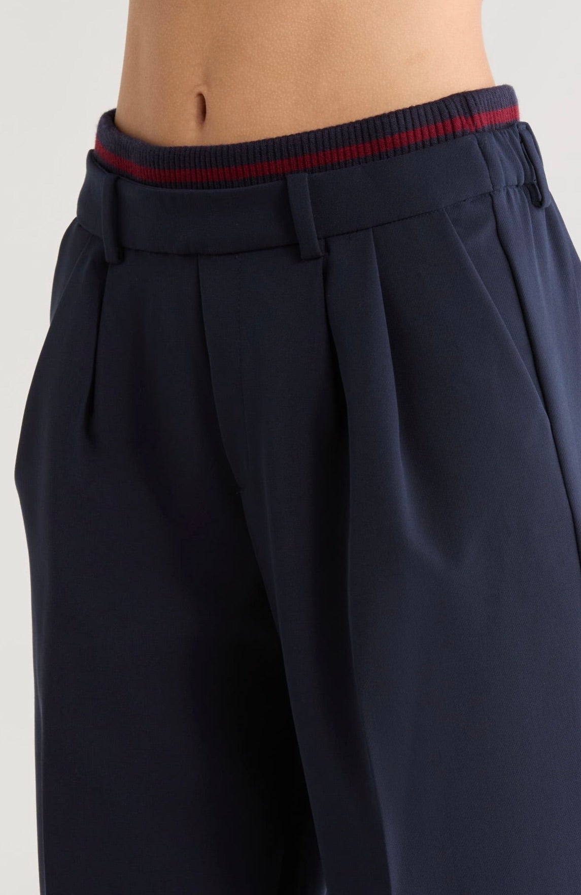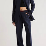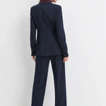 The Varsity Pant brings polished elegance to your wardrobe with its structured suiting fabric and thoughtfully designed details. Featuring an 11.25" striped rib-knit pull-on waistband with back elastic, this pant offers comfort without compromise. The faux front zipper and front pleats create a refined silhouette. Cut with a 32" inseam and relaxed fit, it pairs seamlessly with The Varsity Blazer in matching Navy/Vino for a coordinated, sophisticated look.