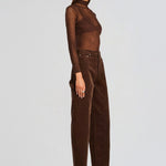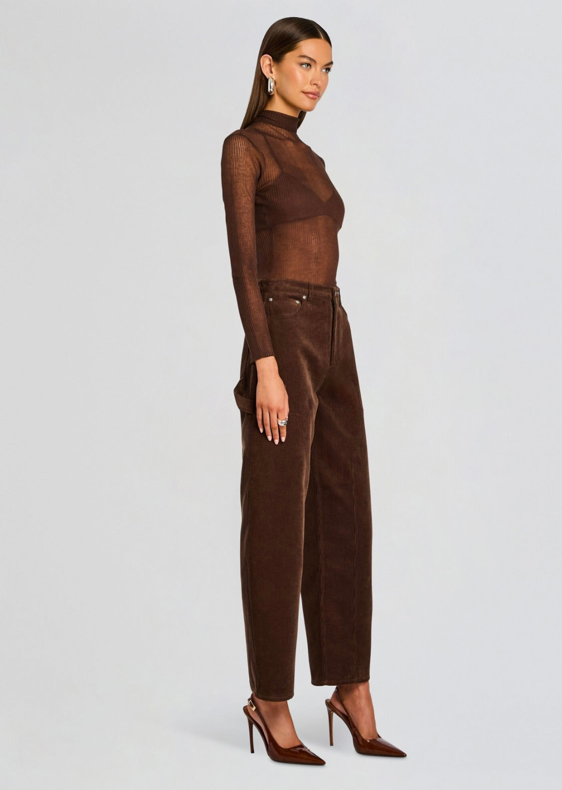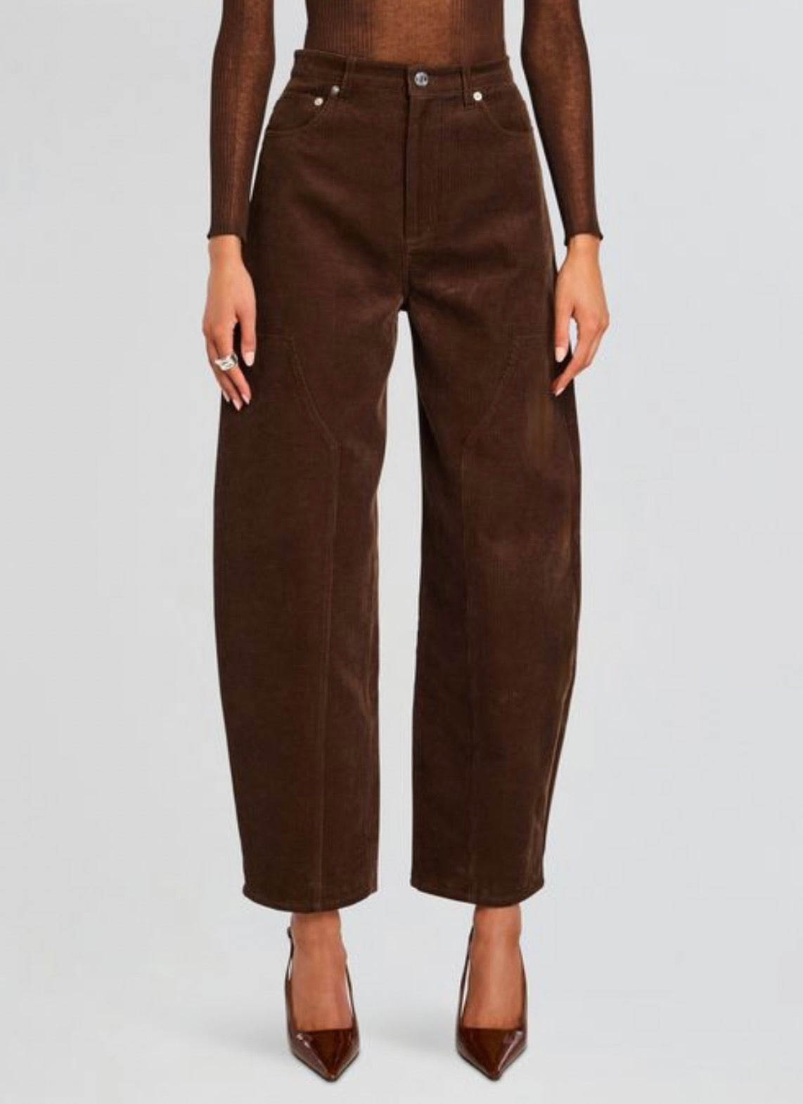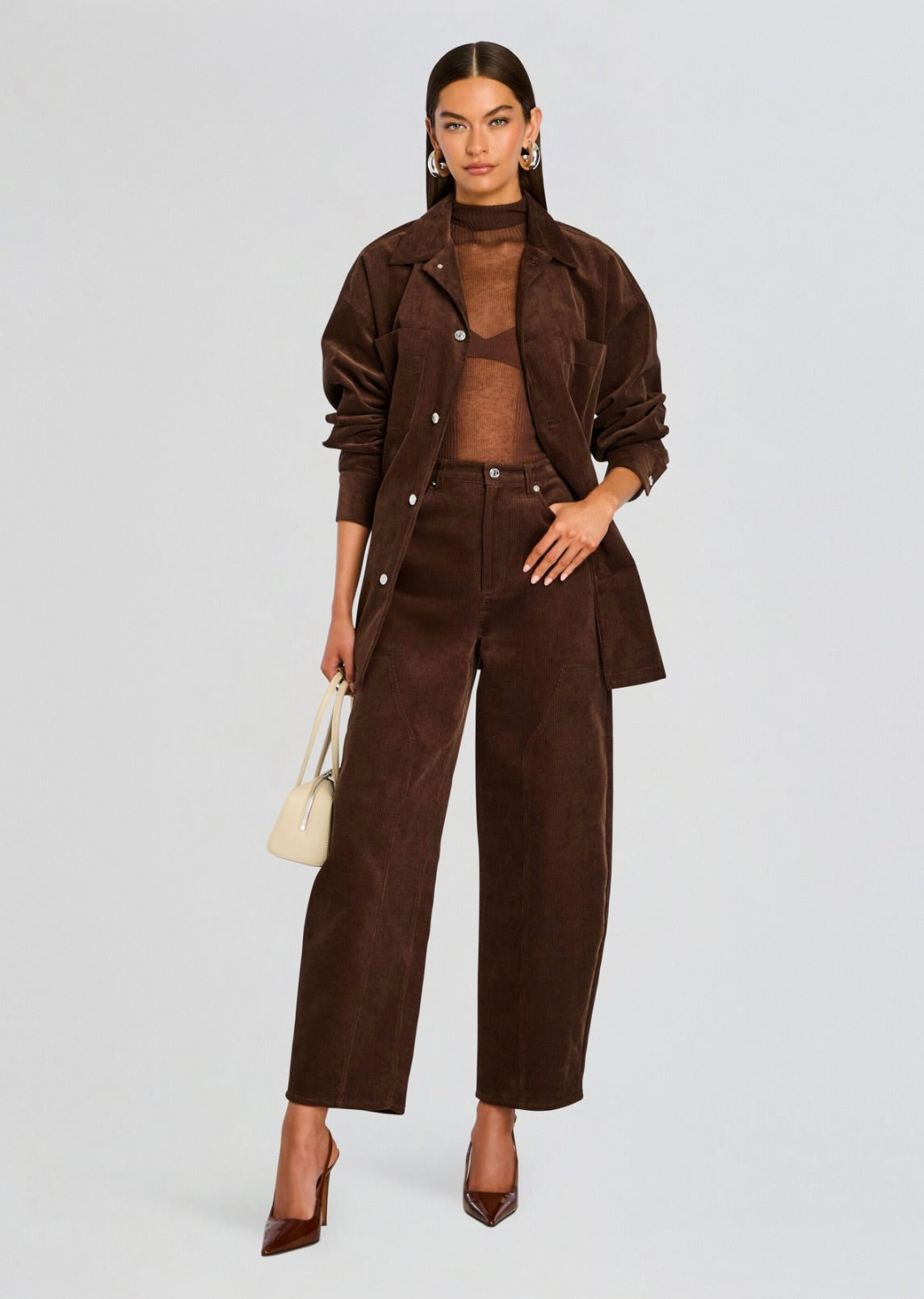 The SEROYA Fabi Corduroy Pant offers a high-rise design with an elegant barrel leg and ankle-length cut. Presented in a distinguished Slate Brown, this pant combines timeless style with refined detail.