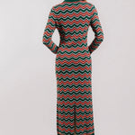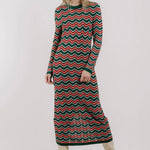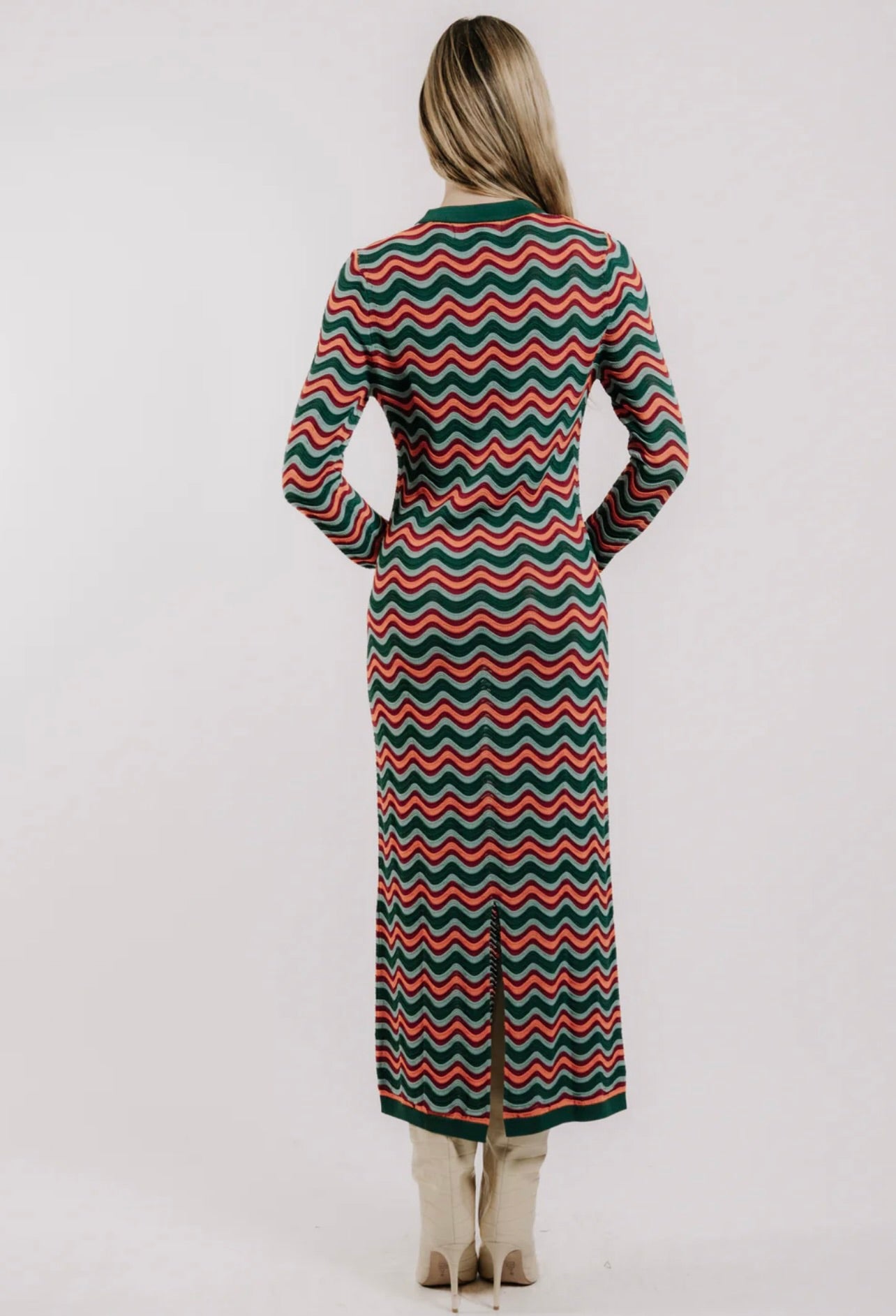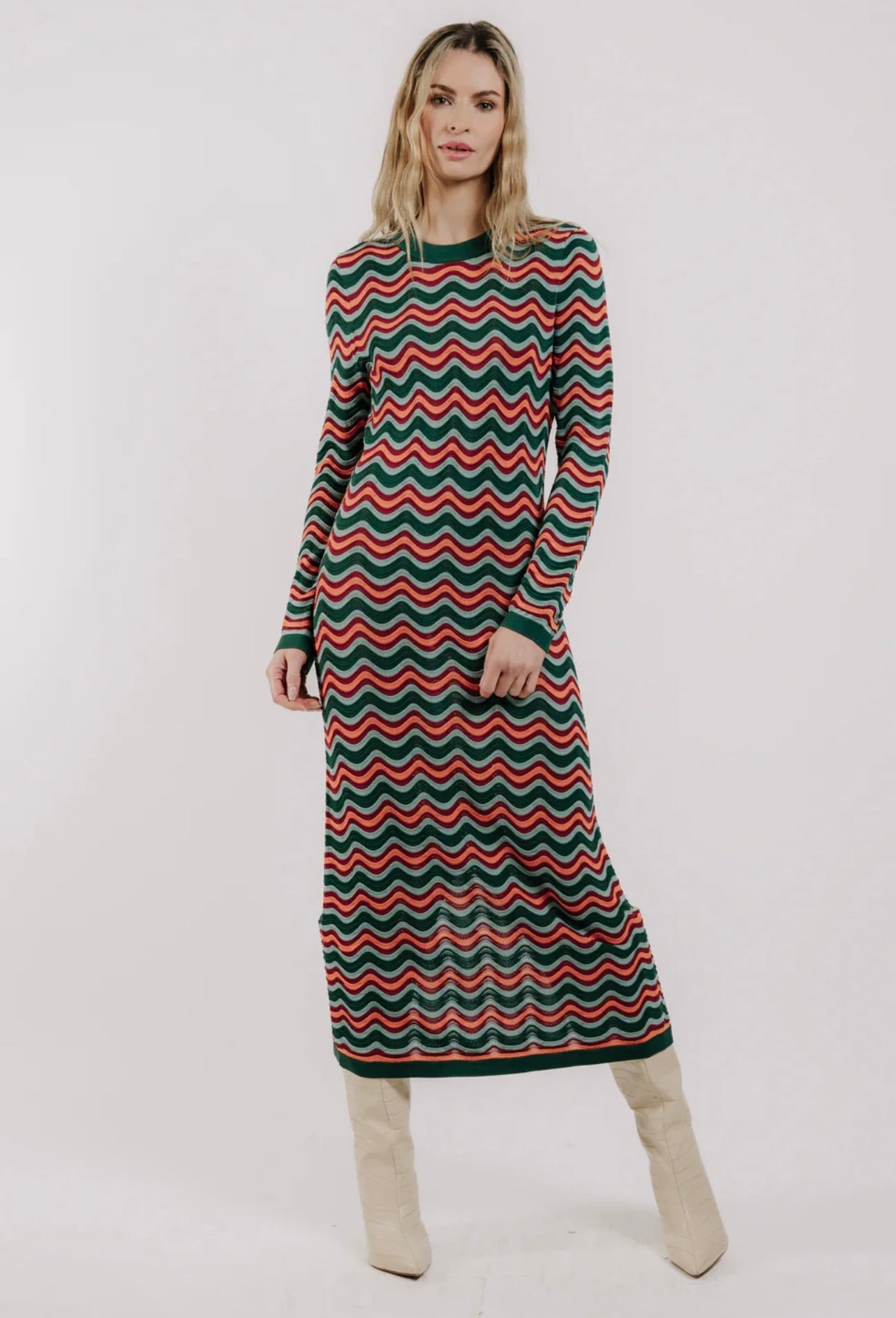 The Love the Label Sarafina Knit Dress features a striking green multi-wave stripe in a tailored silhouette that gracefully follows the body's contours. Its long sleeves and floor-length hem create an elegant, refined look perfect for making a memorable impression from day into night. This sophisticated piece blends bold patterning with classic design for a versatile, confident style.