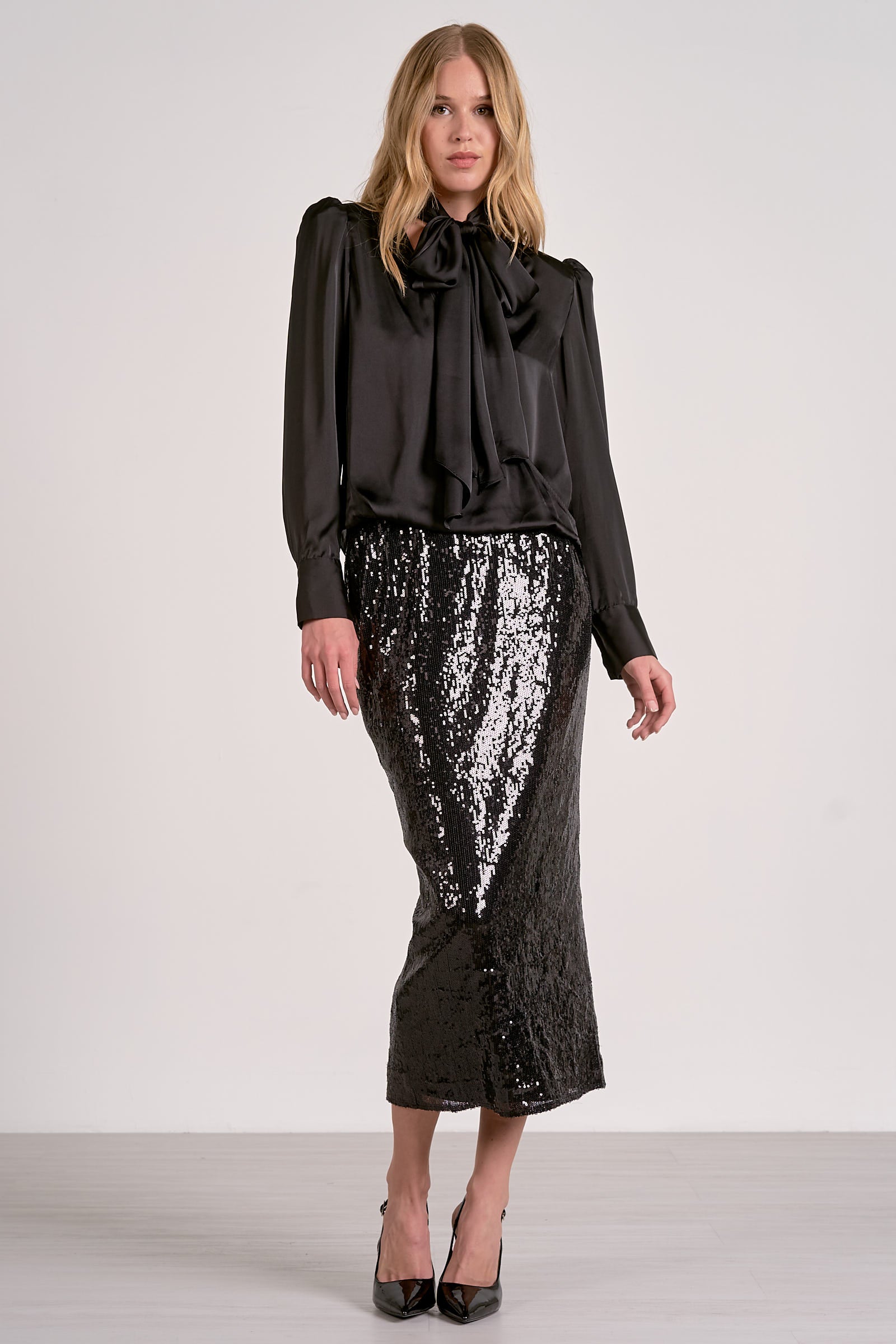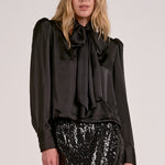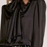 This refined, silky illusion wrap top seamlessly blends style and practicality. The detachable neck tie offers flexible styling, while softly sculpted puff shoulders and finished cuffs create understated sophistication. The gently gathered front and lengthened back hem work together to flatter your frame and simplify tucking. Crafted for the modern professional who values both elegance and ease, this piece transitions effortlessly across your day.