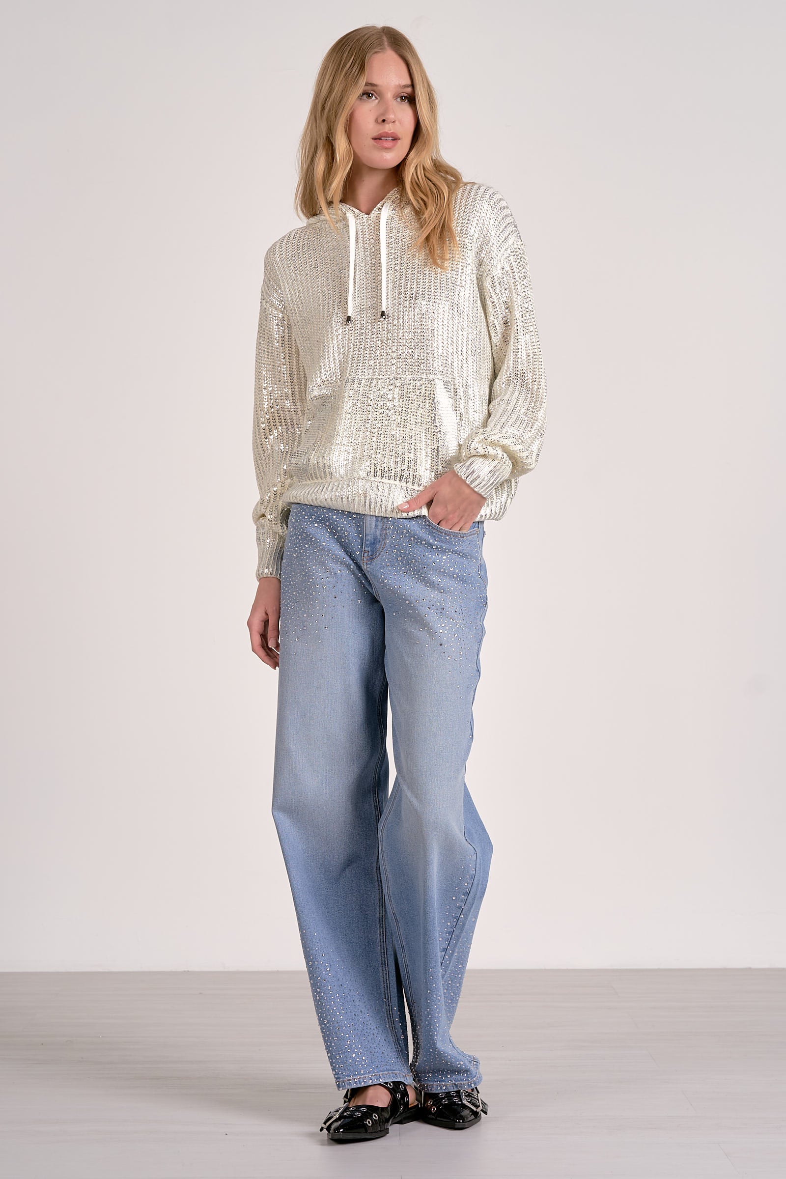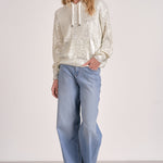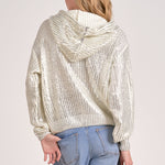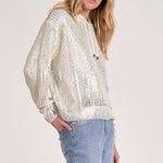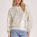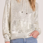 The Elan Metallic Threaded Hoodie in White redefines casual elegance with thoughtful design details. This pullover silhouette features delicate metallic accents woven throughout the fabric, imparting a subtle glow that distinguishes this piece from standard basics.