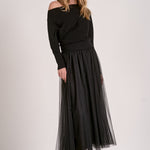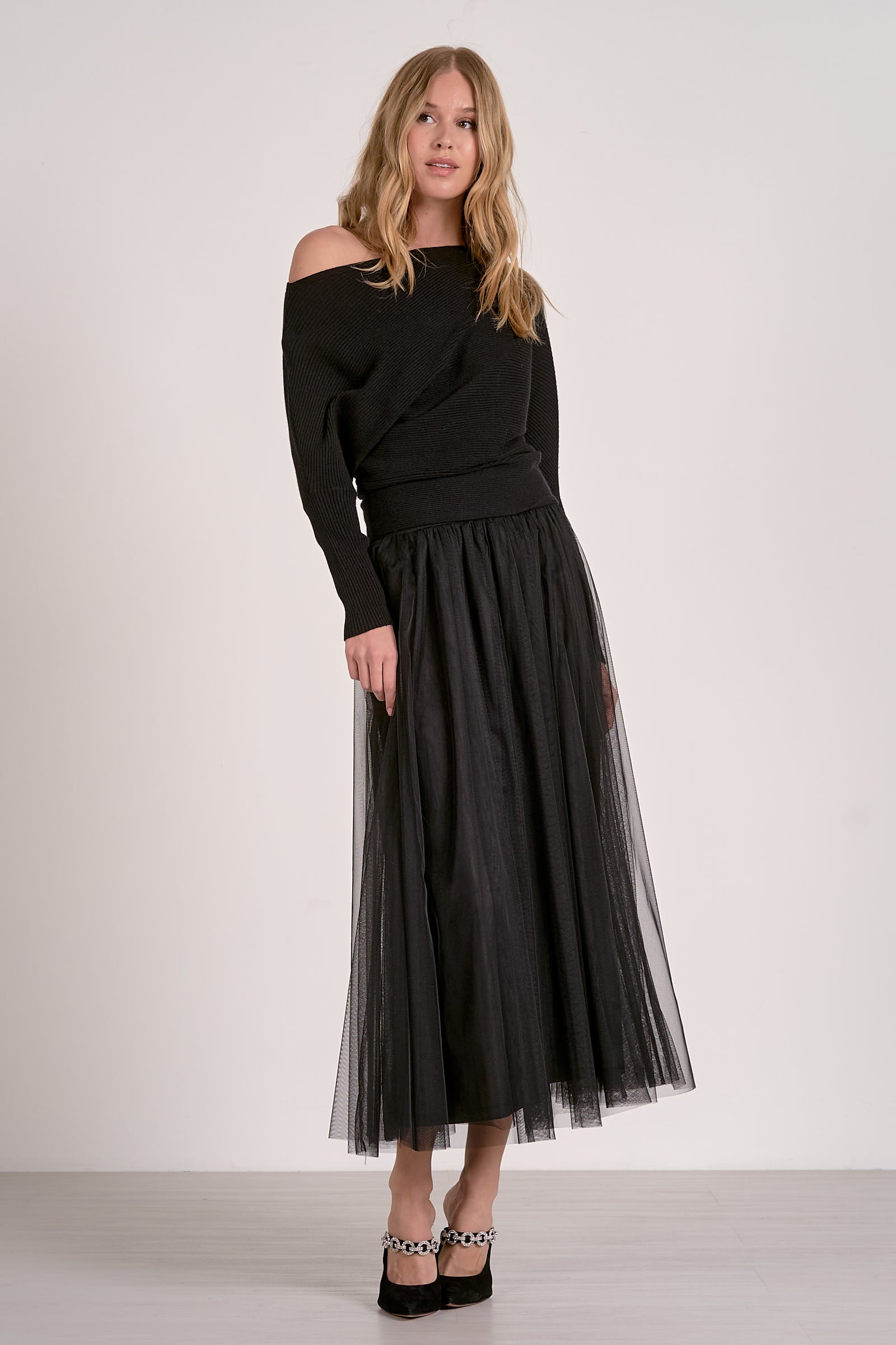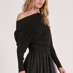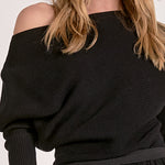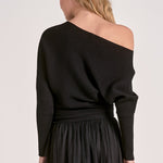 Embrace versatile elegance with this thoughtfully crafted ribbed knit sweater. The asymmetrical off-the-shoulder neckline offers a modern silhouette while remaining convertible—wear it draped across one shoulder or styled as a classic boatneck for refined versatility. A structured banded waist defines your shape, while fitted cuffs provide a polished finish. Perfect for layering or wearing solo, this piece transitions effortlessly from day to evening.