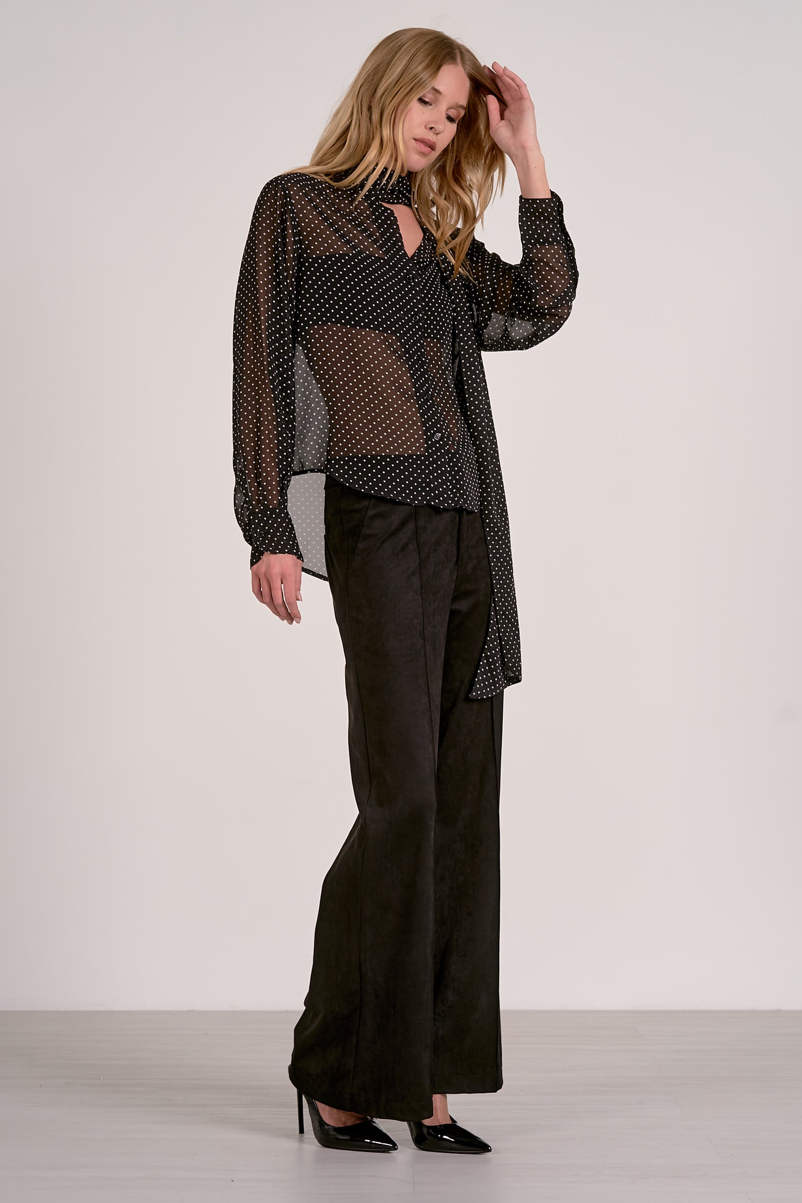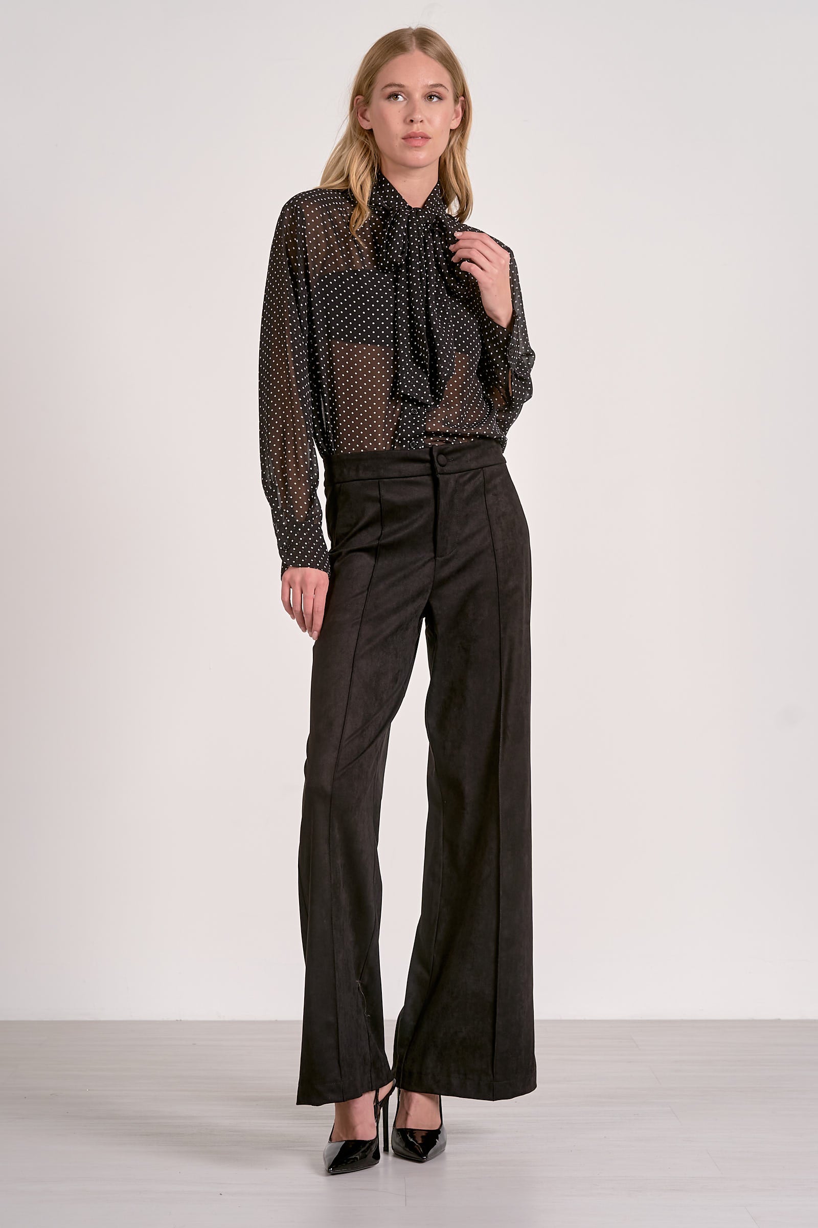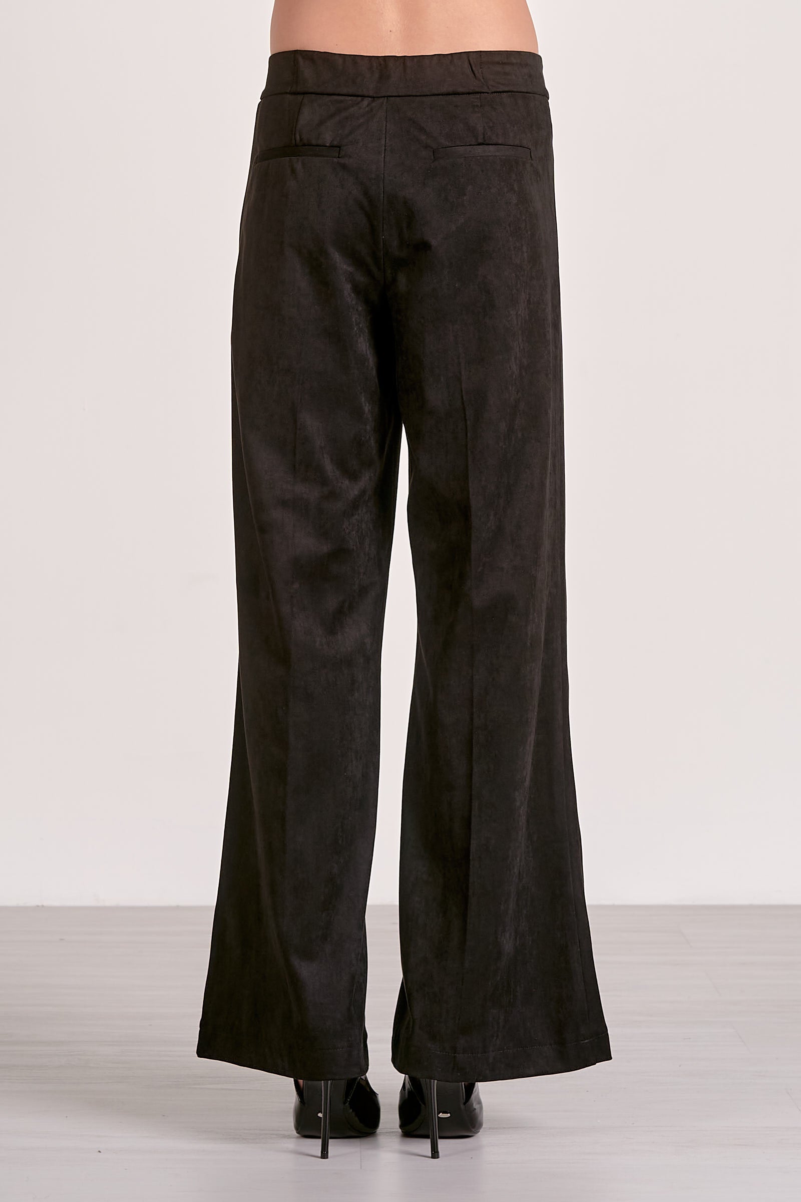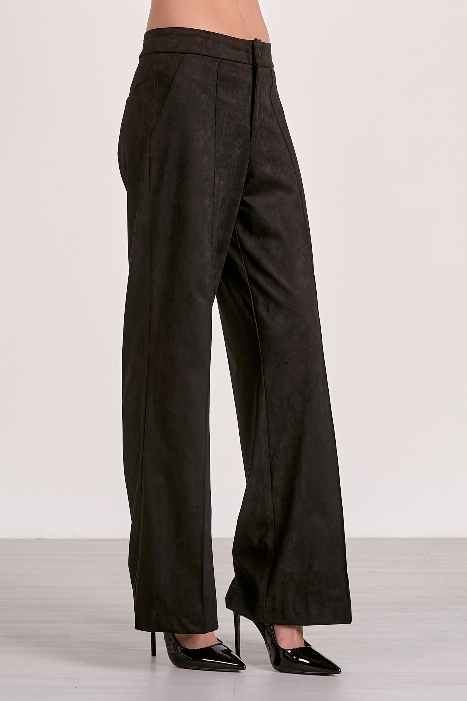 Discover refined elegance with these Elan suede high waist pants in black. Constructed from buttery-soft faux suede, they feature a high waist and wide legs that create a streamlined silhouette to flatter every frame. The luxurious fabric drapes beautifully while maintaining structure, making it ideal for both professional settings and sophisticated evening wear. A wardrobe essential that transcends seasons and trends, these pants embody timeless style with modern sensibility.