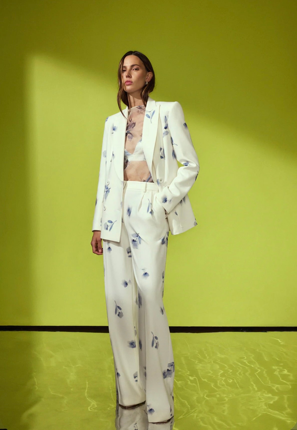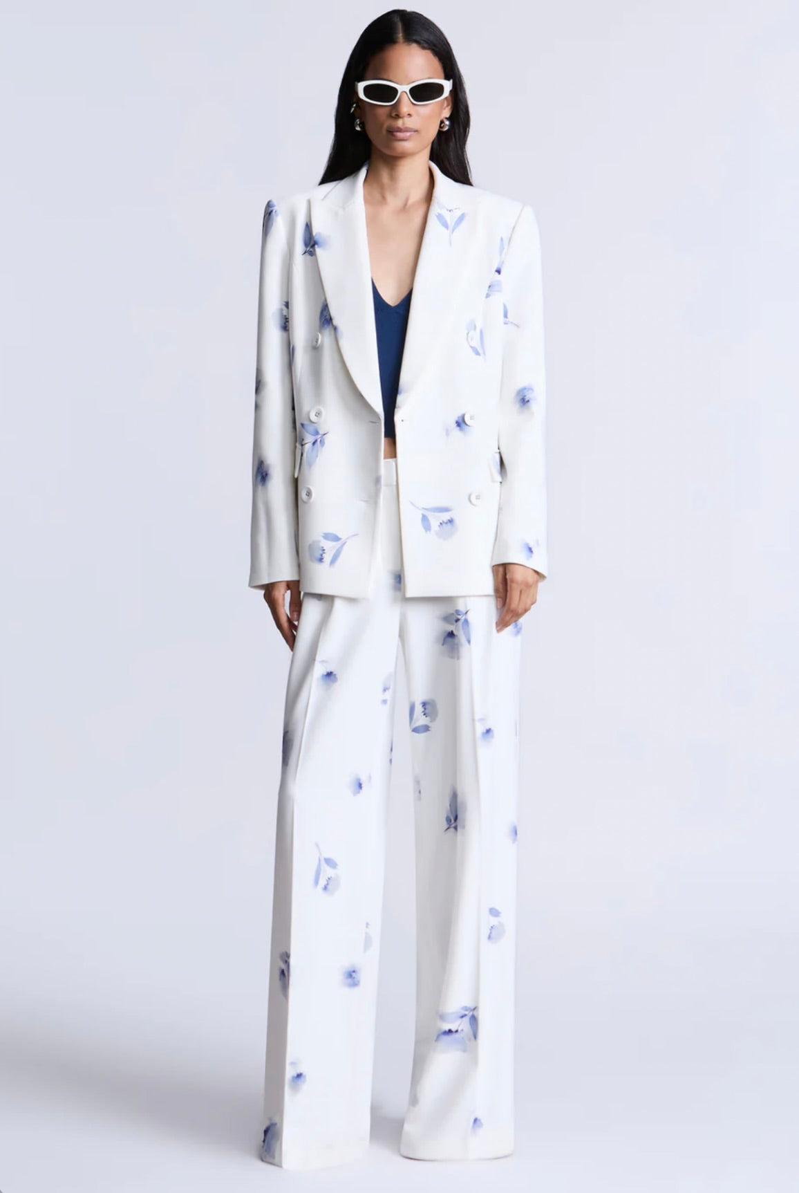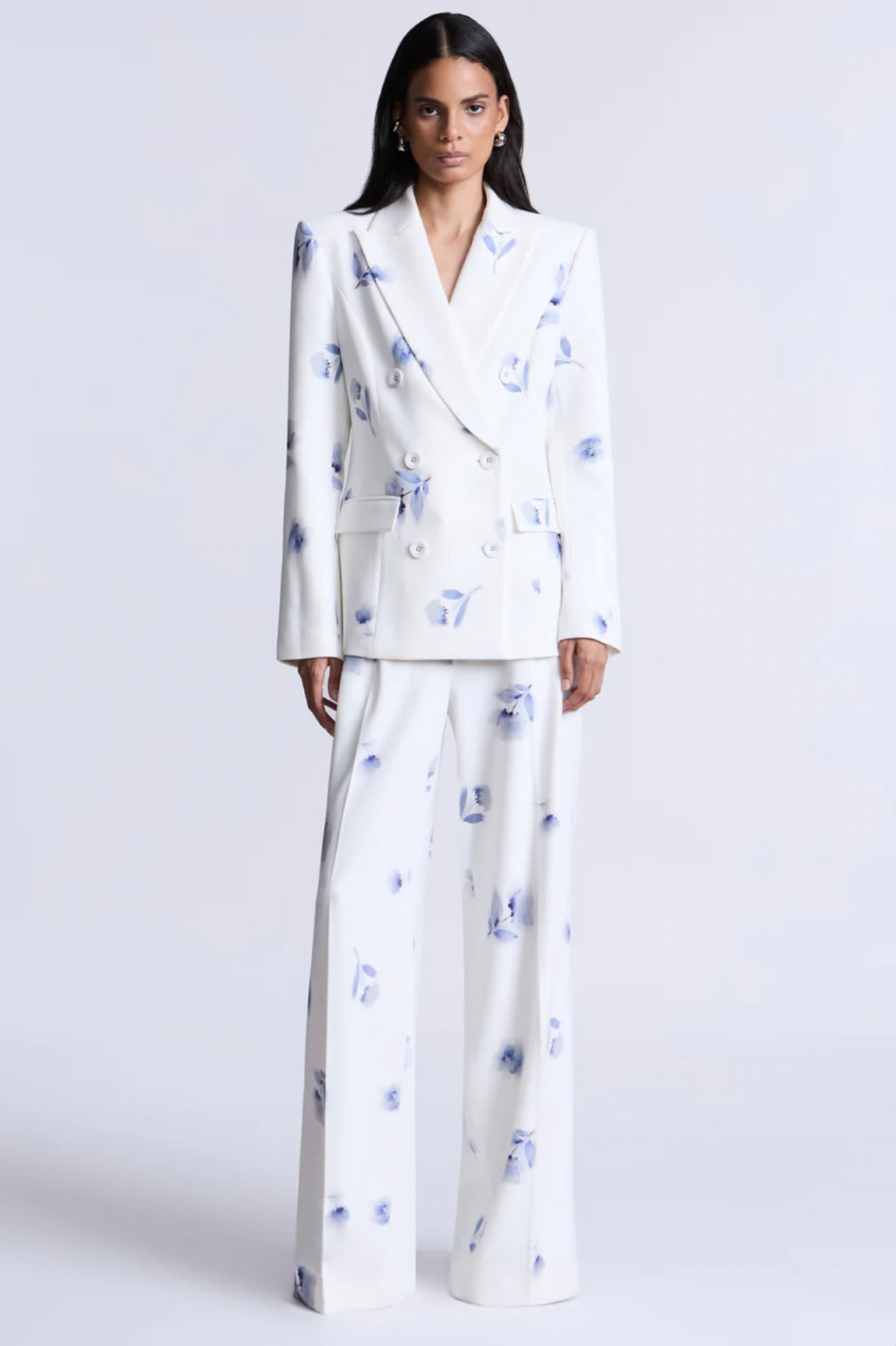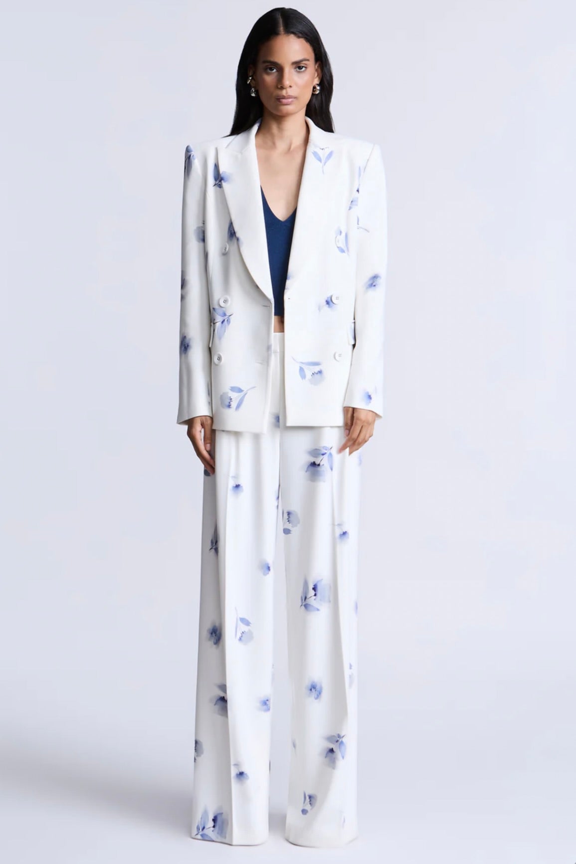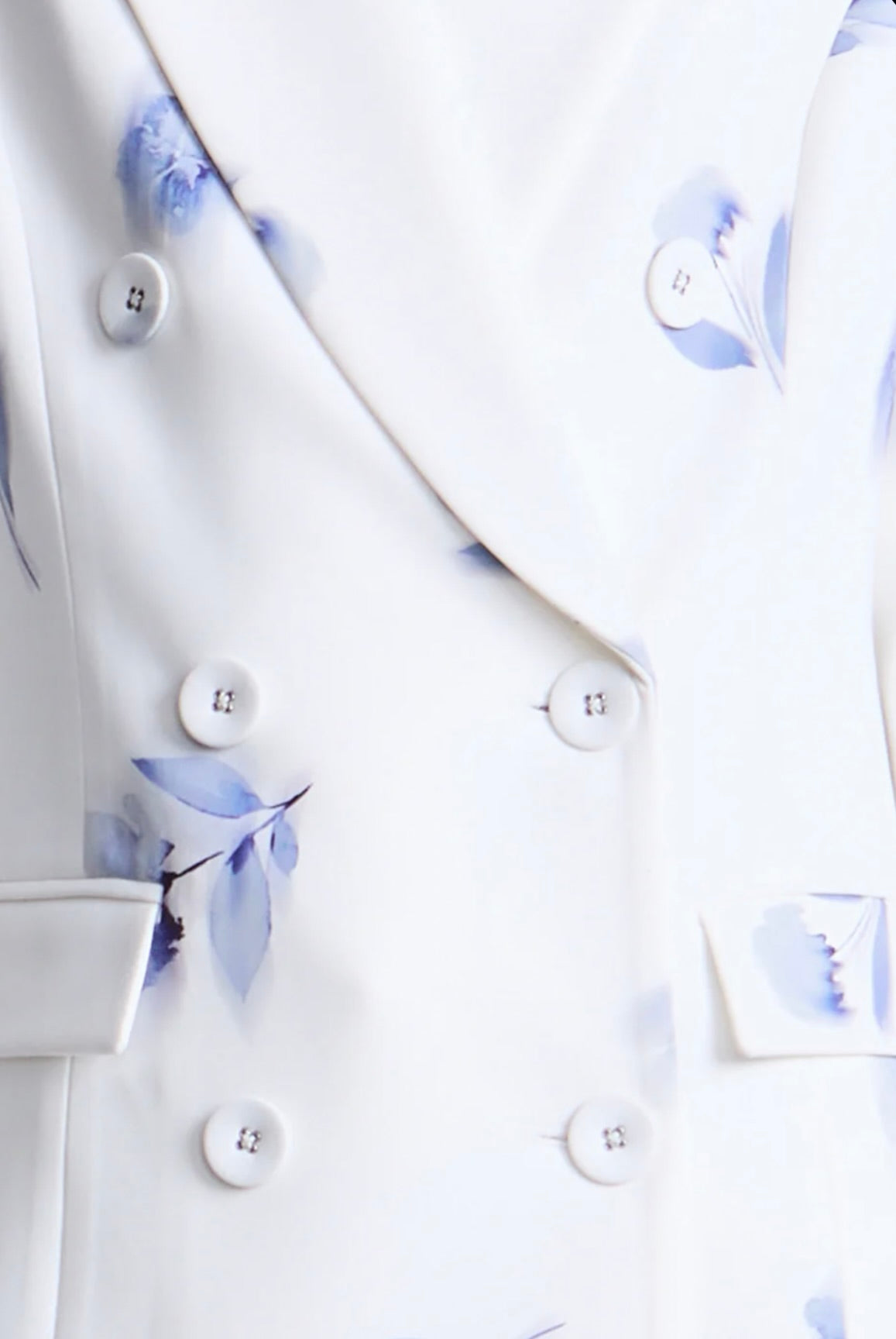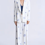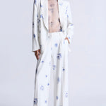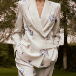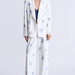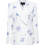This refined white blazer showcases an exquisite soft blue floral print, tailored with architectural precision. Bold shoulders, a double-breasted front, and crisp lapels create a polished silhouette that exudes confidence. An essential investment piece for those who appreciate timeless elegance—whether navigating gallery exhibitions, attending sophisticated dinners, or curating an elevated everyday aesthetic.