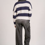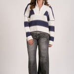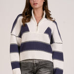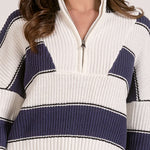 Effortless style meets comfort in the Elan Nielsen Stripe Zip Collar Sweater. This relaxed-fit pullover features a striking navy and white colorblock stripe pattern with a foldover-zip collar and ribbed-knit detailing. Perfect for layering or wearing solo, it's a versatile wardrobe essential that transitions seamlessly from casual weekends to laid-back weekdays.