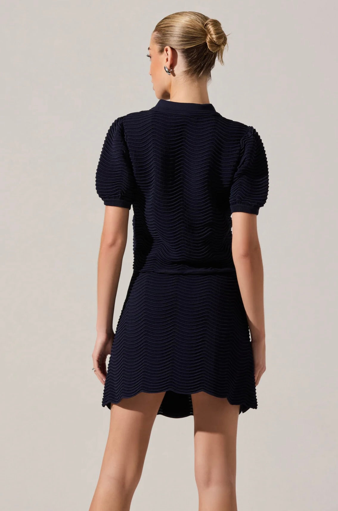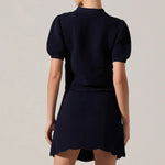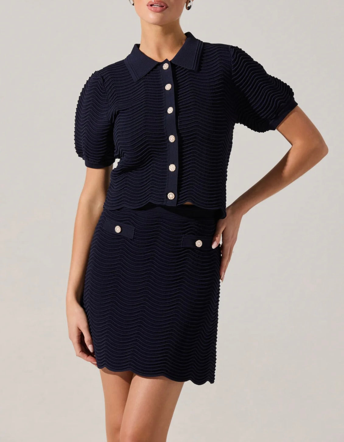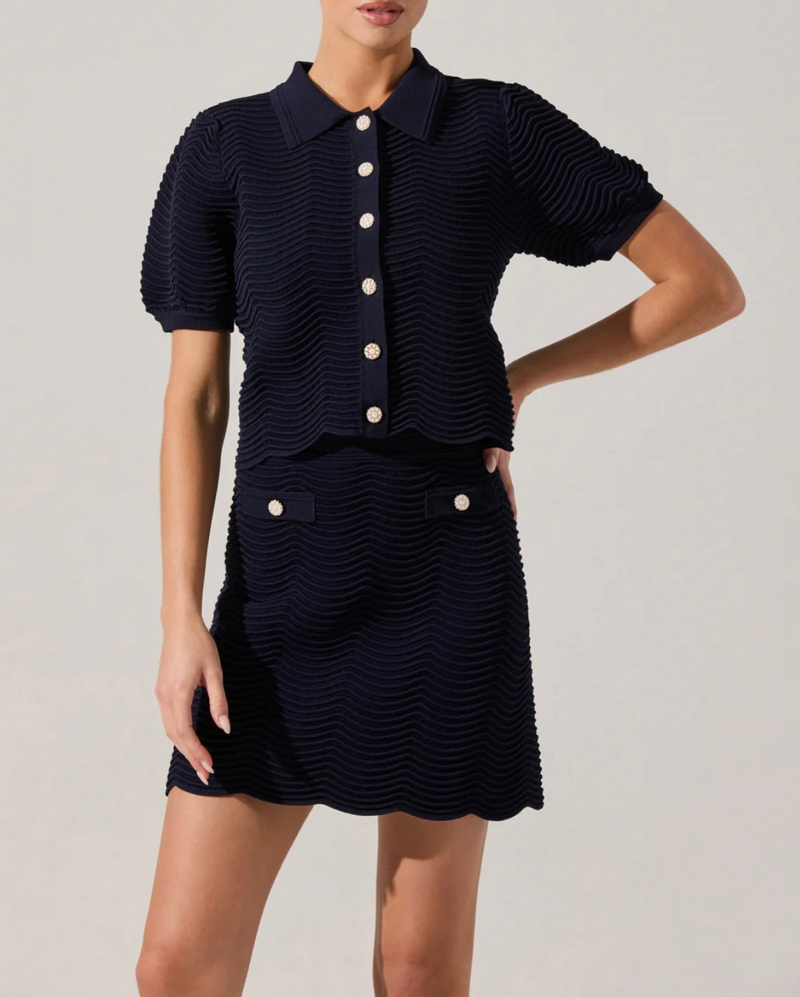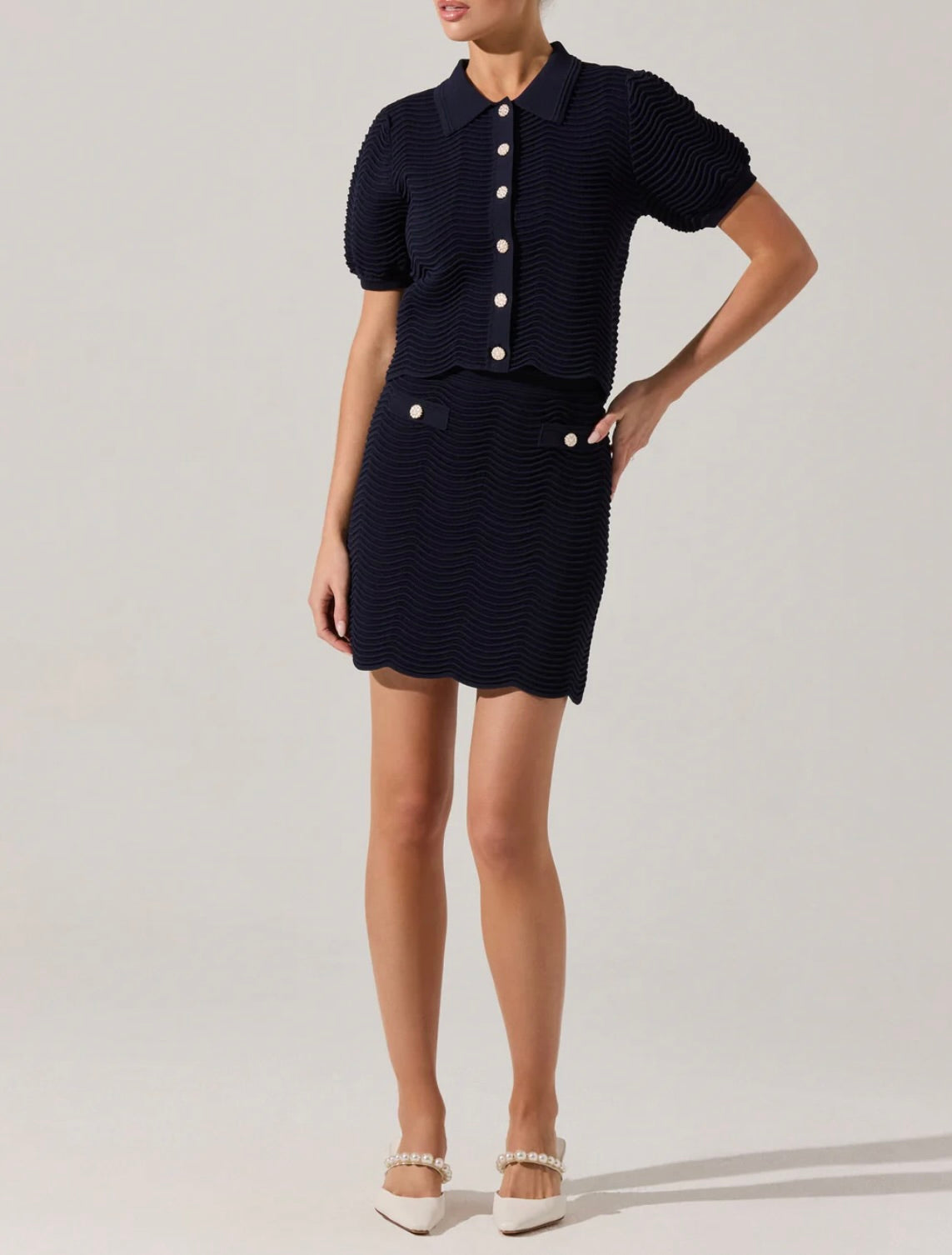 The Perrine Scalloped Short Sleeve Cardigan features a textured, wavy knit fabrication that adds refined depth to its design. Its delicately scalloped edges and elegant short sleeves offer a polished, sophisticated look, making it an ideal layering piece or stand-alone garment for a chic ensemble.