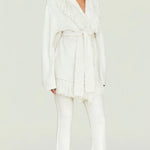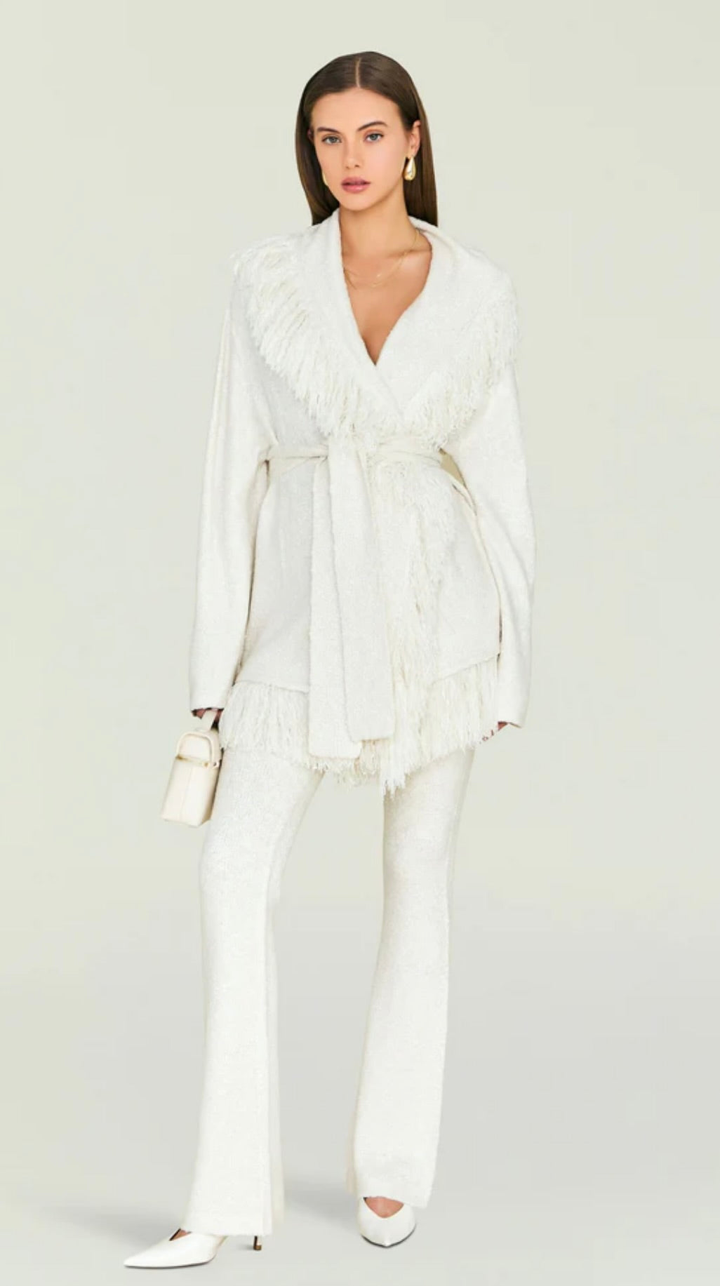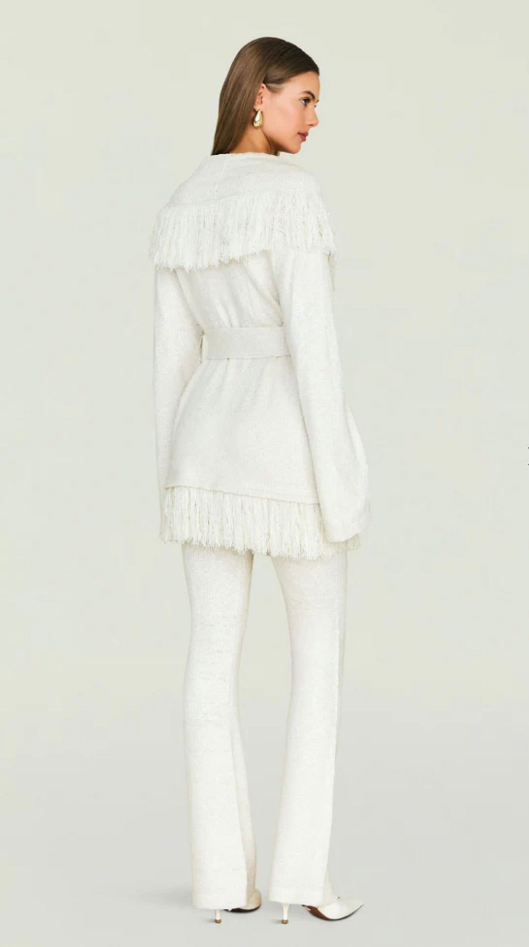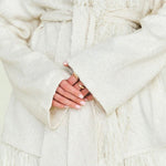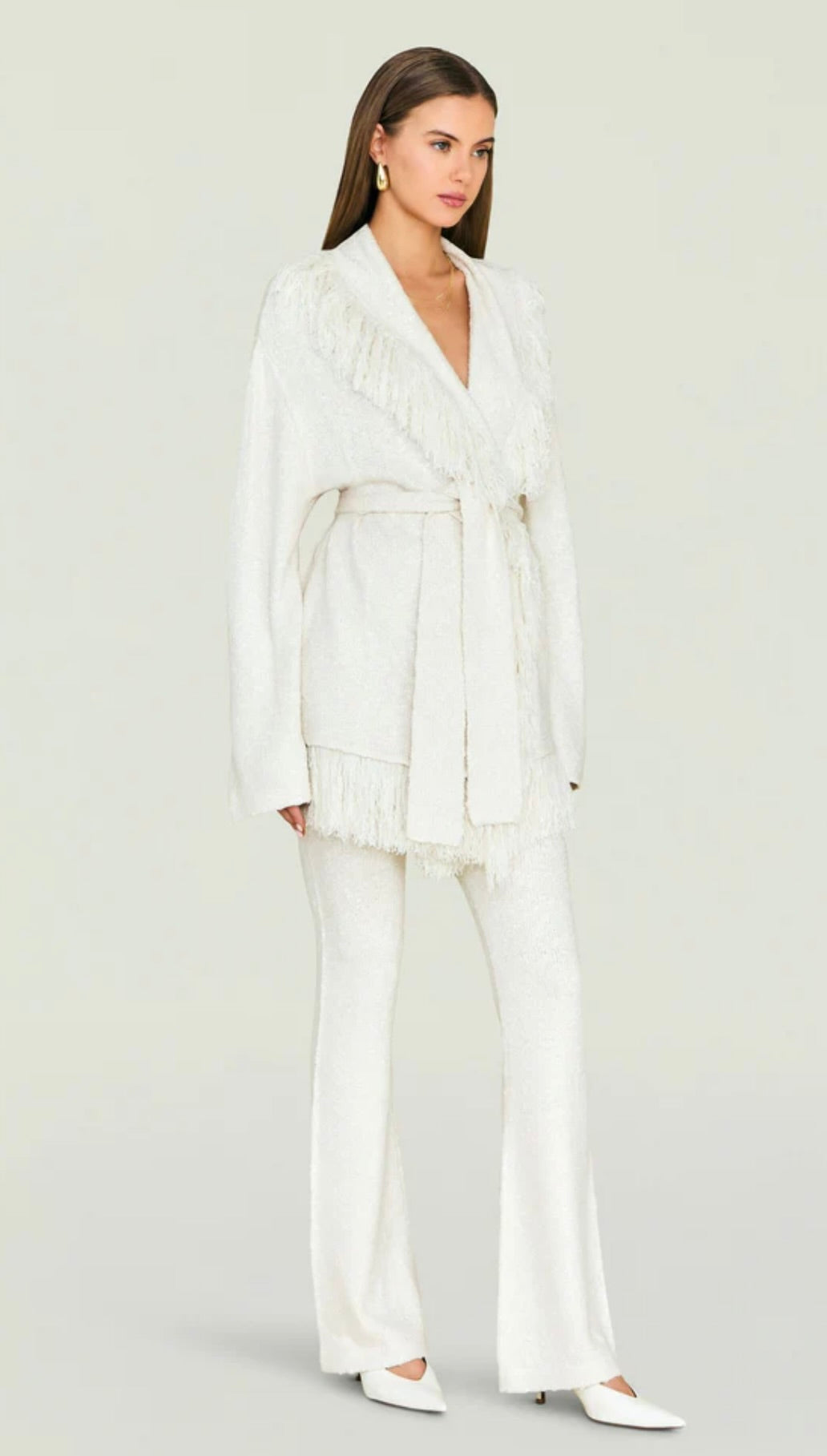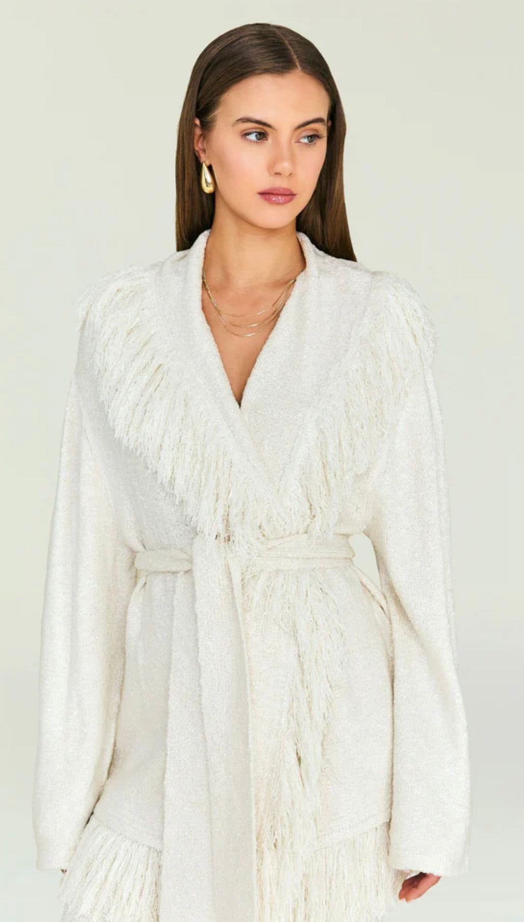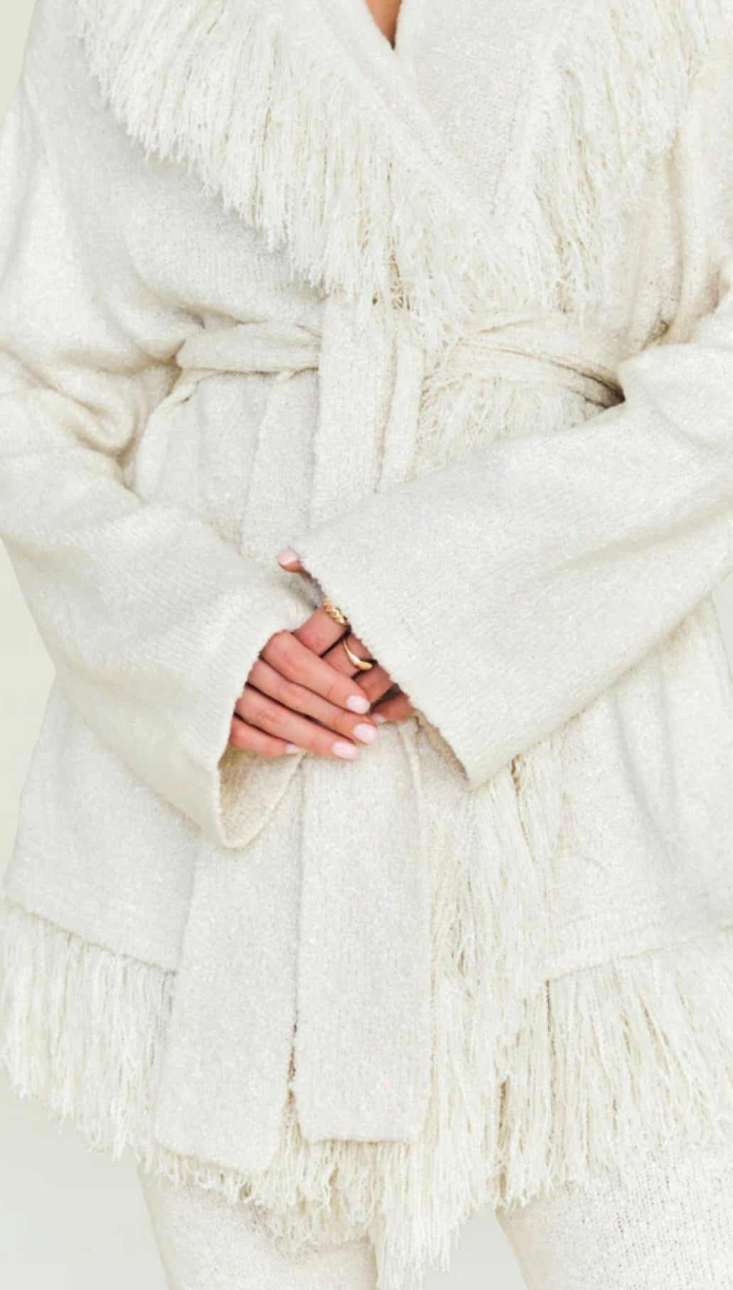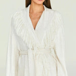 This graceful piece layers effortlessly over dresses, blouses, or lightweight sweaters, offering versatility without compromise. The fringe detailing creates an eye-catching textural element that elevates even the simplest outfits. Perfect for those seeking a statement layer that balances sophistication with subtle personality, this cardigan transitions seamlessly across seasons and occasions.