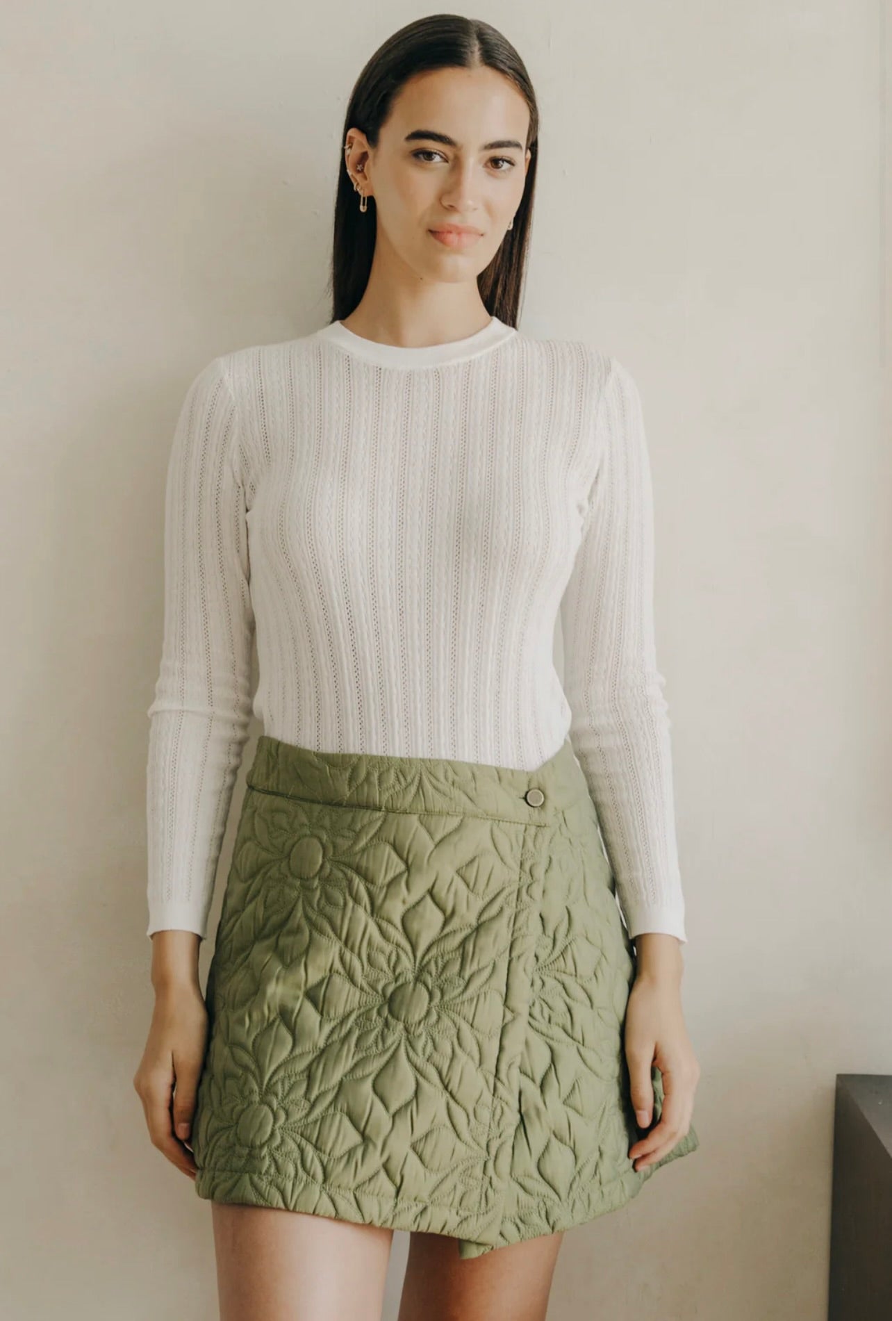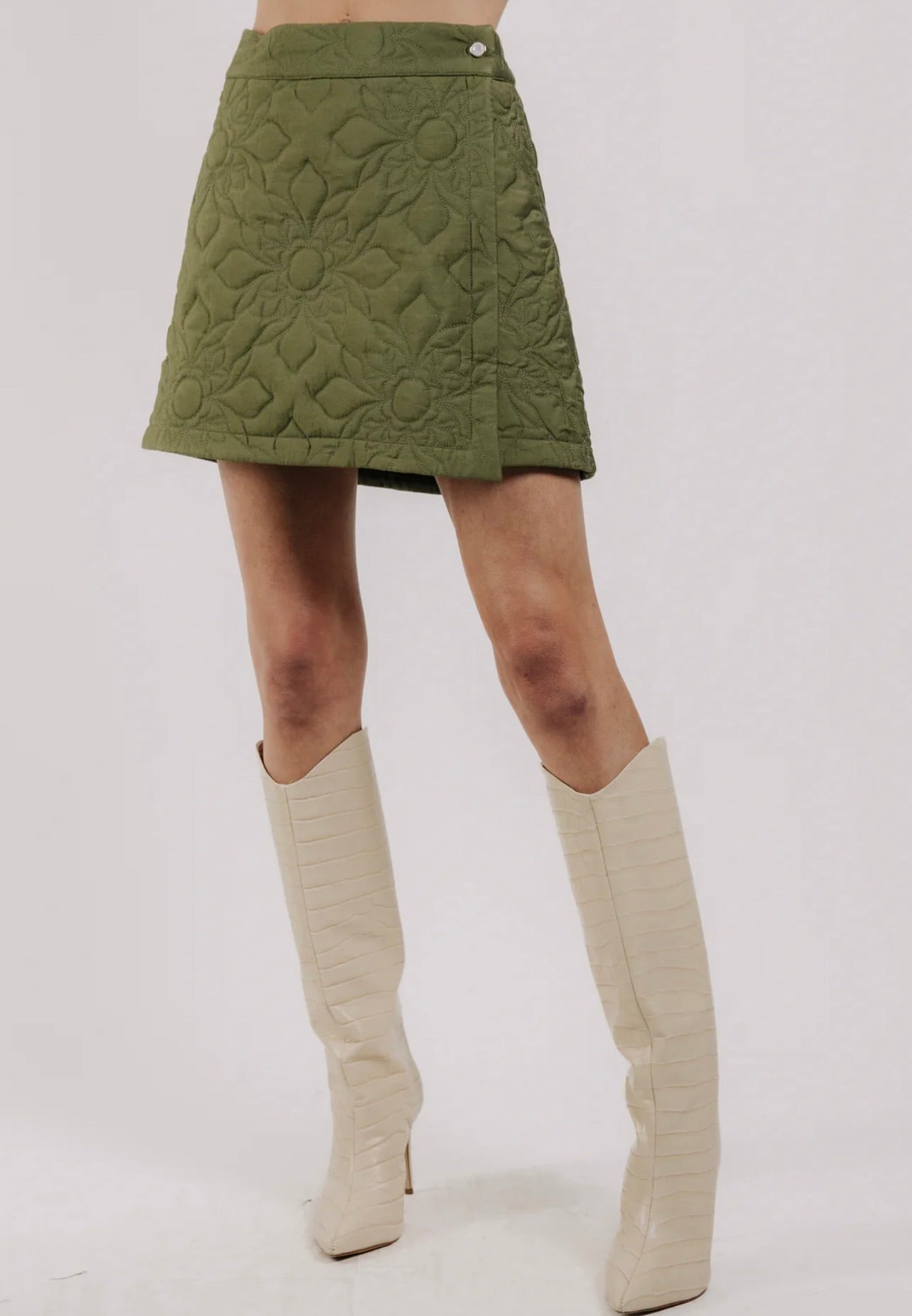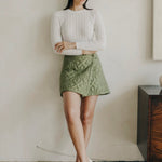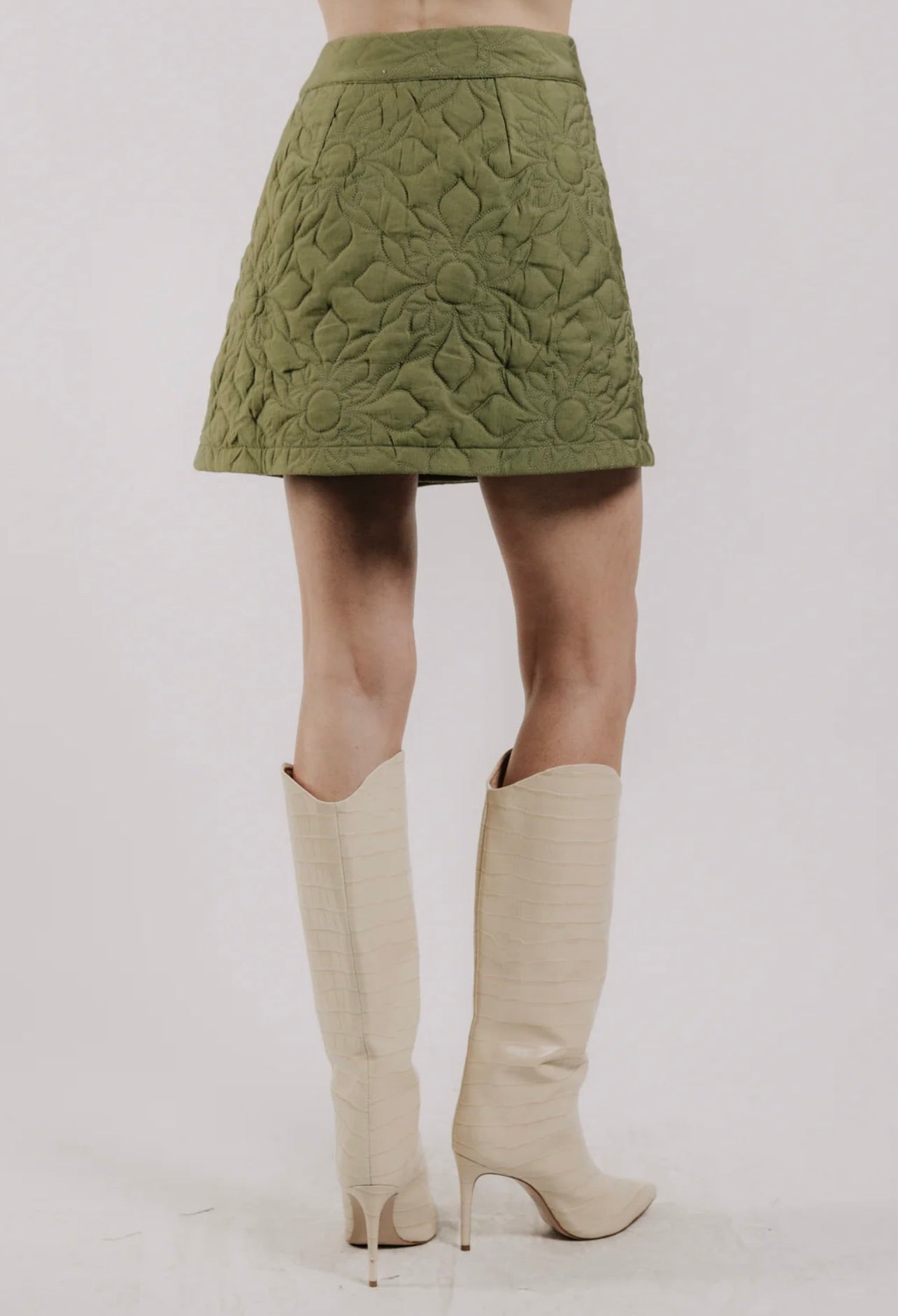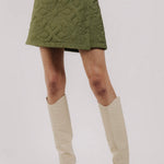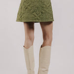 The Love the Label Melanie Quilted Skirt features a soft olive quilted fabric with delicate floral stitching, tailored into a refined A-line silhouette. Its elegant design offers versatility, perfect for wearing alone or paired with the matching Melanie Quilted Jacket to create a polished, coordinated look.