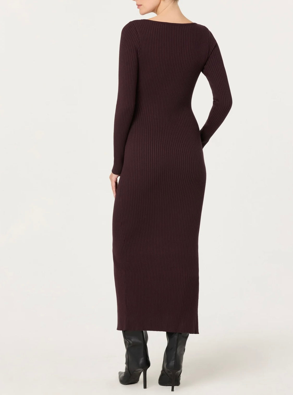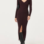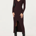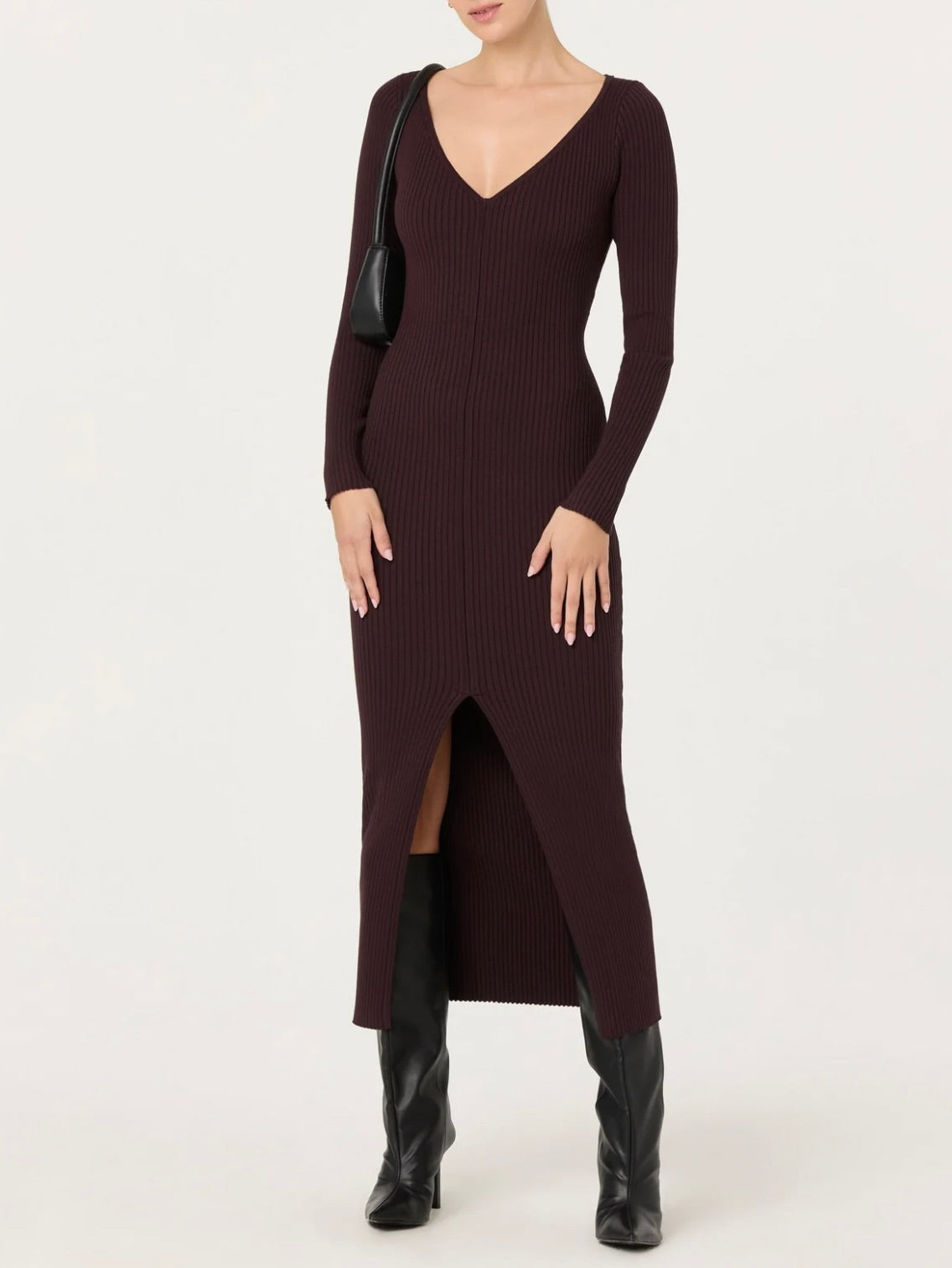 Discover timeless elegance with this luxurious maxi sweater dress, crafted to complement your natural curves. The plunging V-neckline and sumptuous ribbed knit create a polished aesthetic, while the front slit ensures graceful movement and contemporary style. Seamlessly transitioning from boardroom to festive gatherings, this versatile piece delivers refined comfort that lasts from morning through evening.