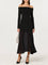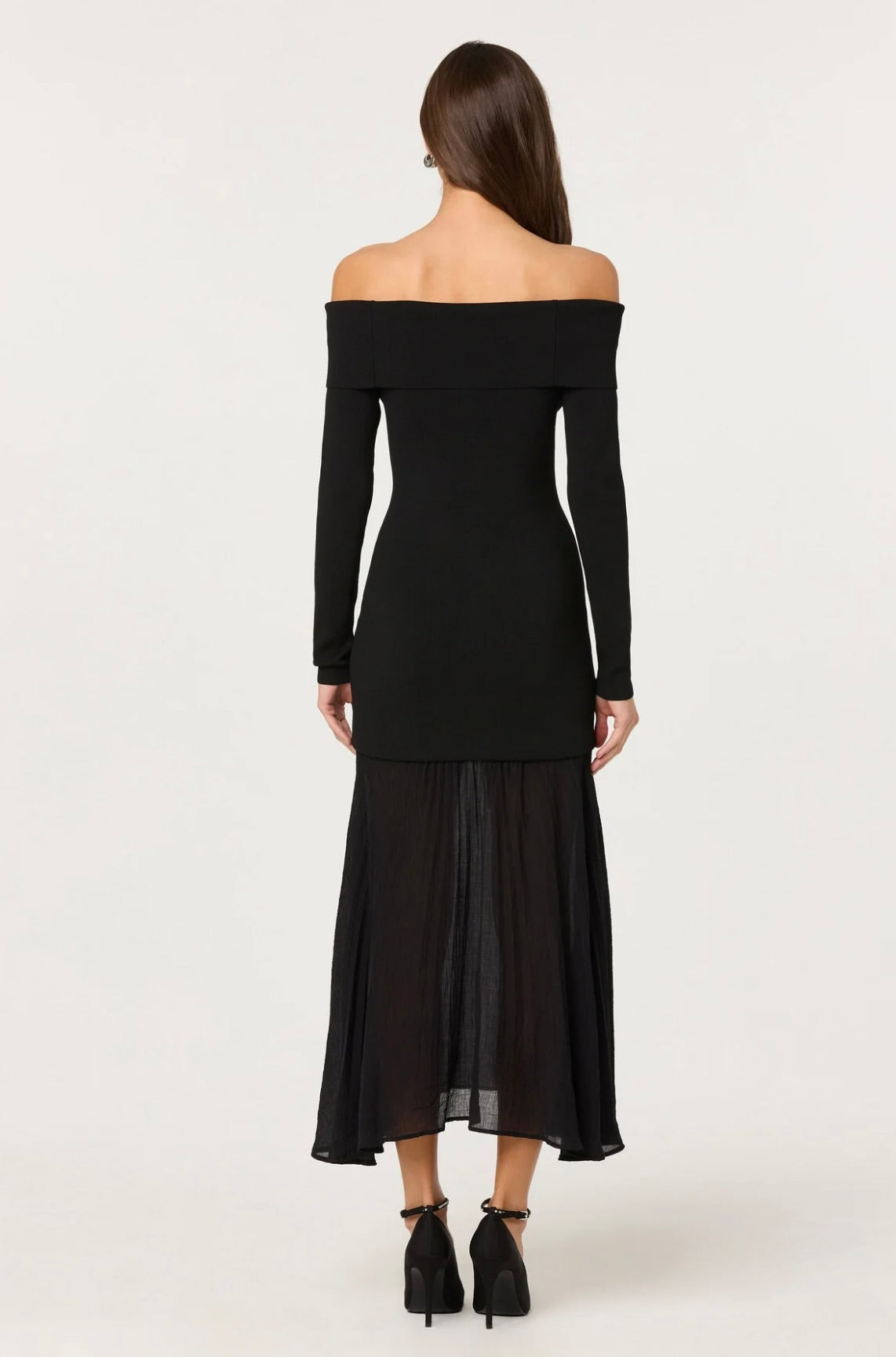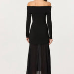 Effortlessly sophisticated, this off-shoulder maxi dress pairs a luxuriously soft ribbed knit bodice with an ethereal semi-sheer pleated hem. The refined contrast of textures creates an understated elegance perfect for intimate dinners, festive celebrations, or evening occasions.