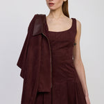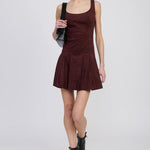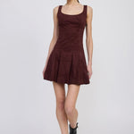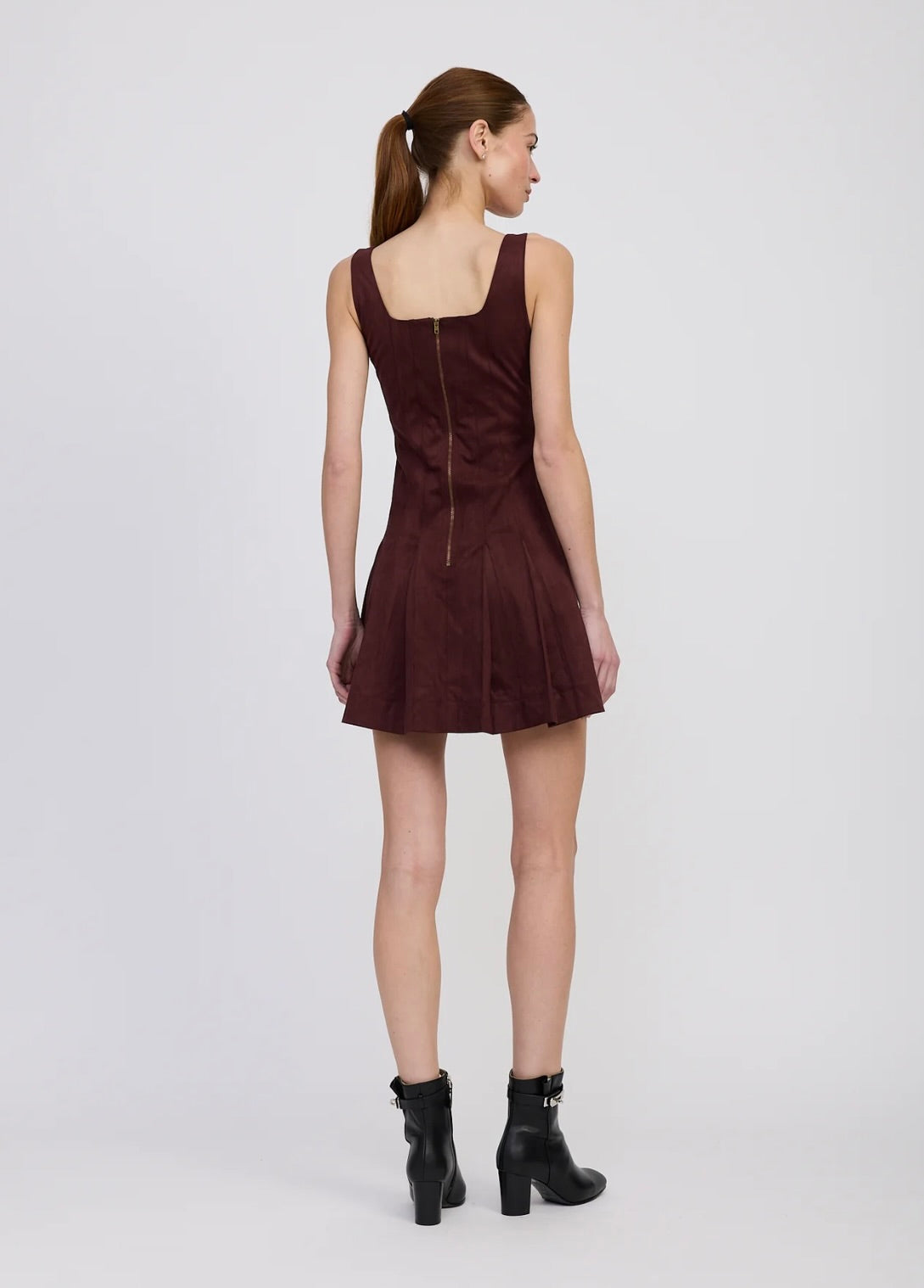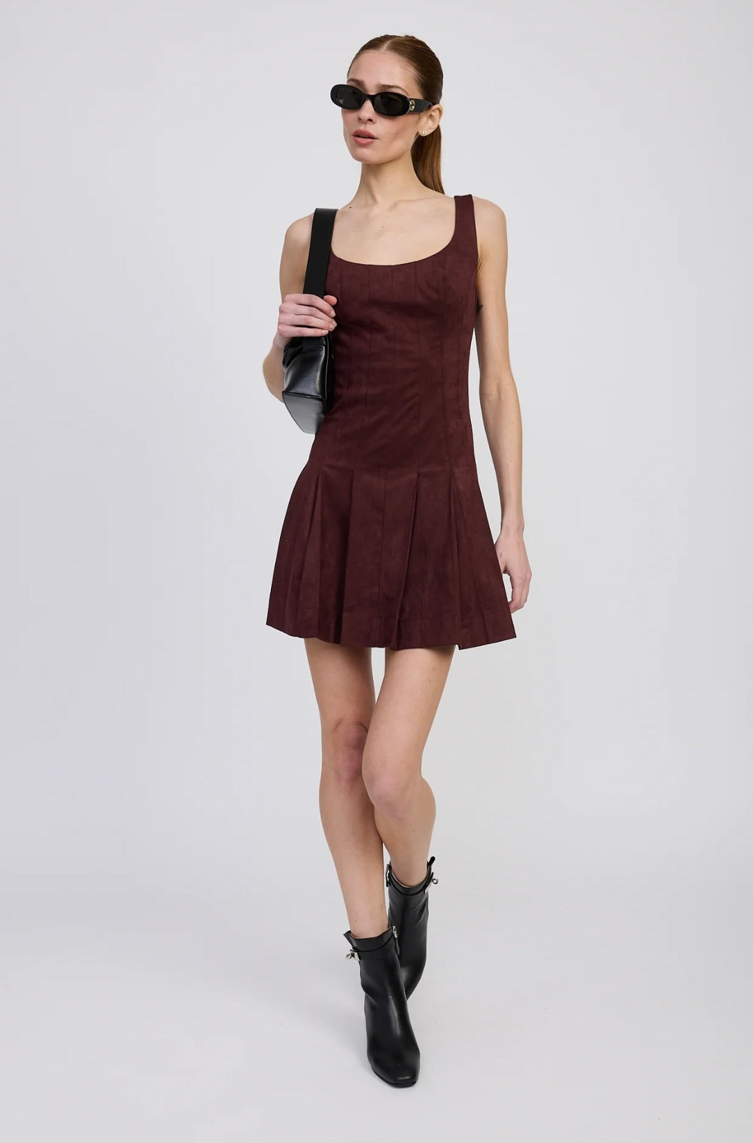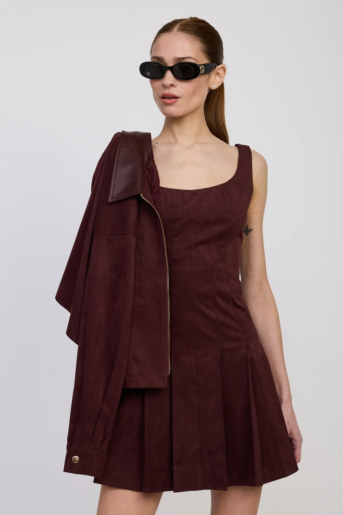 The En Saison Delphine Pleated Mini Dress features a luxurious faux suede fabric with a chic square scoop neckline and precise seam detailing. Its elegant pleated design creates a refined silhouette.