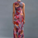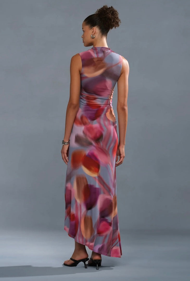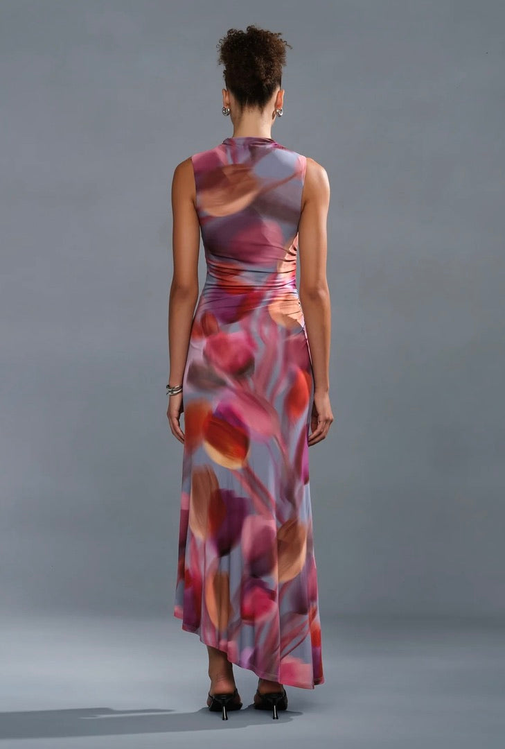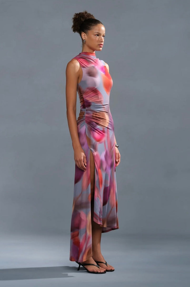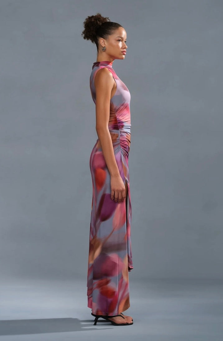 A reimagined silhouette in matte viscose jersey—soft, structured, and alive with a blurred tulip print in dreamy, petal-washed color. Gentle ruching at the waist defines the shape before releasing into an effortless, flowing hem with a high slit that moves with you. From sandals to boots to heels, she transitions seamlessly without a second thought.
