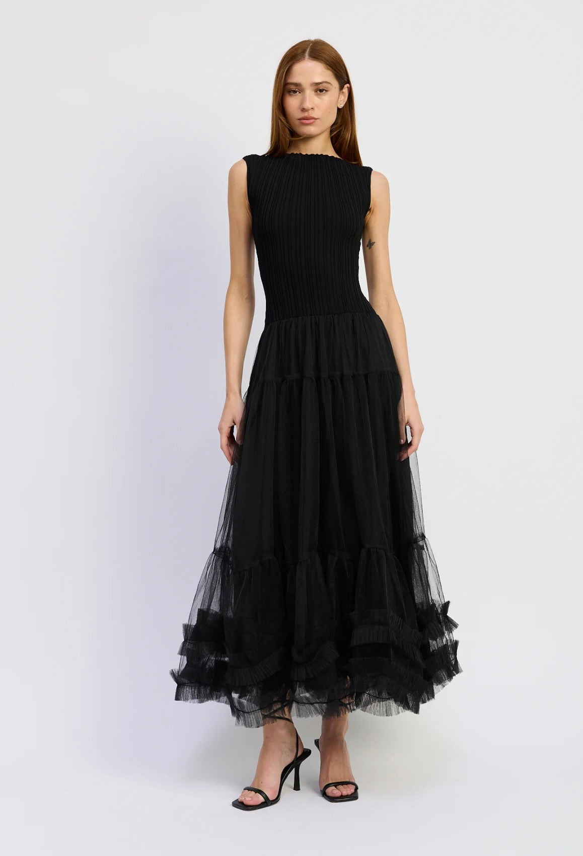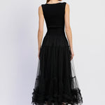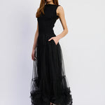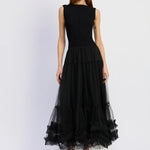 Make a lasting impression with this exquisite maxi dress that masterfully combines structured rib knit with flowing tulle. The thoughtful combination of these contrasting fabrics creates dimension and elegance that transitions seamlessly across seasons and occasions, delivering timeless appeal and undeniable sophistication.