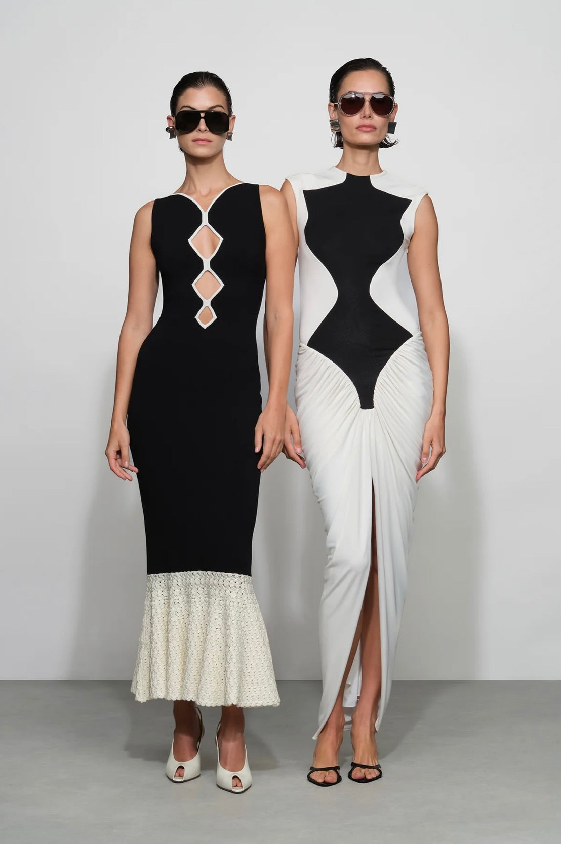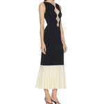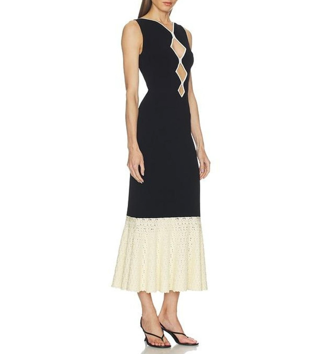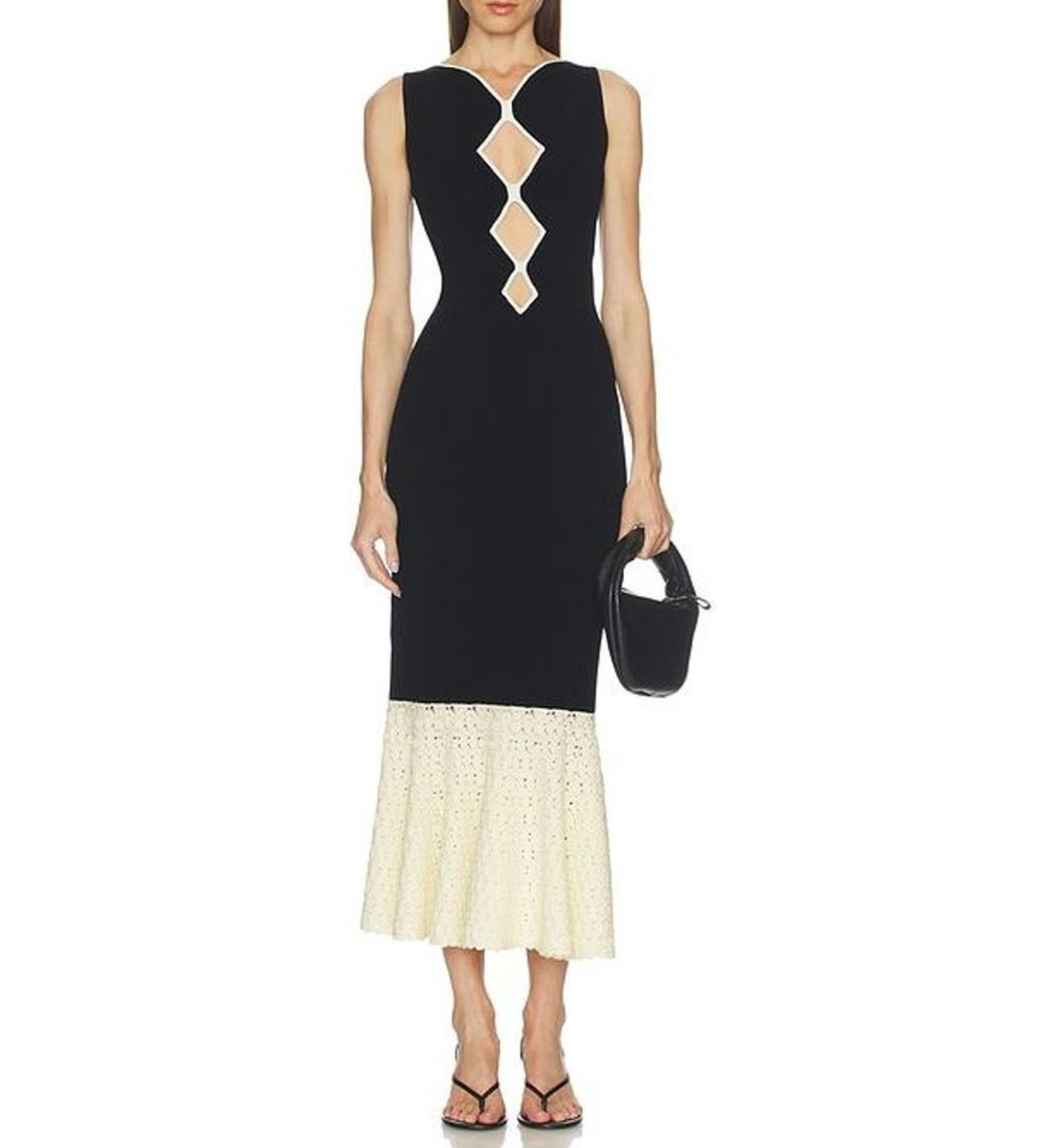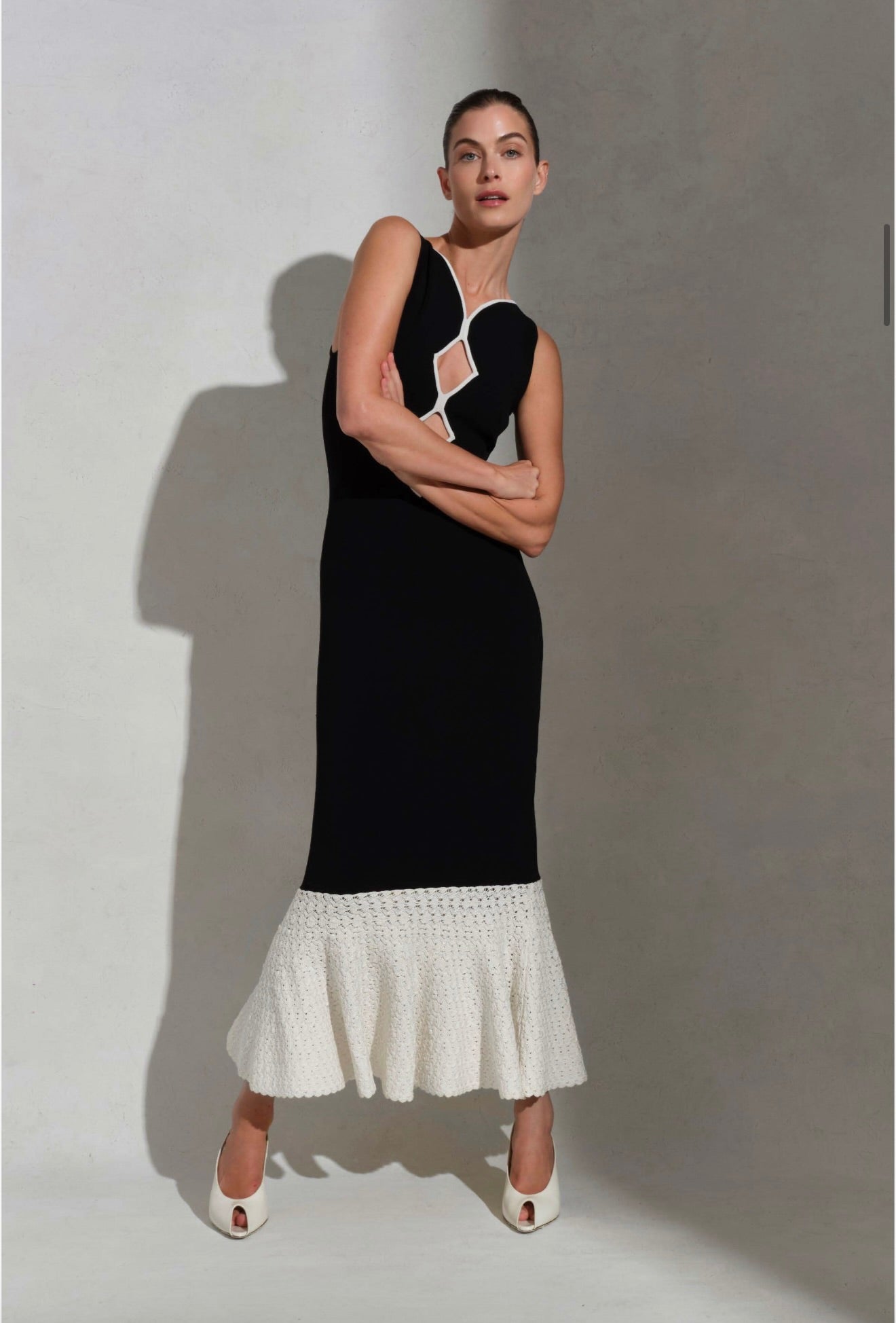 Crafted from substantial crepe fabric, this midi dress features an elegant crochet knit hem and strategic cut-out details for modern appeal. The structured weave pairs beautifully with delicate knitwear accents, creating visual interest while maintaining sophistication. A versatile piece that transitions effortlessly from day to evening.