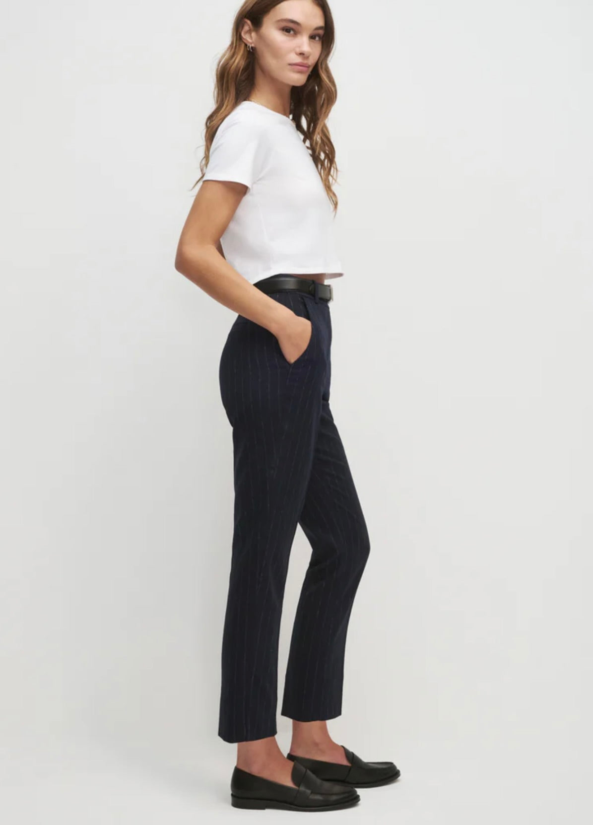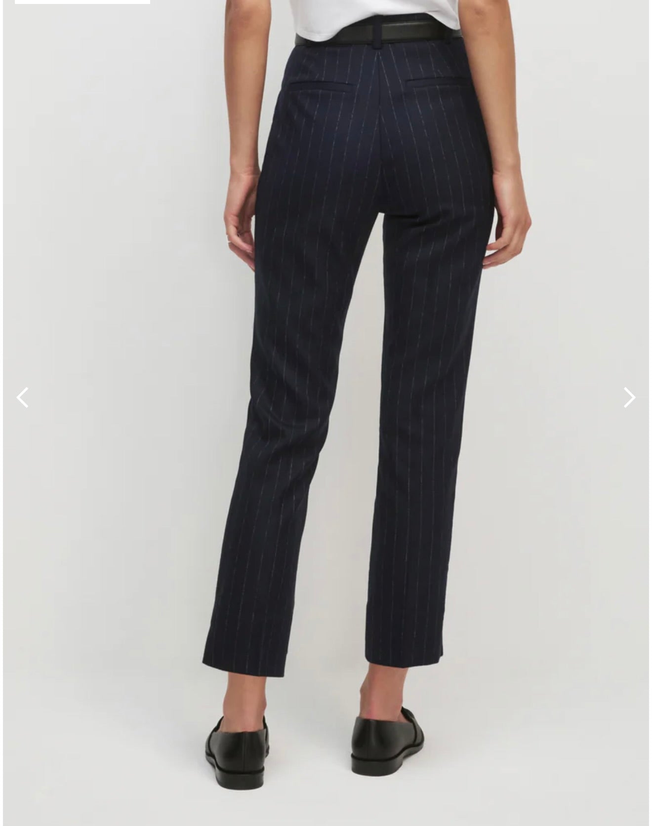 The Favorite Cigarette Pant is a timeless essential crafted from refined navy pinstripe structured suiting fabric. Its tailored, slim silhouette delivers a polished, sophisticated look that transitions seamlessly from office to evening. A wardrobe foundation piece that pairs beautifully with the Busy Woman Jacket for a coordinated suiting ensemble or with the Favorite Organic Tee for a more casual look.