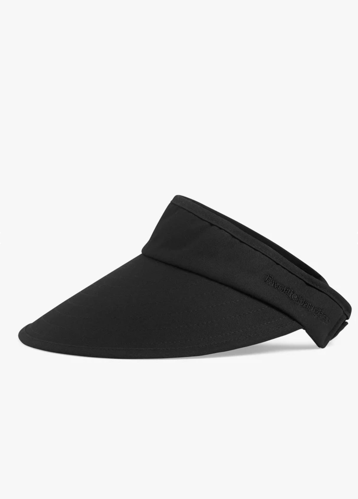 Catch some rays without the full-hat feel. This sleek black visor keeps the sun at bay while the embroidered Favorite Daughter logo adds a touch of personality to your everyday look. Perfect for those moments when you want style, comfort, and a hint of attitude—all rolled into one lightweight essential.
