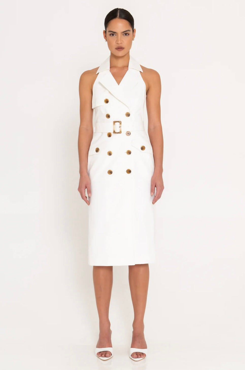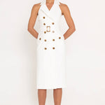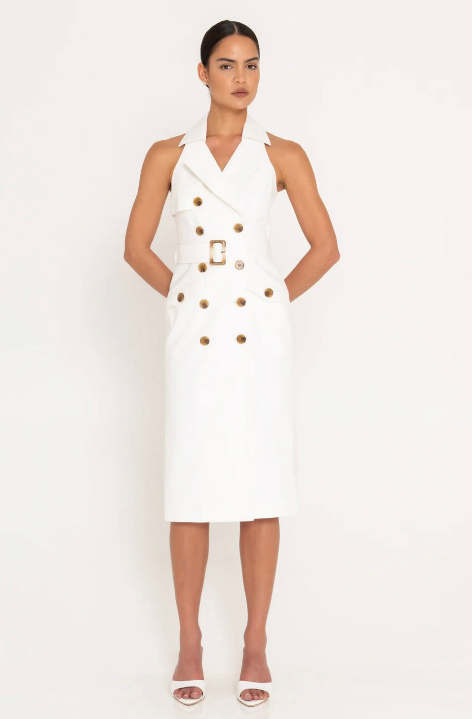 Crafted from premium gabardine cotton, the Milano Dress embodies understated sophistication. Its sleeveless halter design pairs beautifully with a sharp double-breasted front, anchored by distinctive tortoiseshell buttons. A structured waist belt defines your silhouette while the midi length creates an effortlessly polished look—perfect for elevating your everyday wardrobe with timeless style.