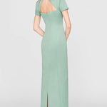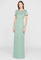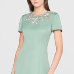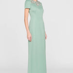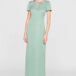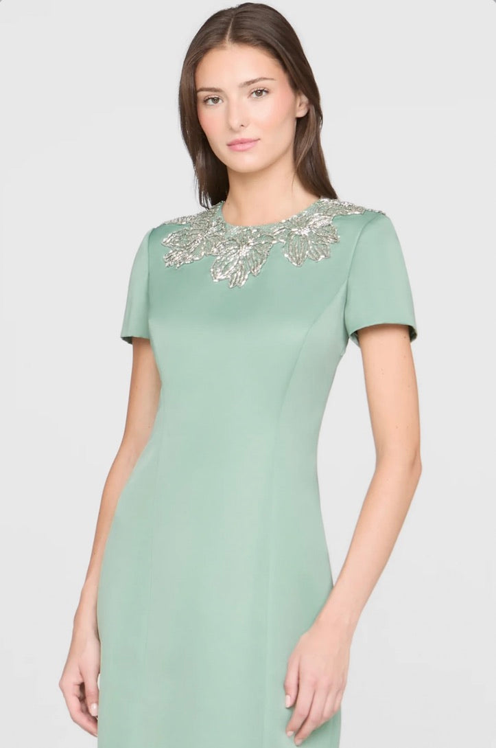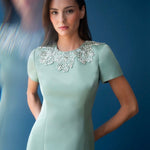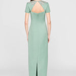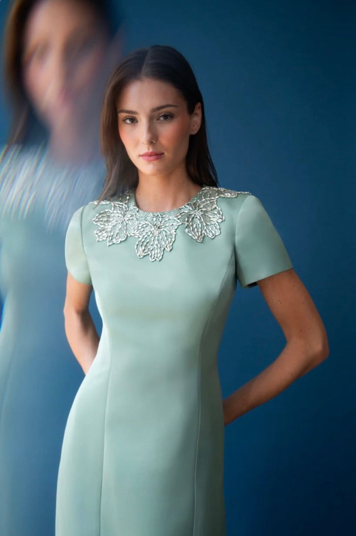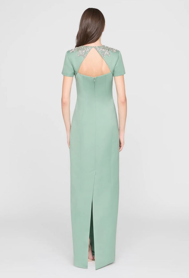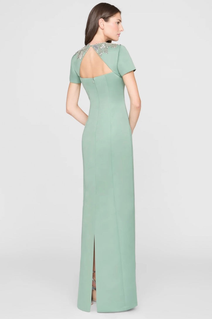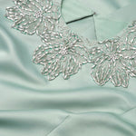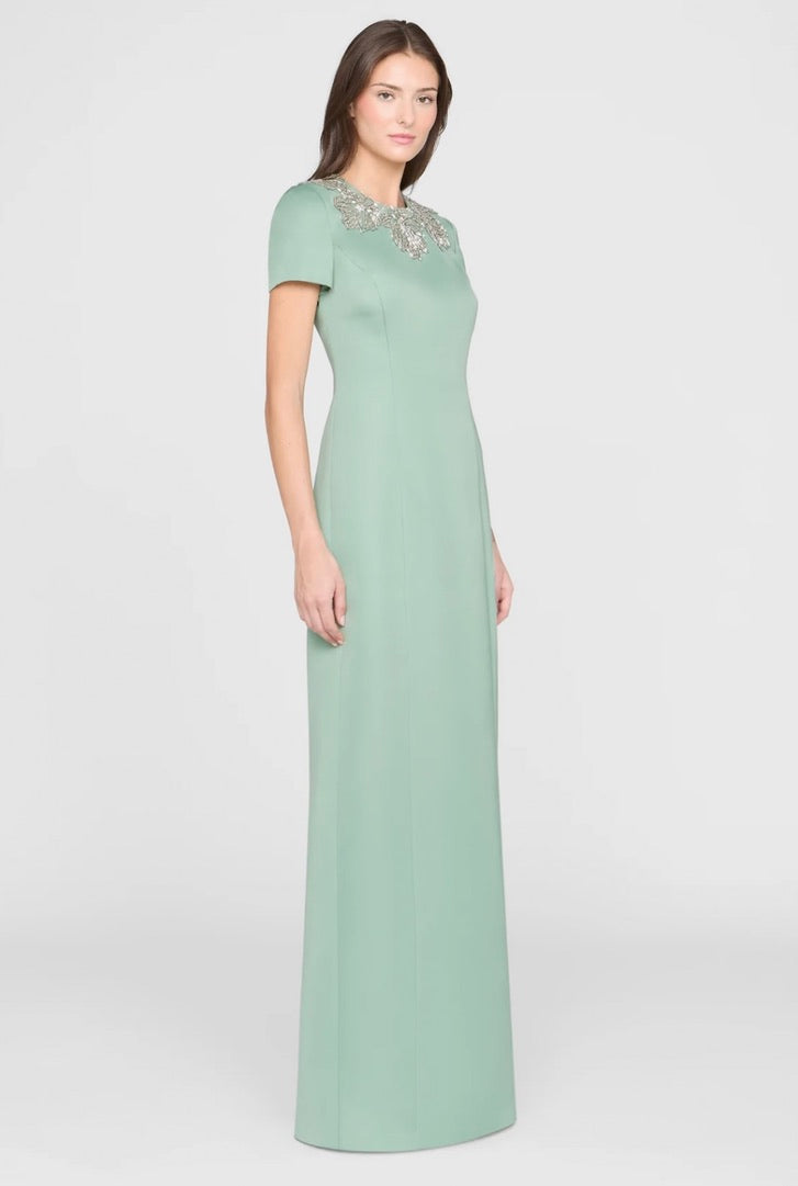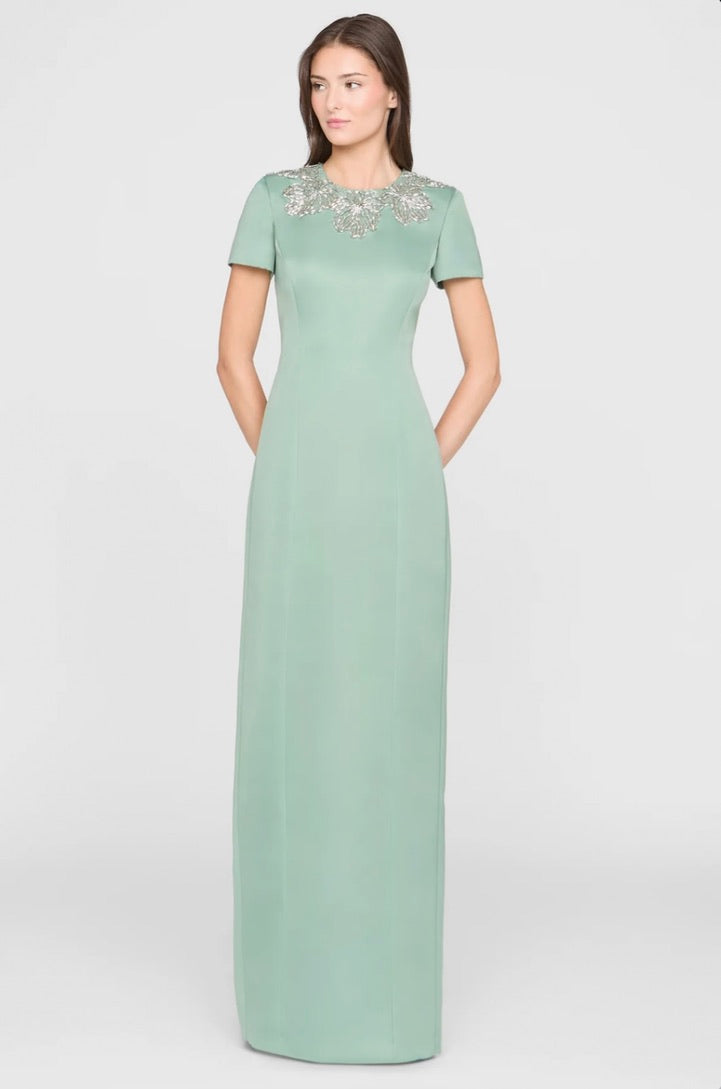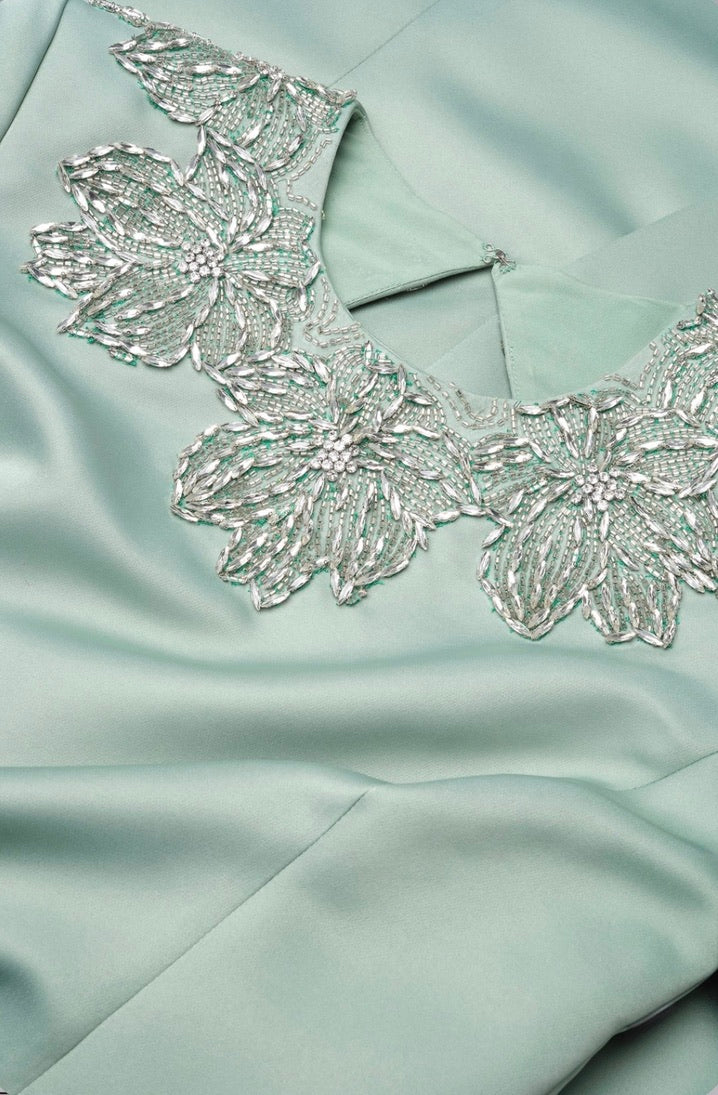 This sleek duchess satin gown in a fresh hue carries a clean, subtly luminous finish. Hand-embroidered floral beading frames the neckline like fine jewelry, while a modern back detail adds an unexpected edge. A stunning choice for black-tie weddings and formal celebrations.
