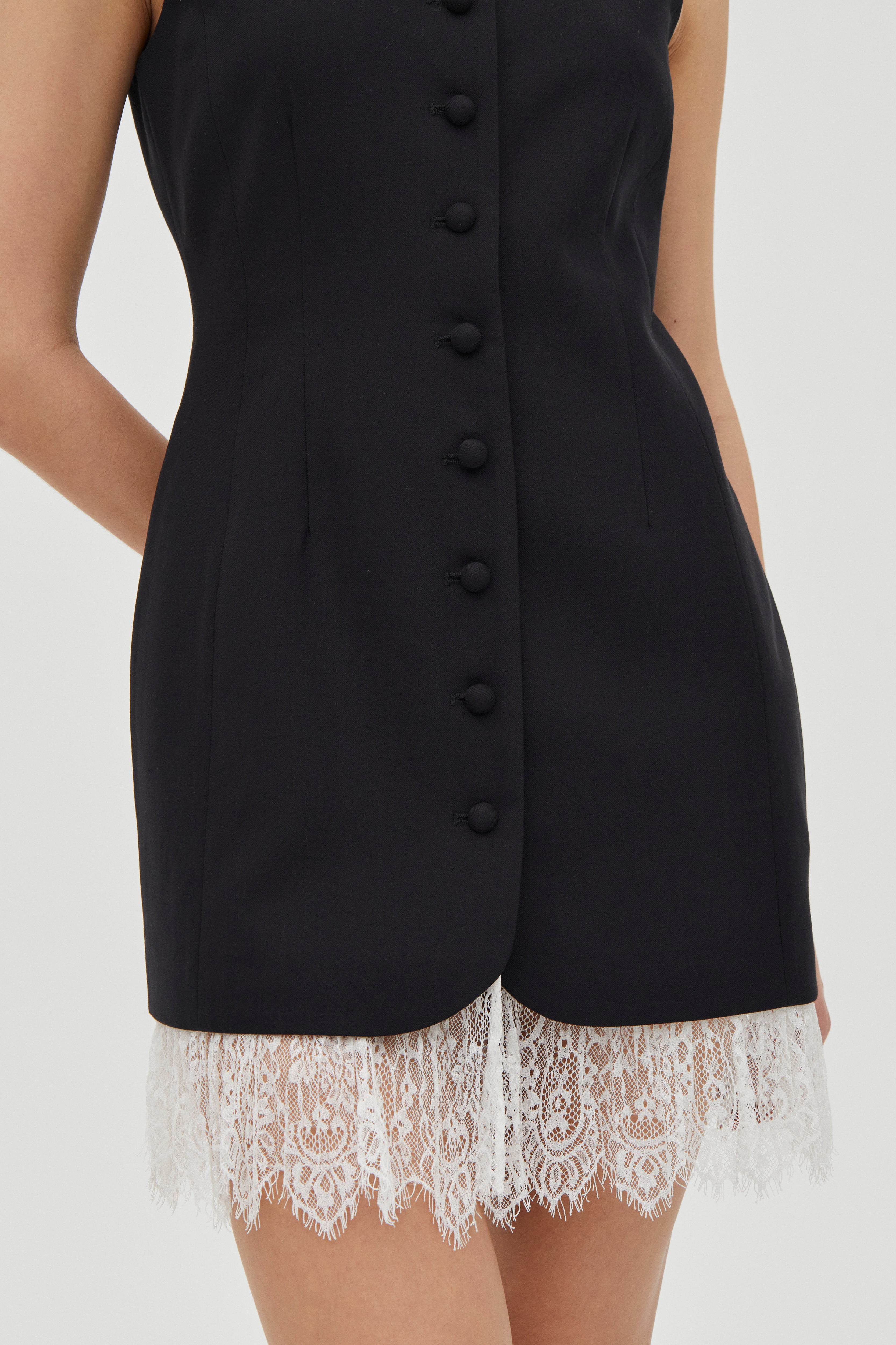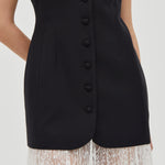 The Nocturne Lace Trim Mini reimagines modern elegance with understated sophistication. A graceful round neckline and precision tailoring create a flattering silhouette, while self-covered button closures add refined detail. The standout feature—a delicate pleated lace trim hem—brings an unexpected softness to this contemporary piece, balancing structure with feminine charm.