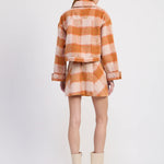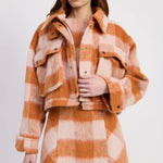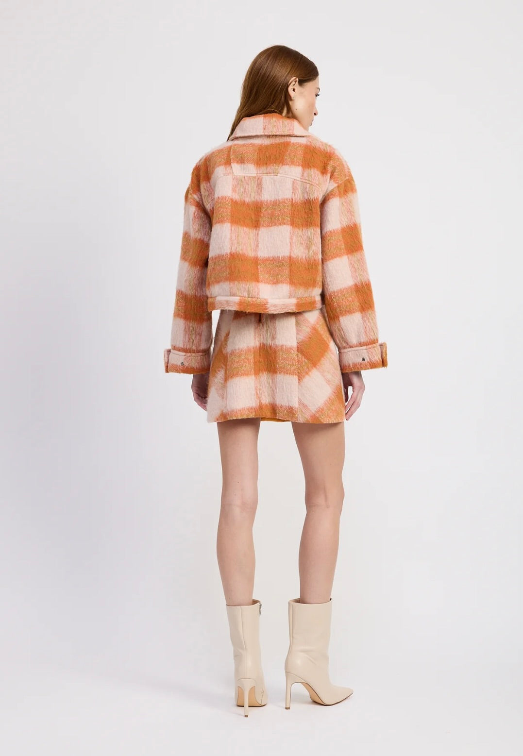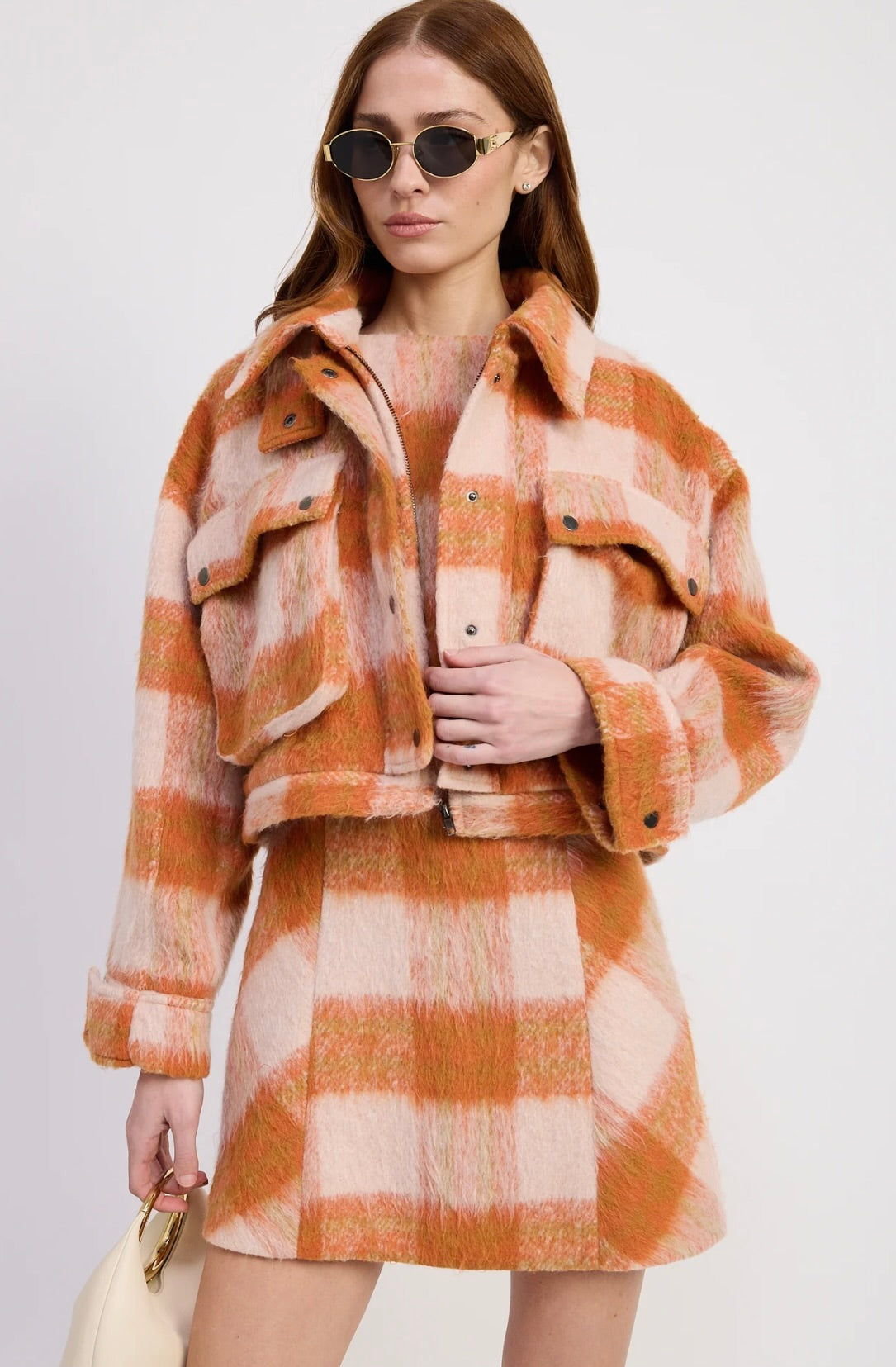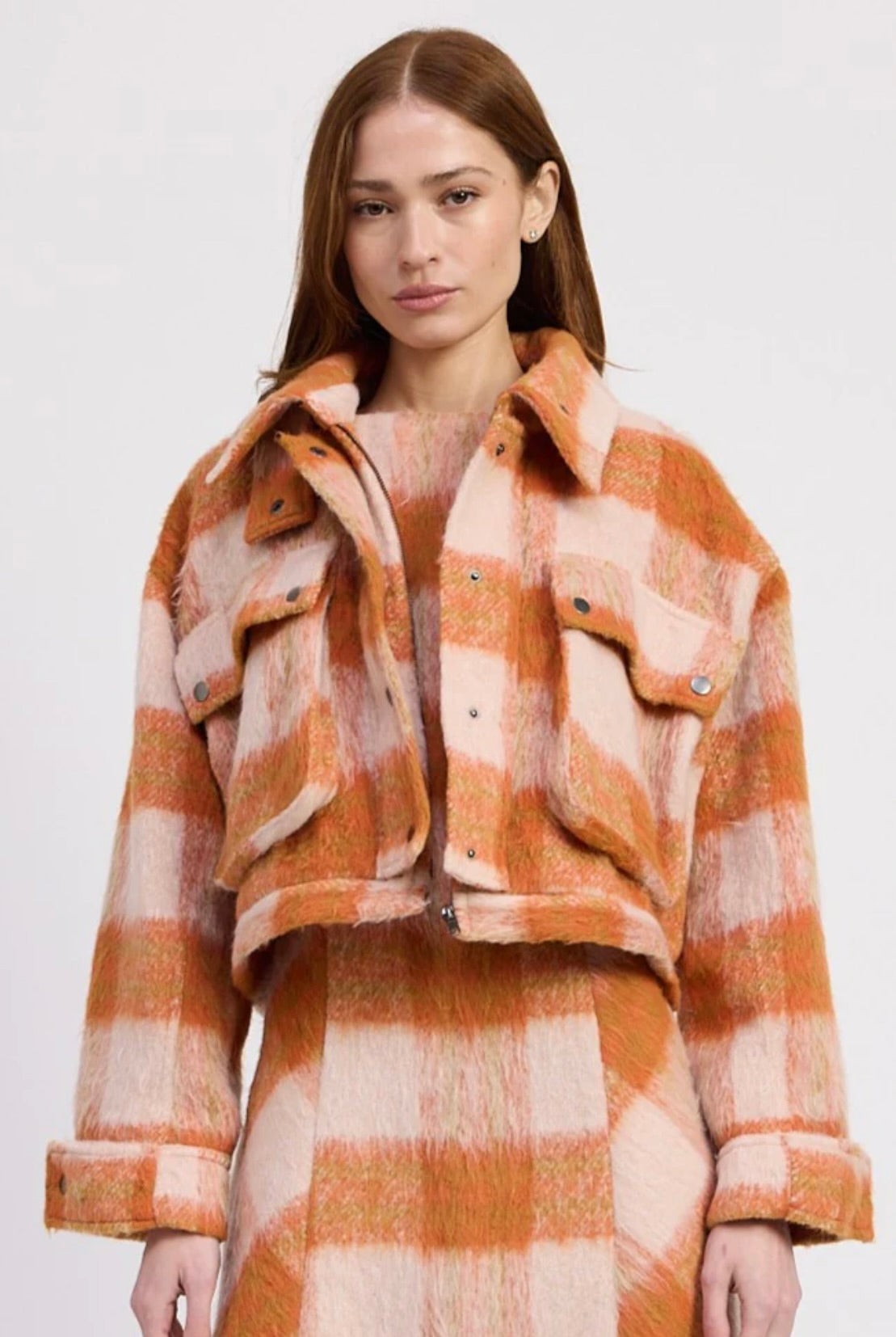 The En Saison Elizabeth Crop Jacket features a boxy, cropped silhouette with two front pockets, blending utility with chic design. It pairs elegantly with the Elizabeth Mini Dress for a refined, coordinated look.