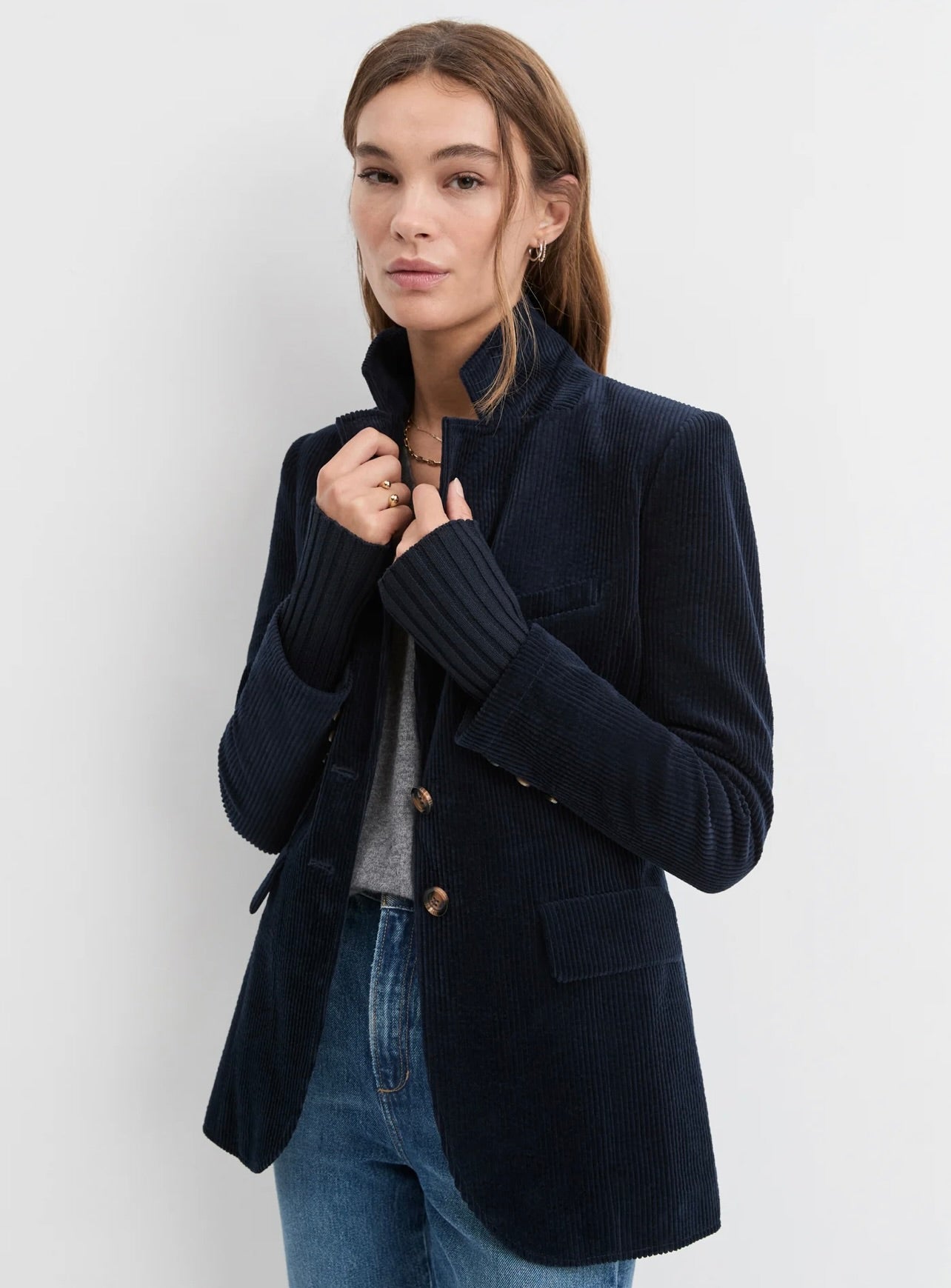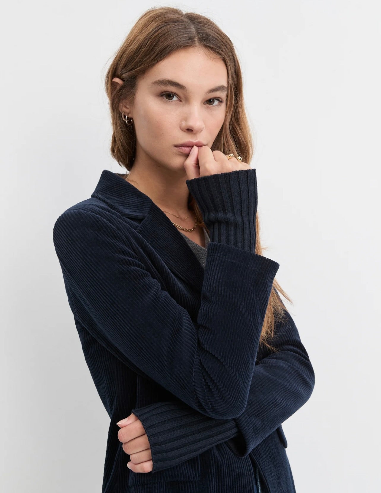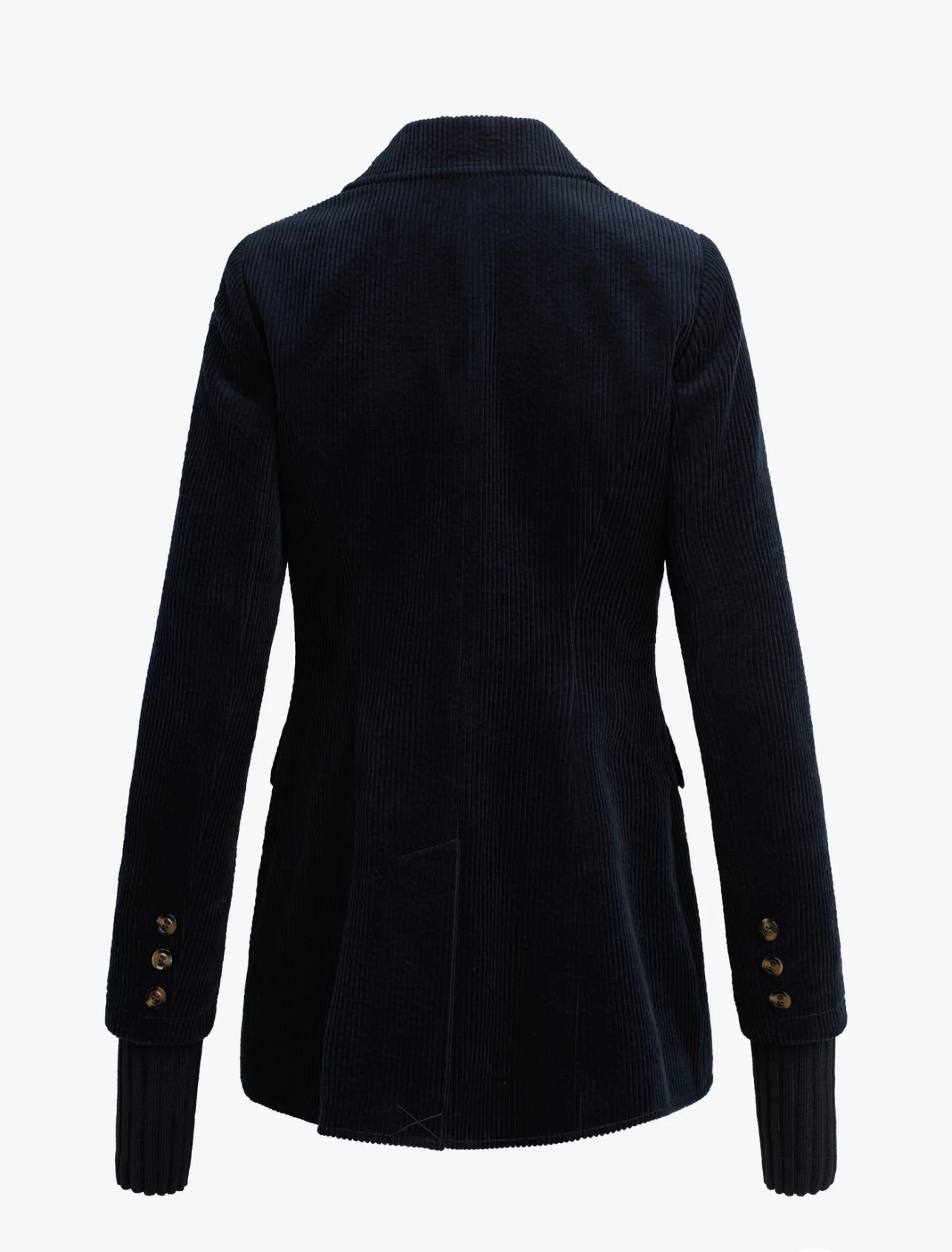 Transform your everyday commute into a fashion moment with this slim-fit wide-wale corduroy blazer. Crafted with faux horn buttons and refined stitching details, it's designed for those who see the city streets as their personal runway. The standout feature? Luxurious cotton-cashmere ribbed cuffs that elevate every gesture, turning a simple walk to work into an effortless style statement.