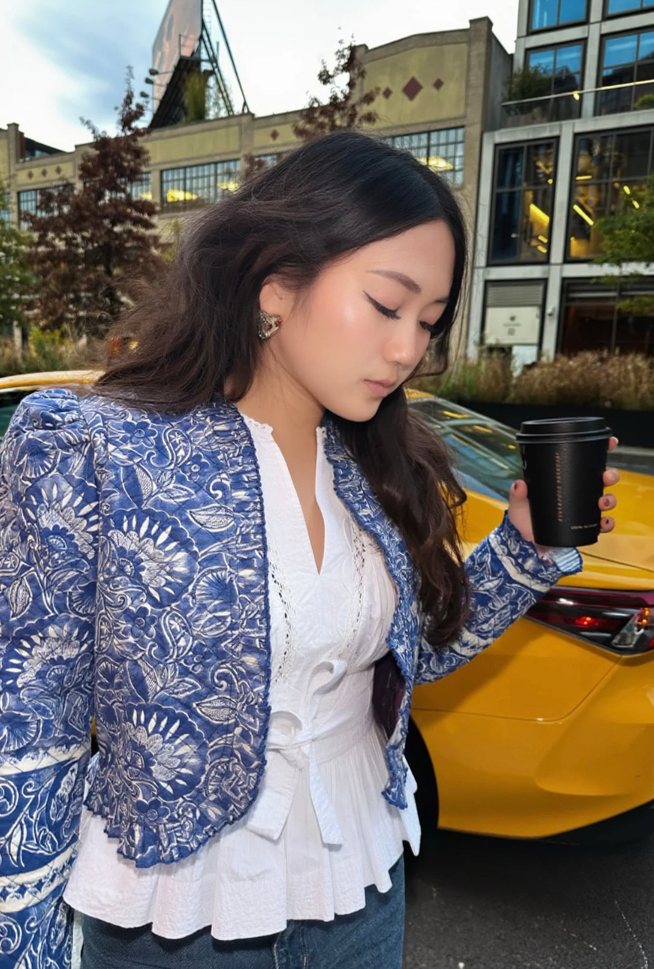 The Adrienne Jacket is a timeless statement piece designed to elevate your outerwear collection. This sophisticated quilted cotton jacket showcases an elegant Arabesque Print throughout, while a distinctive ruffle-trim collar frames the neckline and gracefully extends to the hem for added dimension. The contrast printed interior lining reveals a thoughtful design detail with every wear, making this jacket as refined on the inside as it is striking on the outside.