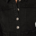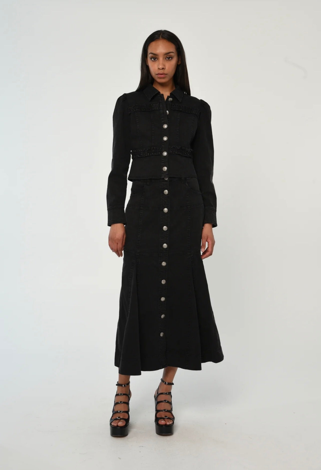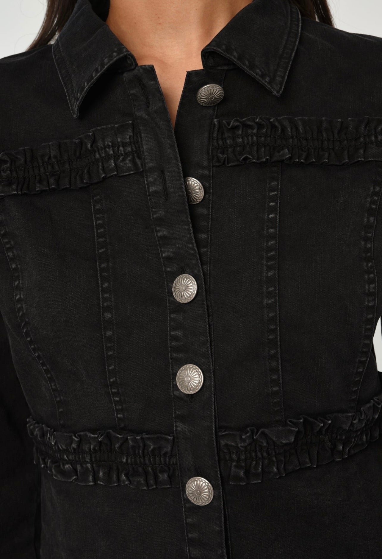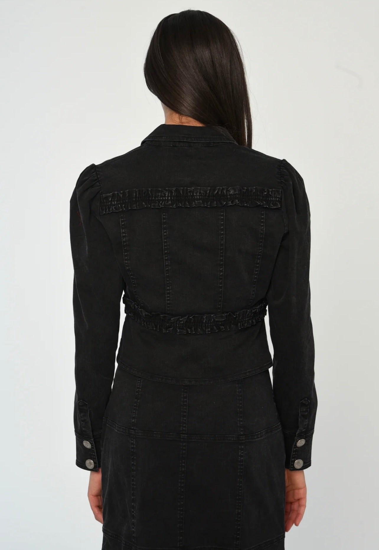 The Neva Jacket by Love the Label reimagines the classic denim jacket with refined, playful elegance. Crafted from Midnight Washed Stretch Denim, this vintage-inspired piece features distinctive ruffled detailing at the yoke and peplum waist, adding movement and dimension to your silhouette. The stretch fabric ensures comfortable wear throughout the day. Layer it effortlessly over dresses, pair it with your favorite pants, or wear it with the matching Romeo skirt.