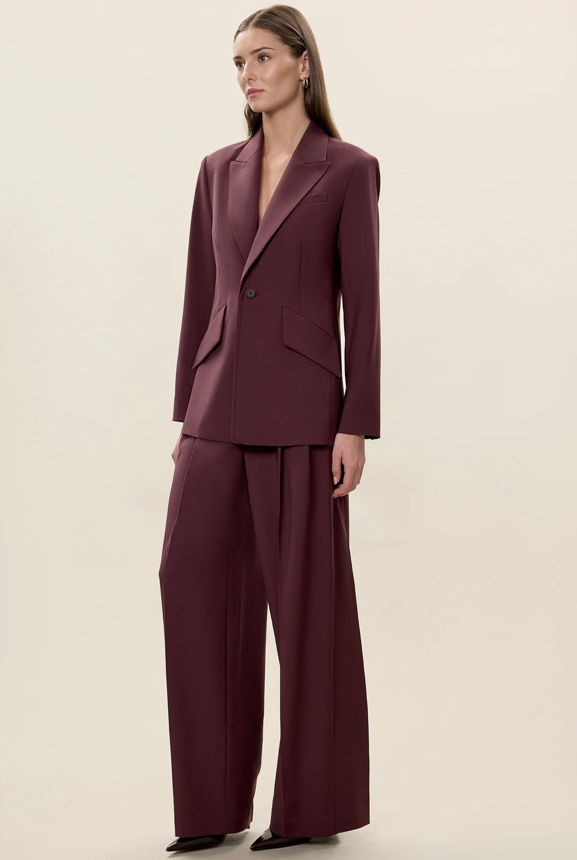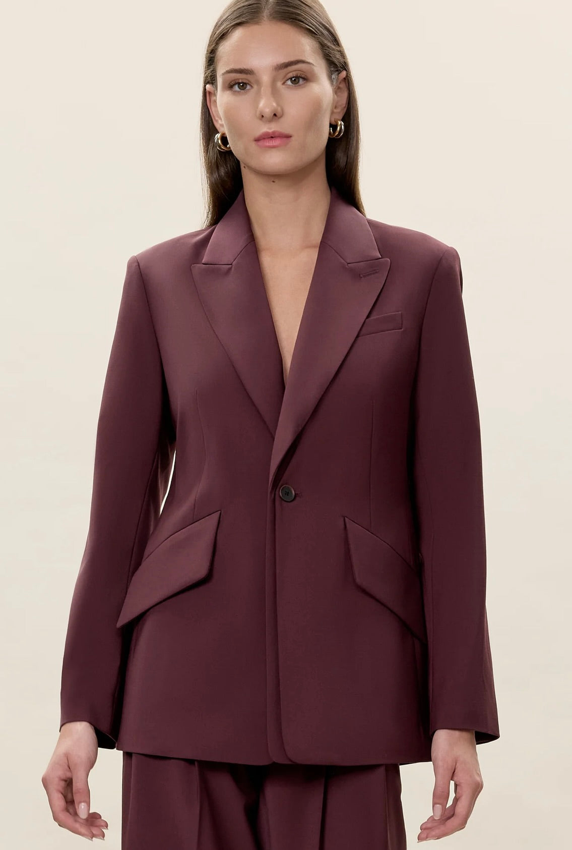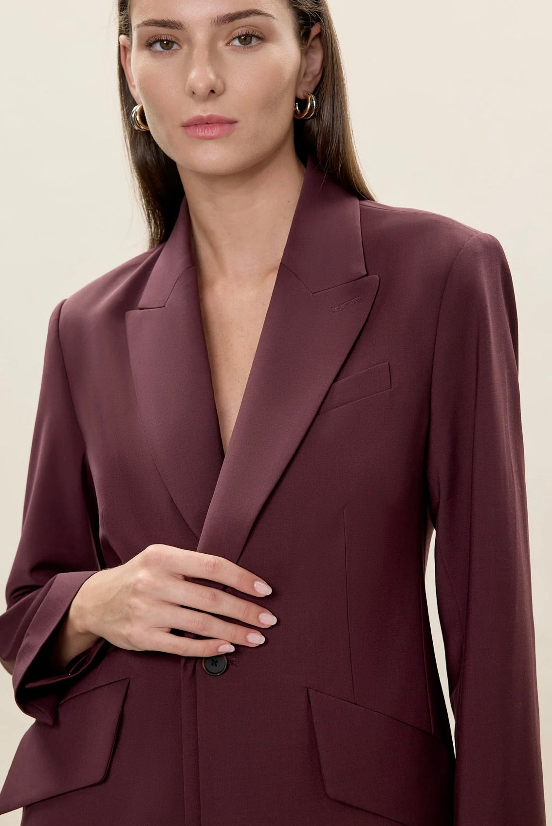 The Stevie Blazer in Plum presents a sophisticated wool blend design with refined tailoring, featuring an elegant button-front closure and functional pockets. Its rich plum shade offers jewel-toned elegance, while the added stretch ensures comfortable wear. This polished blazer embodies professional grace with a luxurious fabric blend and timeless silhouette, perfect for elevating any wardrobe with classic style and modern comfort.