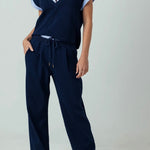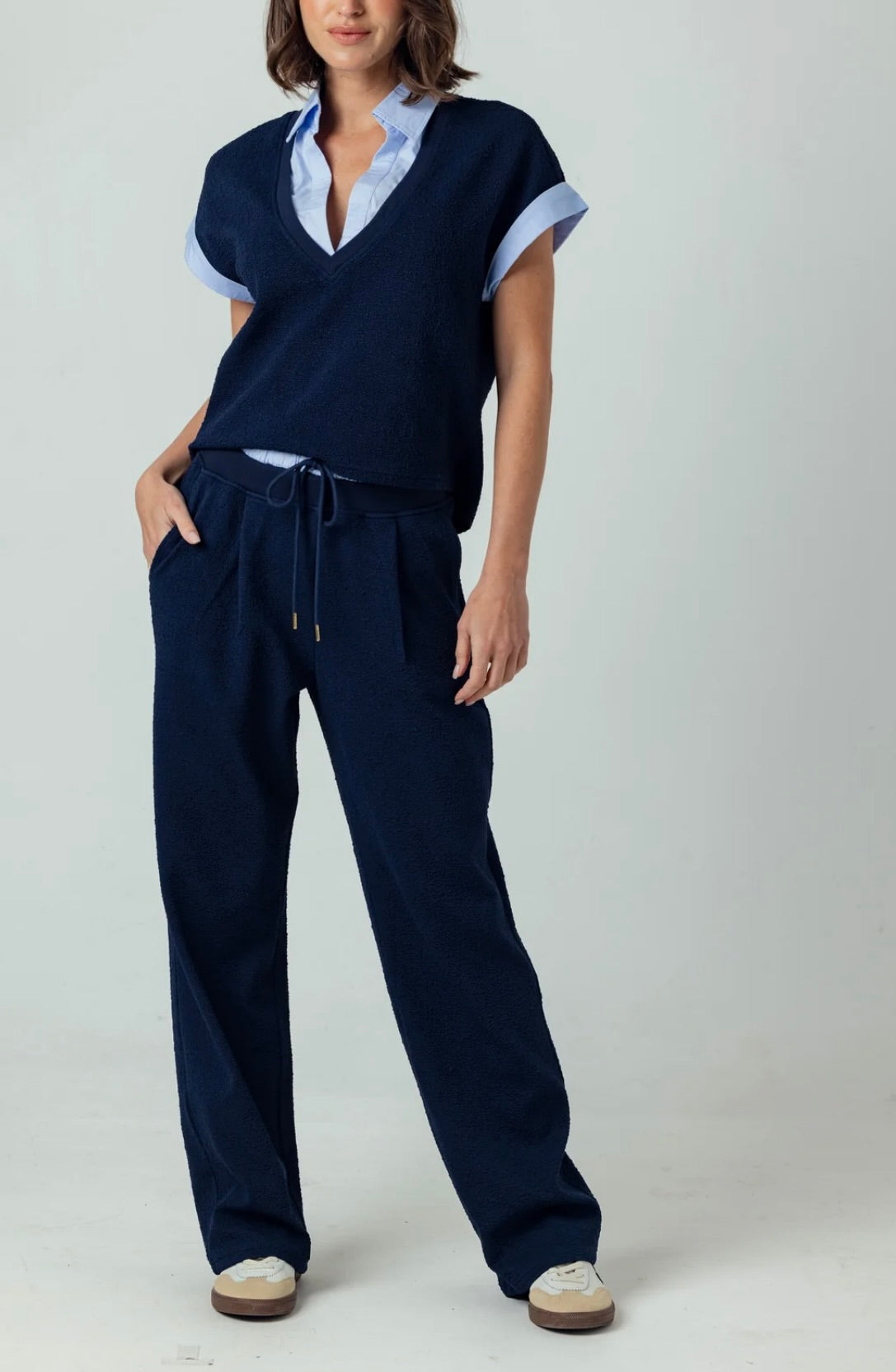 Discover the Leonie Pants, your new go-to for relaxed elegance. Crafted with a unique blend of crinkle terry and classic cotton poplin, these pants feature a distinctive double waistband with a gold-tipped drawcord for adjustable styling. Wear them loose for a casual, low-rise look or cinch the waist for a refined silhouette. The full-length inseam falls just above the ground with sneakers, making them perfect for everyday sophistication. Complete the ensemble with the Lune Top for a chic, effortless outfit.