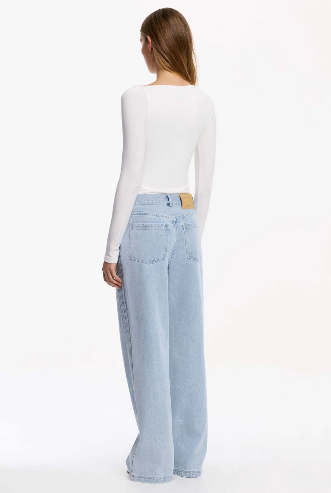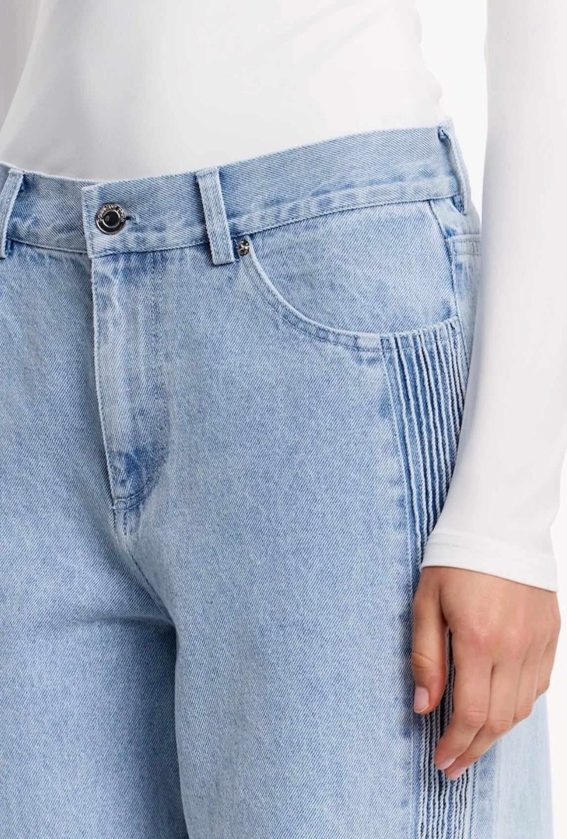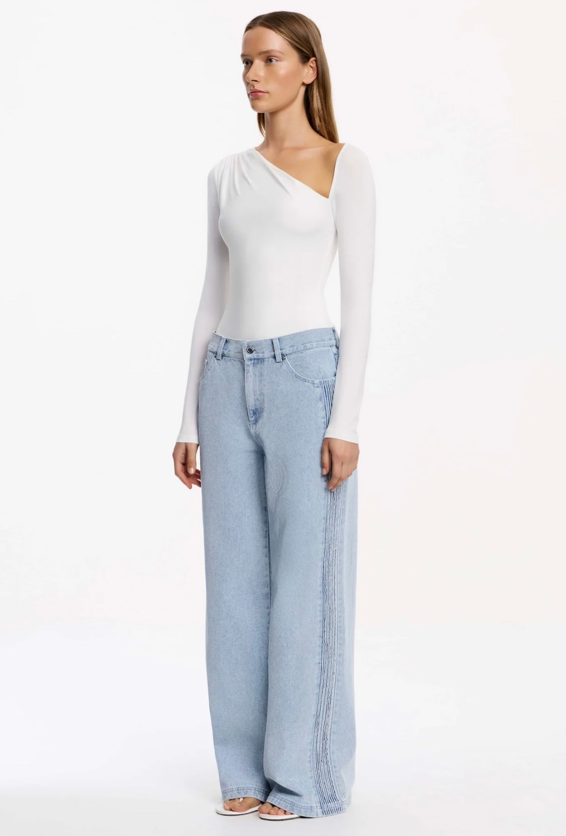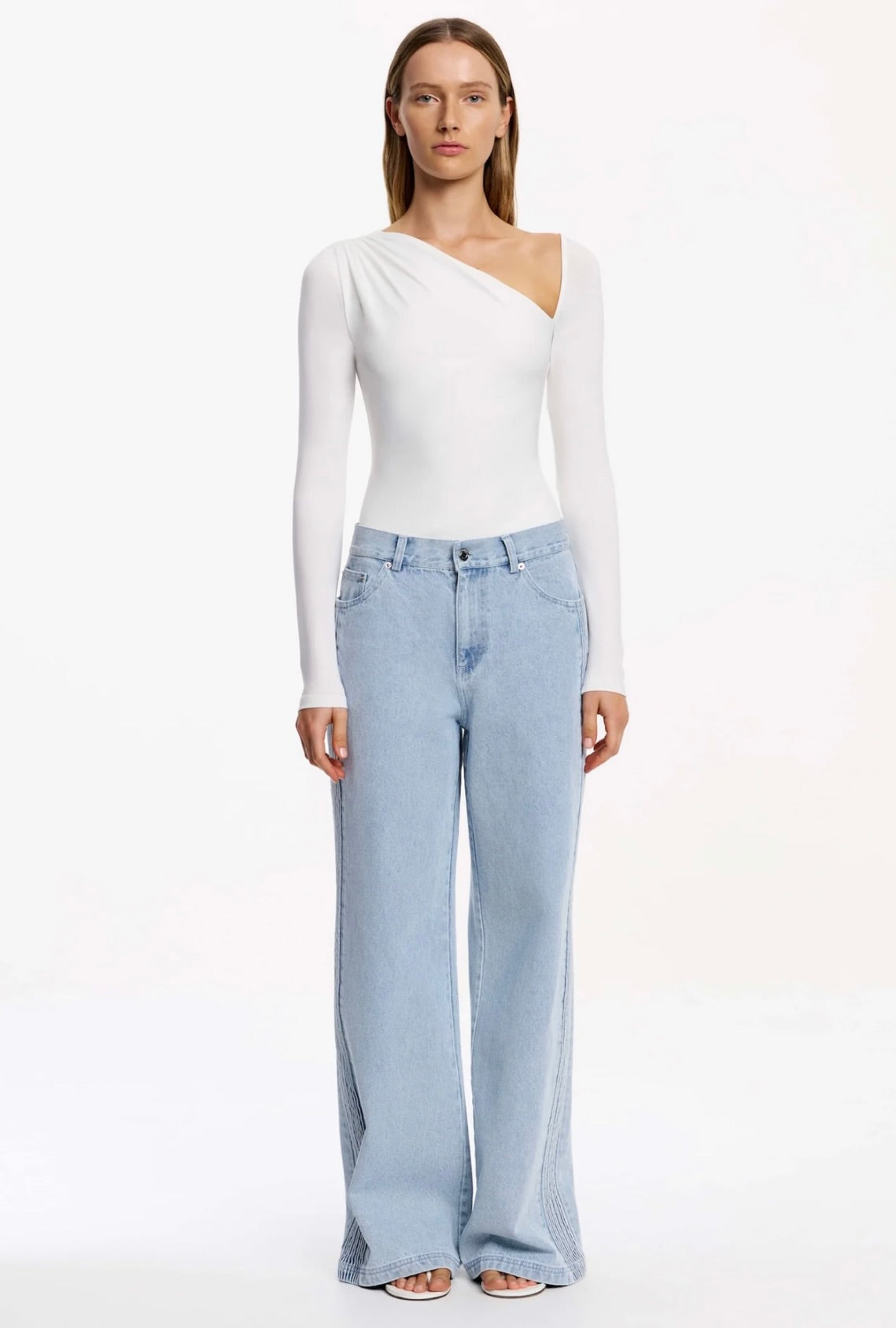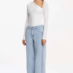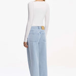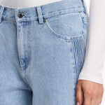 The Raiya Jean in Blue Wash merges timeless denim craftsmanship with contemporary design. Its architectural silhouette features a generous straight leg with an intentionally relaxed, slouchy drape that moves effortlessly through your day. A distinctive pintuck panel traces the side front leg, adding subtle visual interest, while classic 5-pocket construction ensures practical versatility. This is the foundational piece that anchors directional daytime styling with understated sophistication.