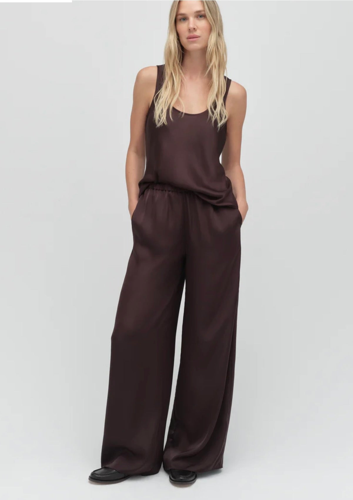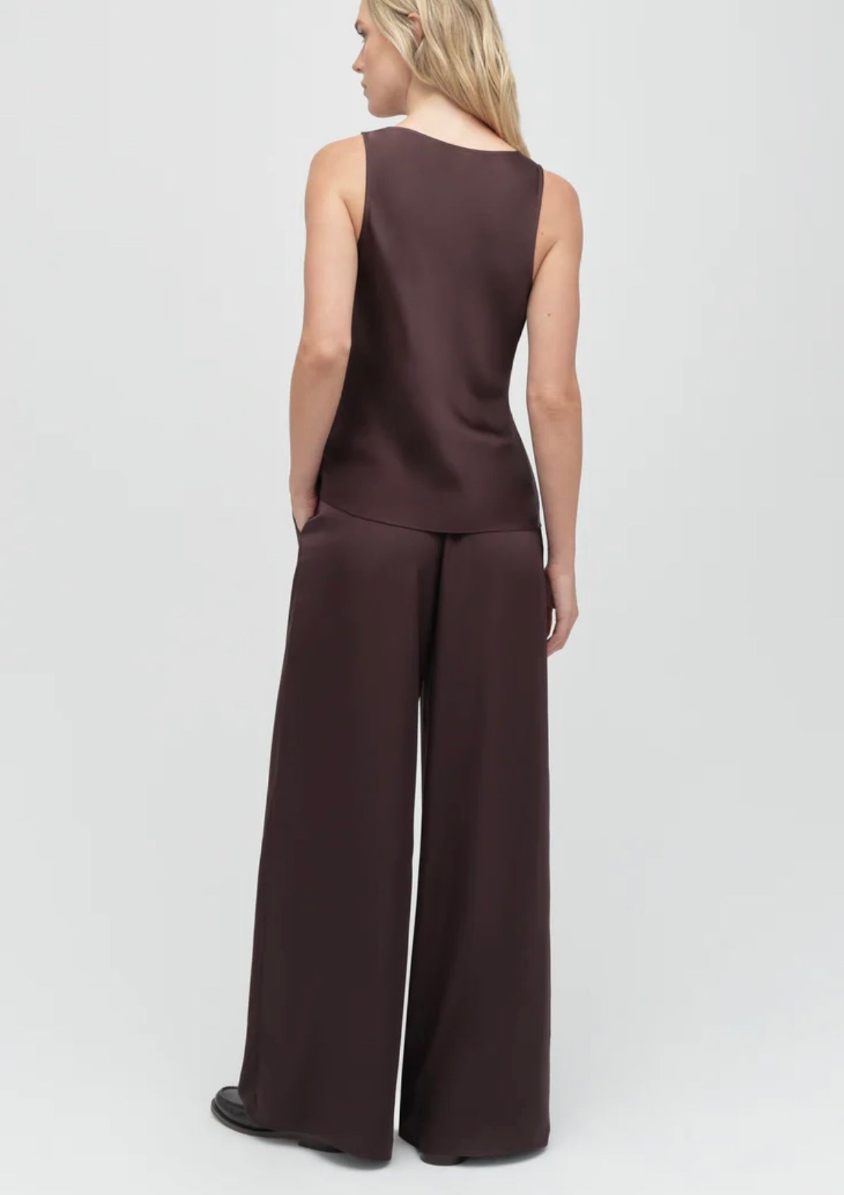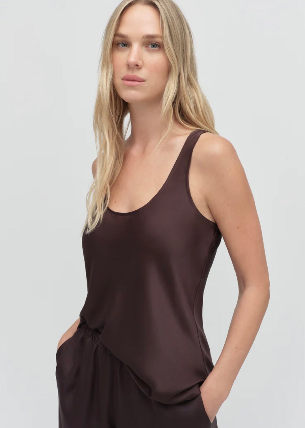 The Clean Cut Tank embodies understated elegance with its refined silhouette and luxurious satin fabric. The deep U-neckline creates a flattering, versatile look—polished enough to layer beneath a tailored blazer for the office, yet striking enough to stand alone for evening wear. Clean lines and a fluid drape make this piece a sophisticated wardrobe essential that transitions effortlessly from day to night.