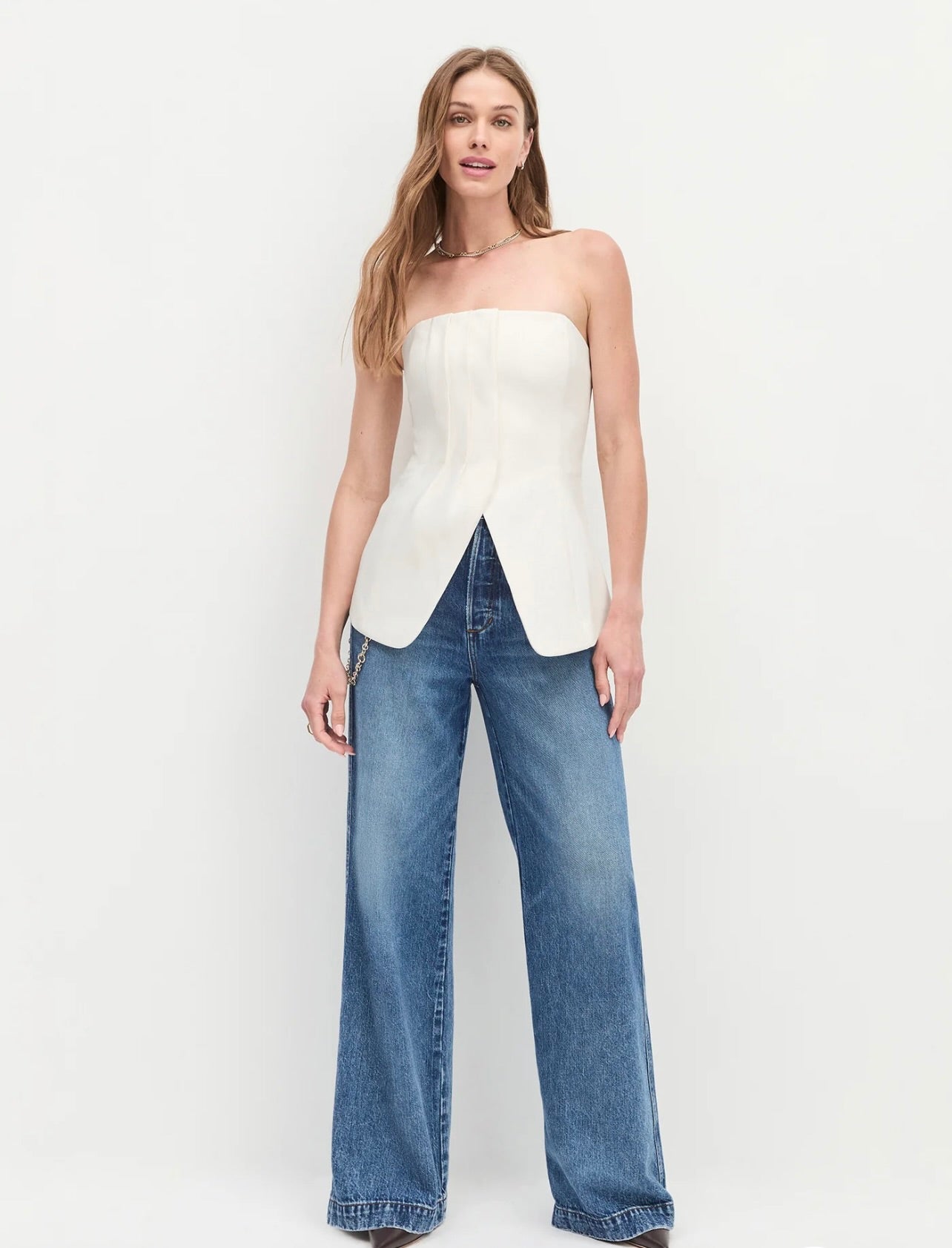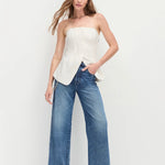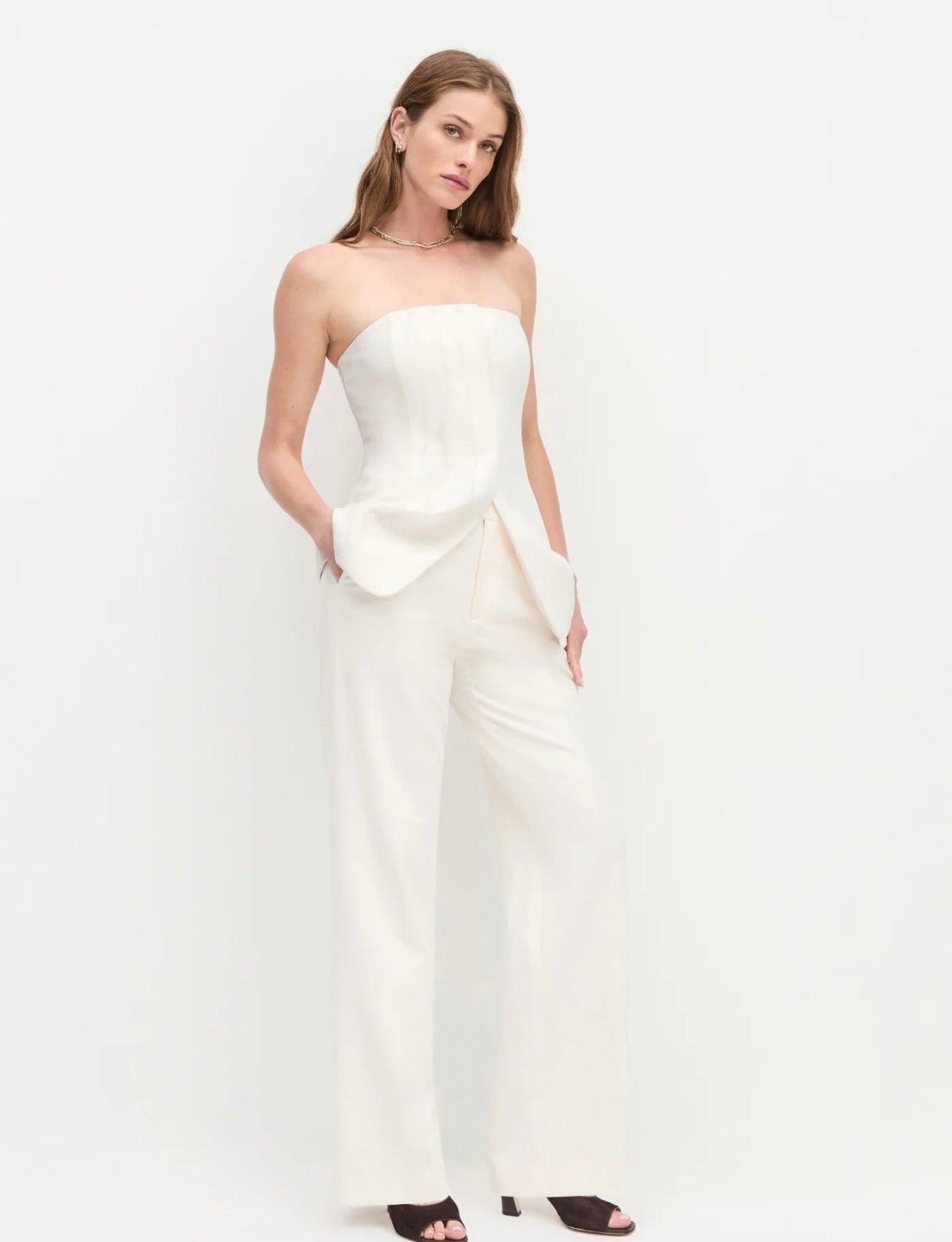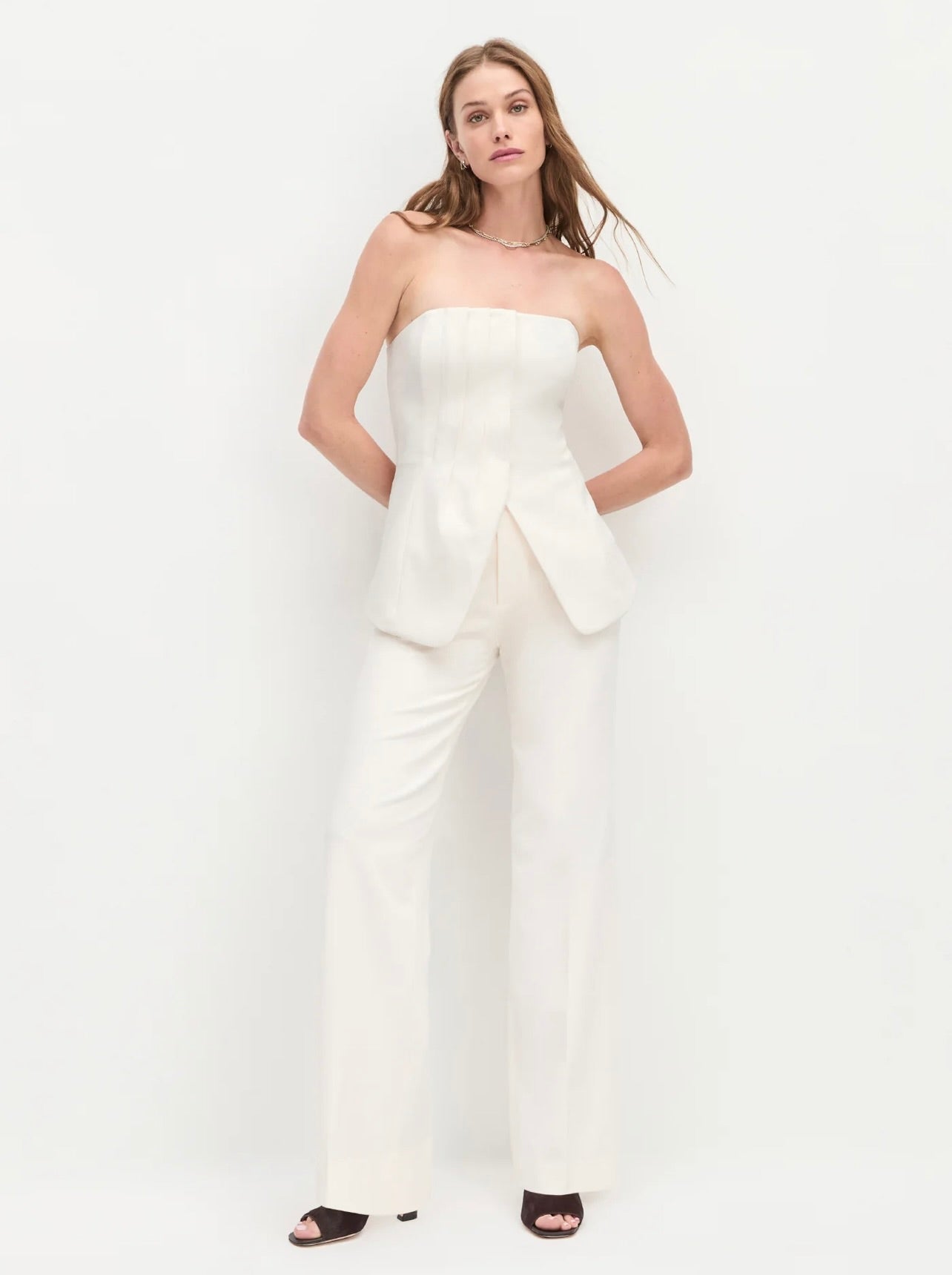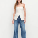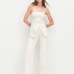 This strapless bustier top features elegant front pleat details and a flattering body-skimming fit with a subtle hem opening. Crafted from a lightweight suiting blend with a touch of stretch, it ensures comfort without compromising style. Pair it with The Odessa Pant for a refined, polished ensemble that effortlessly transitions from day to night.