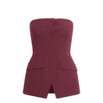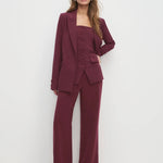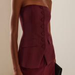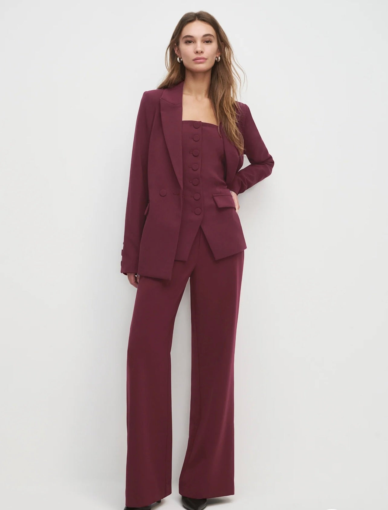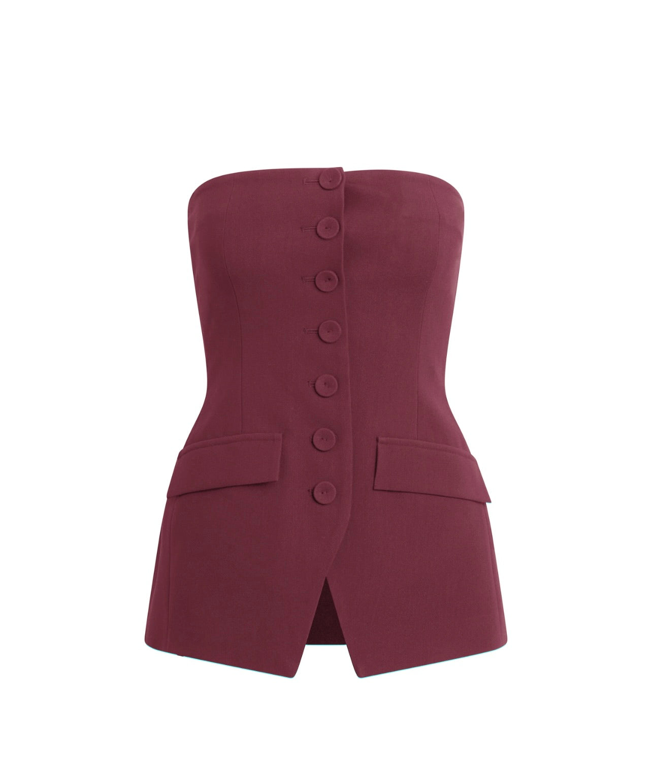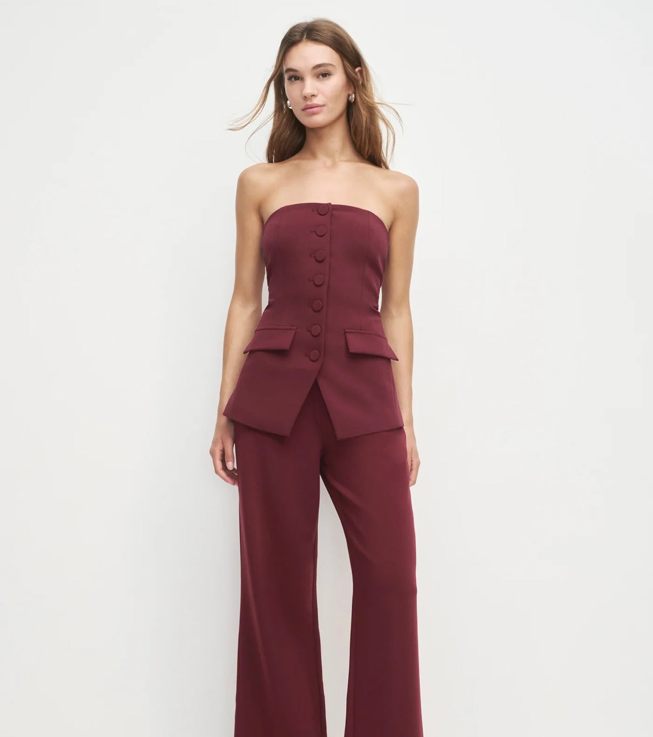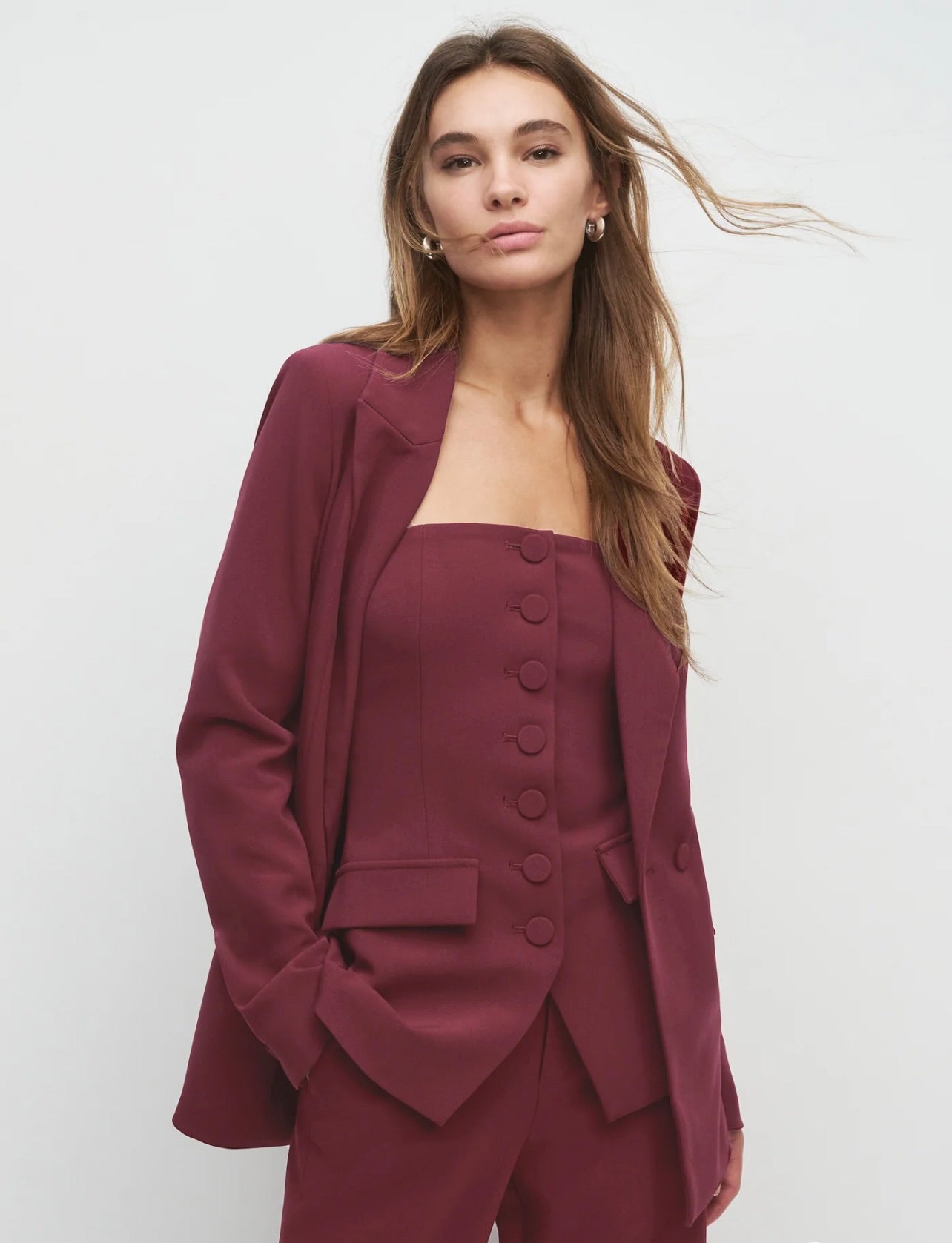 The Dream Phoebe Bustier channels tailored menswear with an unexpected twist. Crafted from a structured suiting blend in rich Vino, this piece features classic tailoring details—crisp front buttons, functional flap pockets, and a refined silhouette—balanced by a discreet elastic back for all-day comfort. Versatile and polished, it pairs effortlessly with denim for an elevated casual look or coordinates beautifully with The Jones Pant and Suits Your Blazer for a complete, cohesive ensemble.