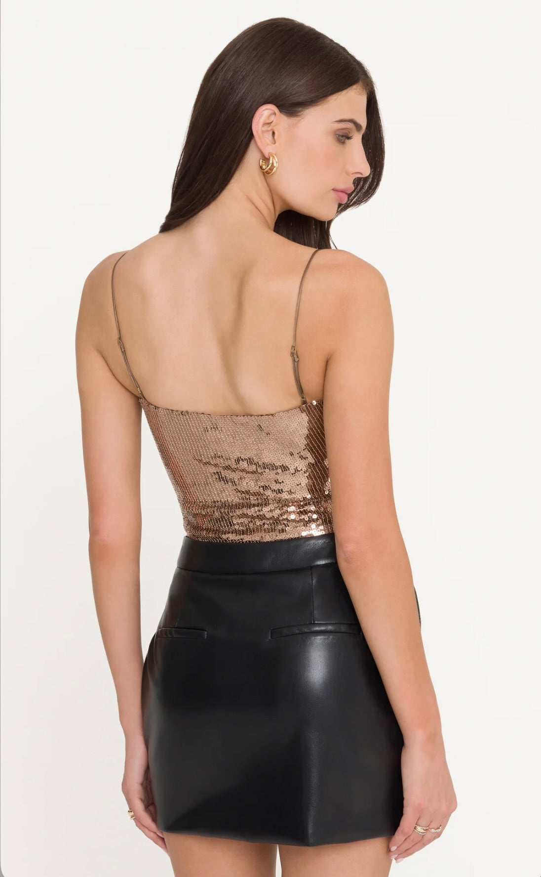 The Sarah Sequin Bodysuit is a statement base layer designed for those who embrace bold glamour. Crafted with a close, body-hugging fit, this sleek one-piece features lustrous black sequins layered over a stretch foundation that moves seamlessly with your body. The high-shine finish transforms any outfit into an evening-ready ensemble. Style it with wide-leg satin trousers for refined elegance or pair with a vegan leather mini skirt for an edgy, sophisticated look.