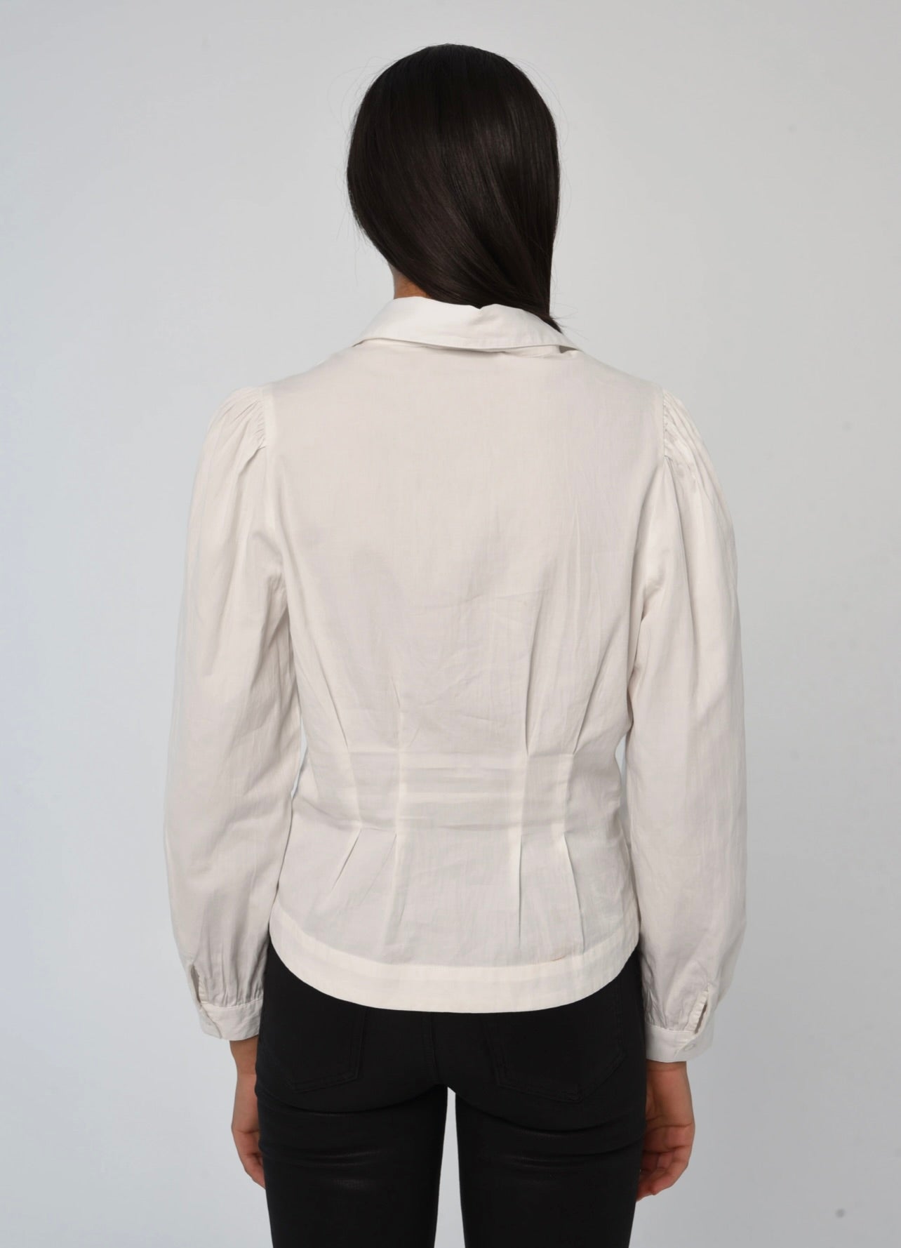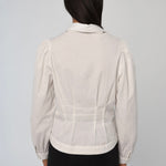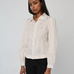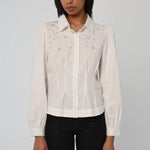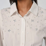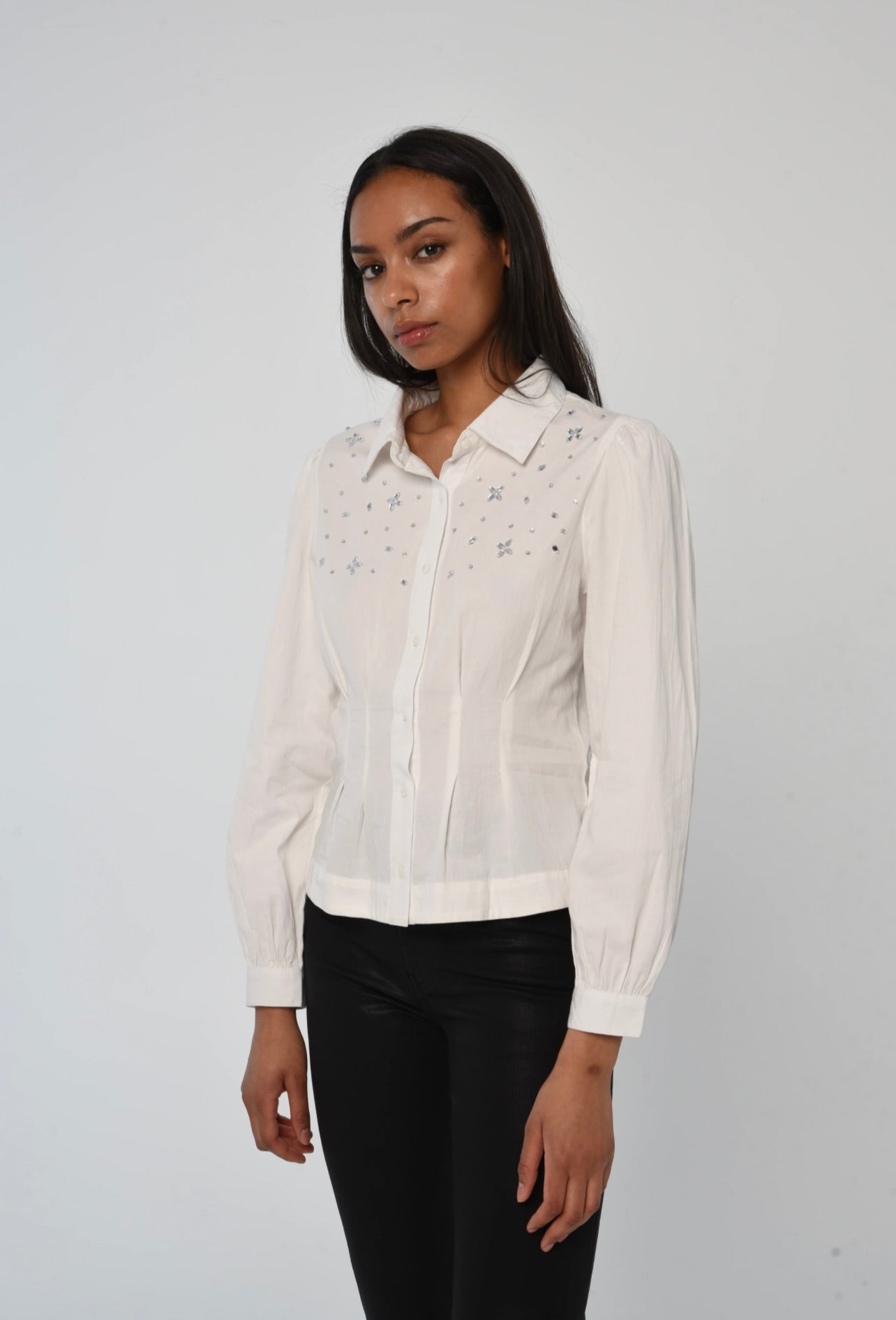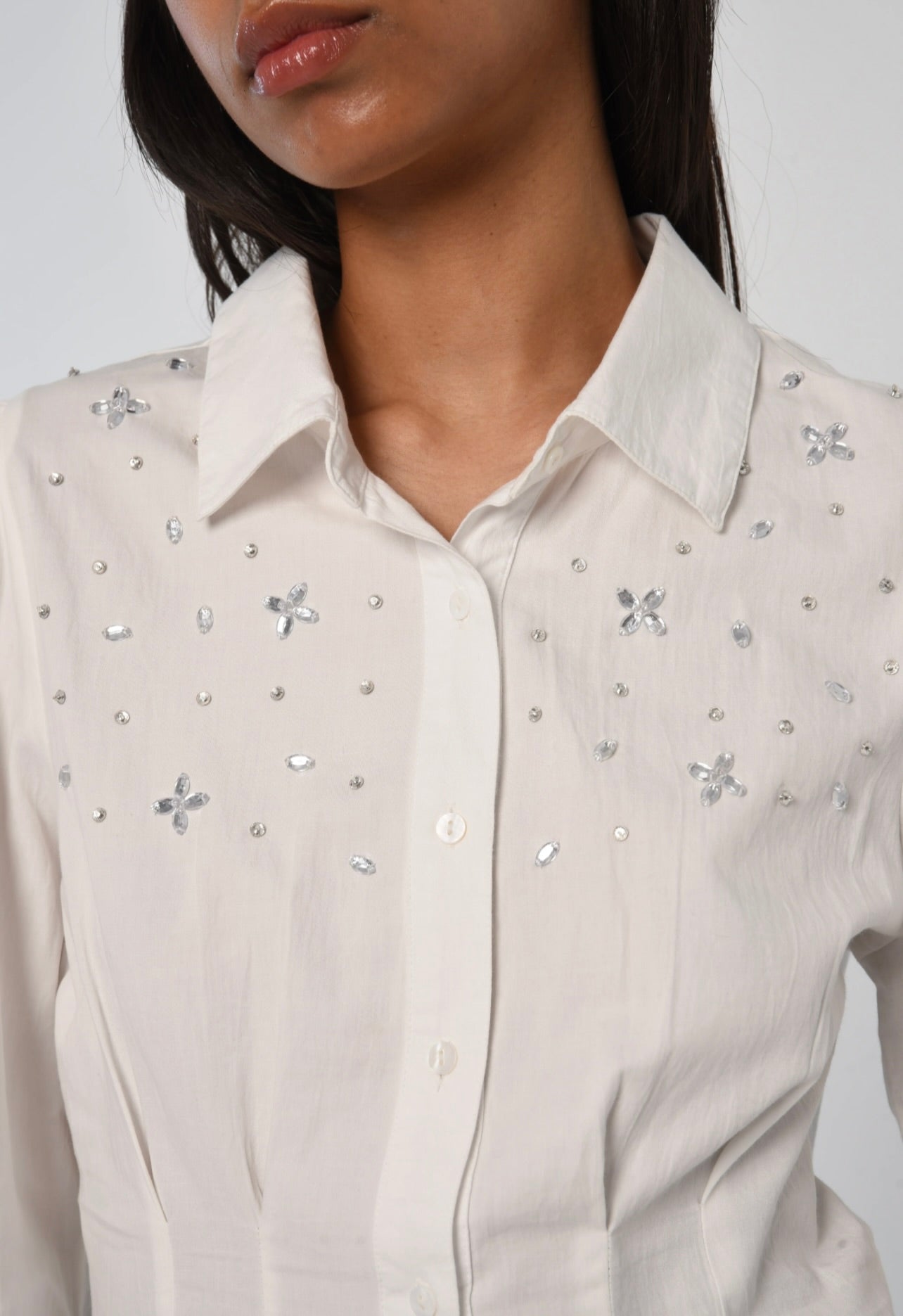 The Nina Top reimagines the timeless white shirt with refined elegance. This fitted silhouette features strategic darts that sculpt the waist, while shell buttons trace the center front for a polished finish. Hand-sewn crystals embellish the bodice, adding an unexpected touch of sparkle to an otherwise understated classic. Perfect for elevating everyday wear or creating a statement-making layered look.
