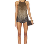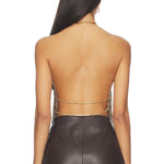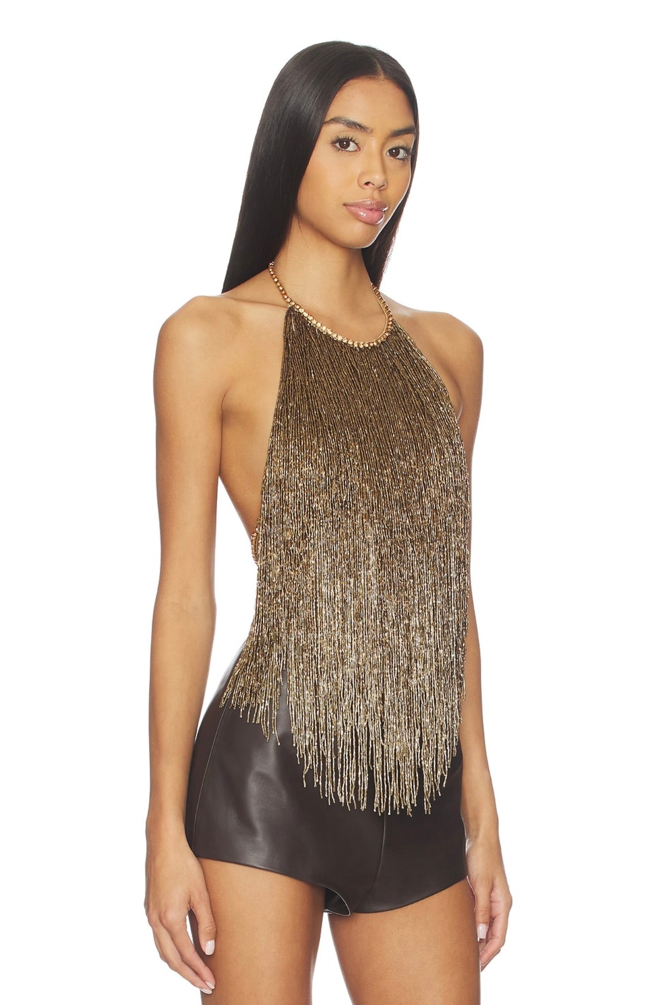 The Retrofête Sable Fringe Top epitomizes refined elegance with its striking halter neckline and secure back lobster clasp closures. The intricately beaded bodice, lined with delicate mesh, creates a luminous foundation, while the open back design showcases shimmering gemstone straps for an unforgettable statement. Perfect for elevated evenings and special occasions.
