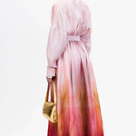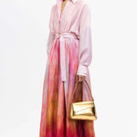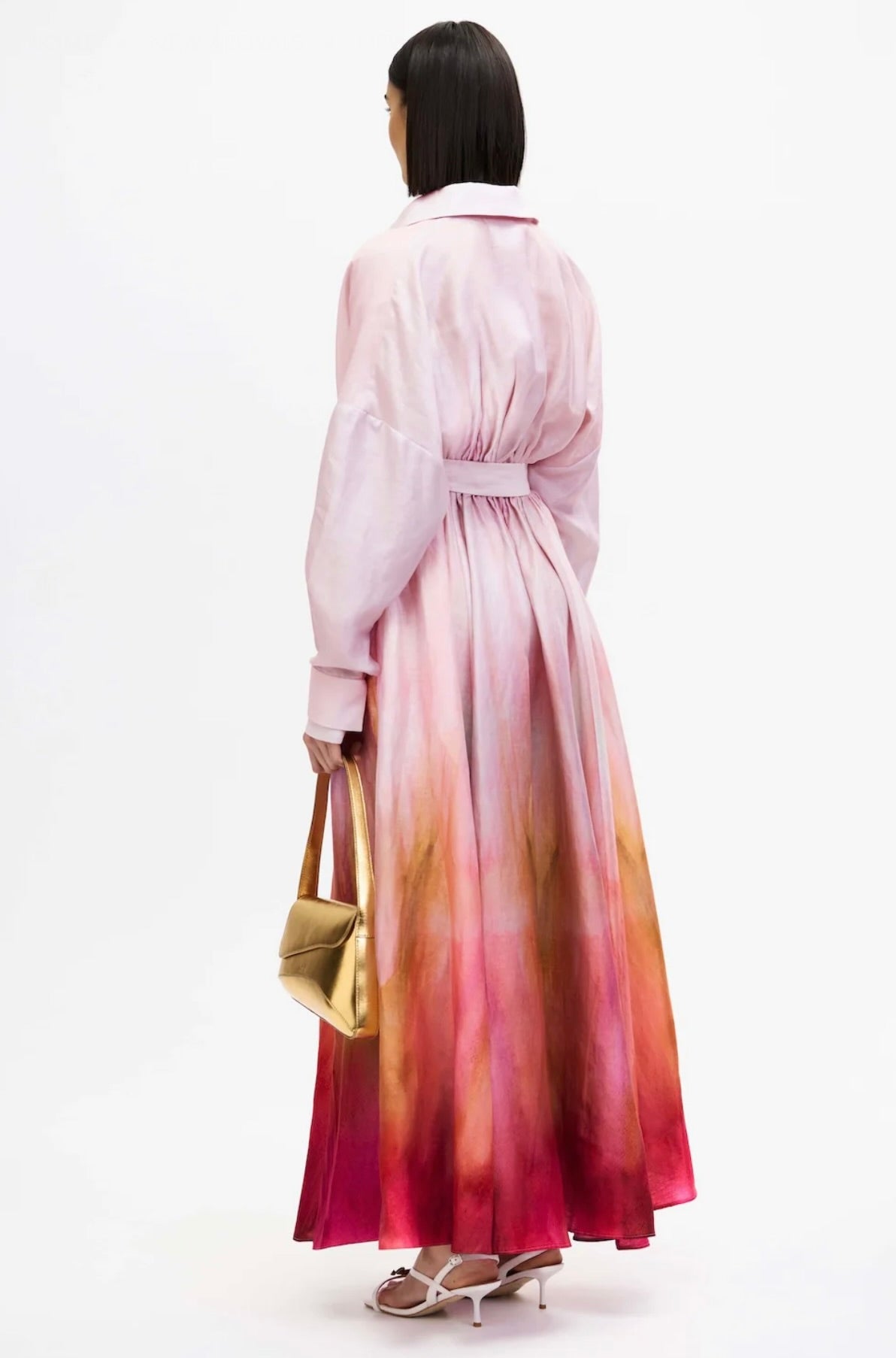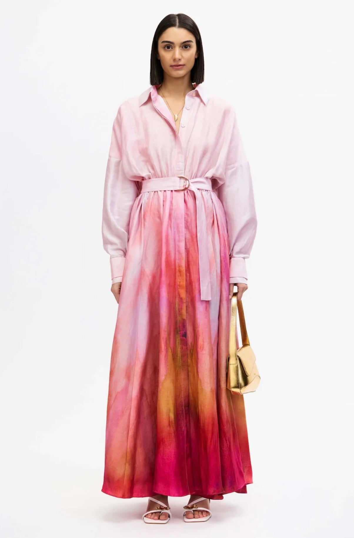 The Acler Driften Maxi Dress in Mimosa Sunrise epitomizes refined elegance with its floor-length silhouette and artistic placement print. Crafted from a luxurious linen blend, this piece features a structured front placket with concealed buttons and polished gold hardware for understated sophistication. The included D-ring belt defines the waist, while the detachable slip provides styling flexibility. Perfect for elevated occasions or as a striking daywear statement.