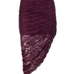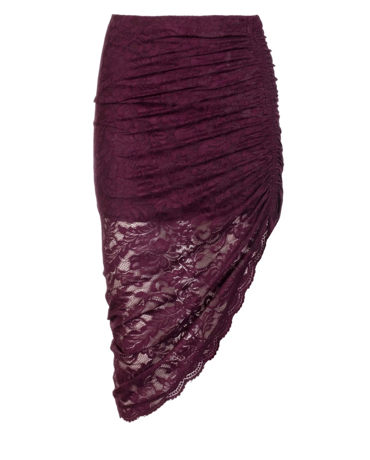Indulge in feminine sophistication with our Generation Love Nellia Lace Skirt. Made from rich aubergine floral lace, this fitted silhouette features a ruched design for a flattering effect, and an asymmetrical hemline for modern edge. Perfect with a sleek cami and heels for a chic evening look.