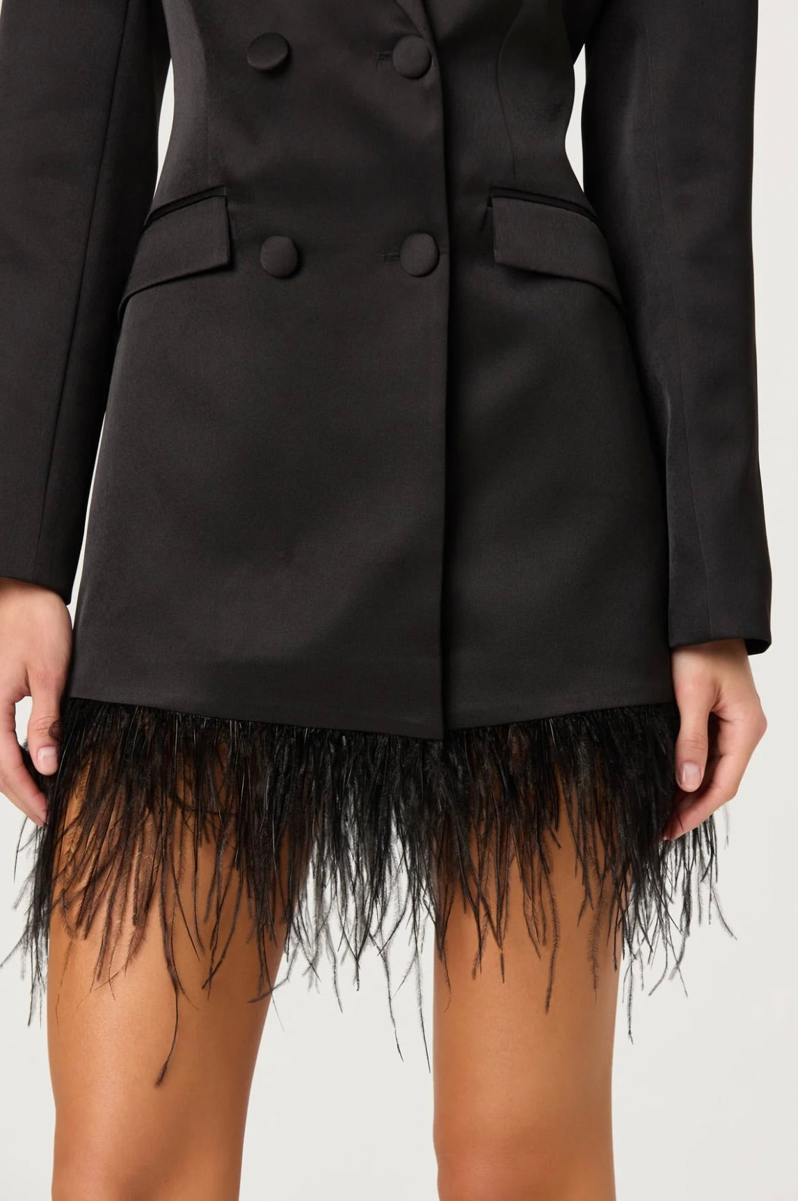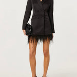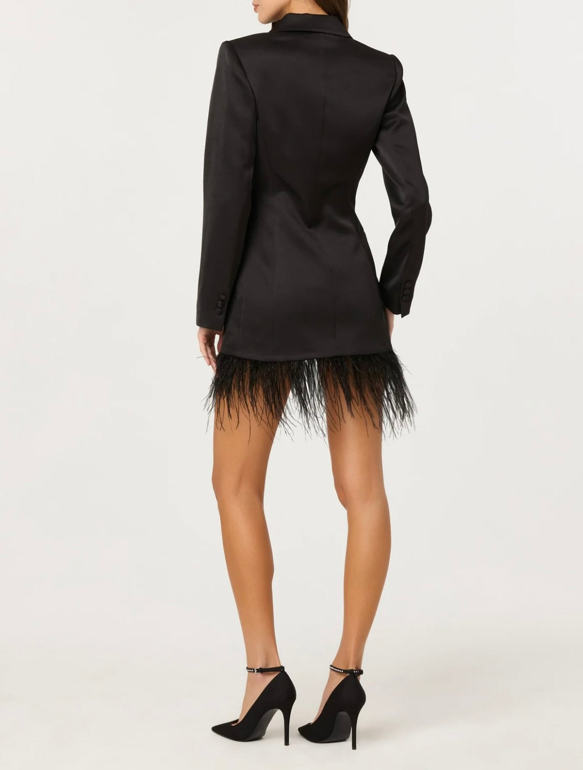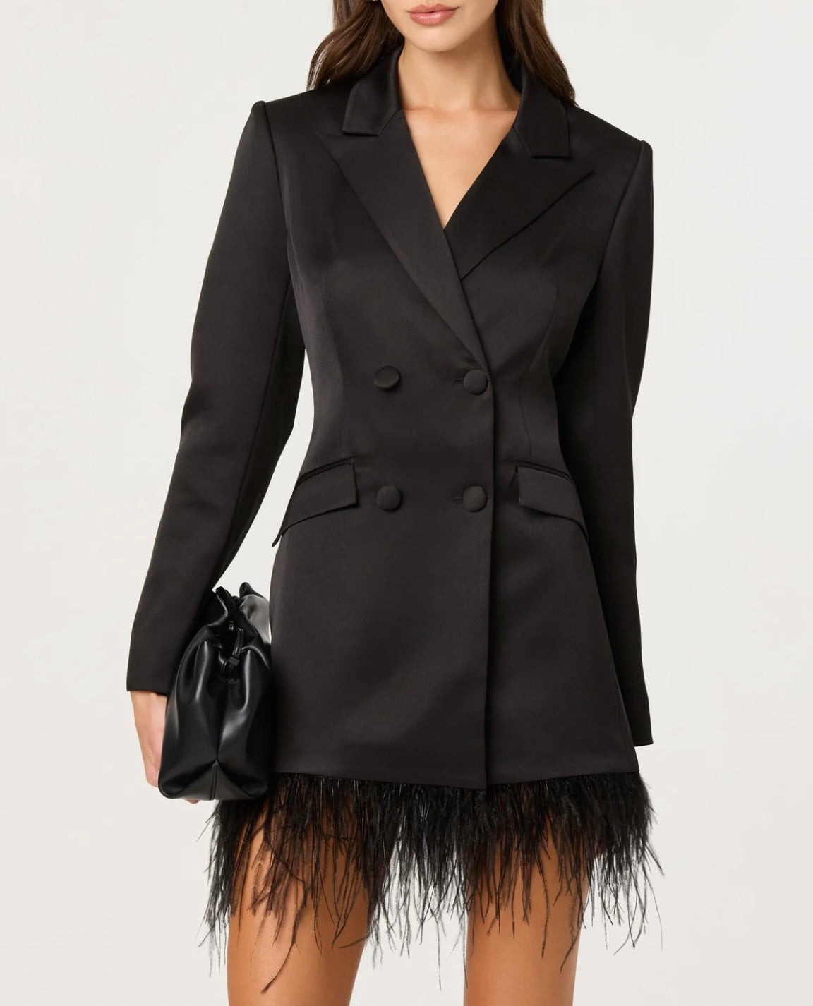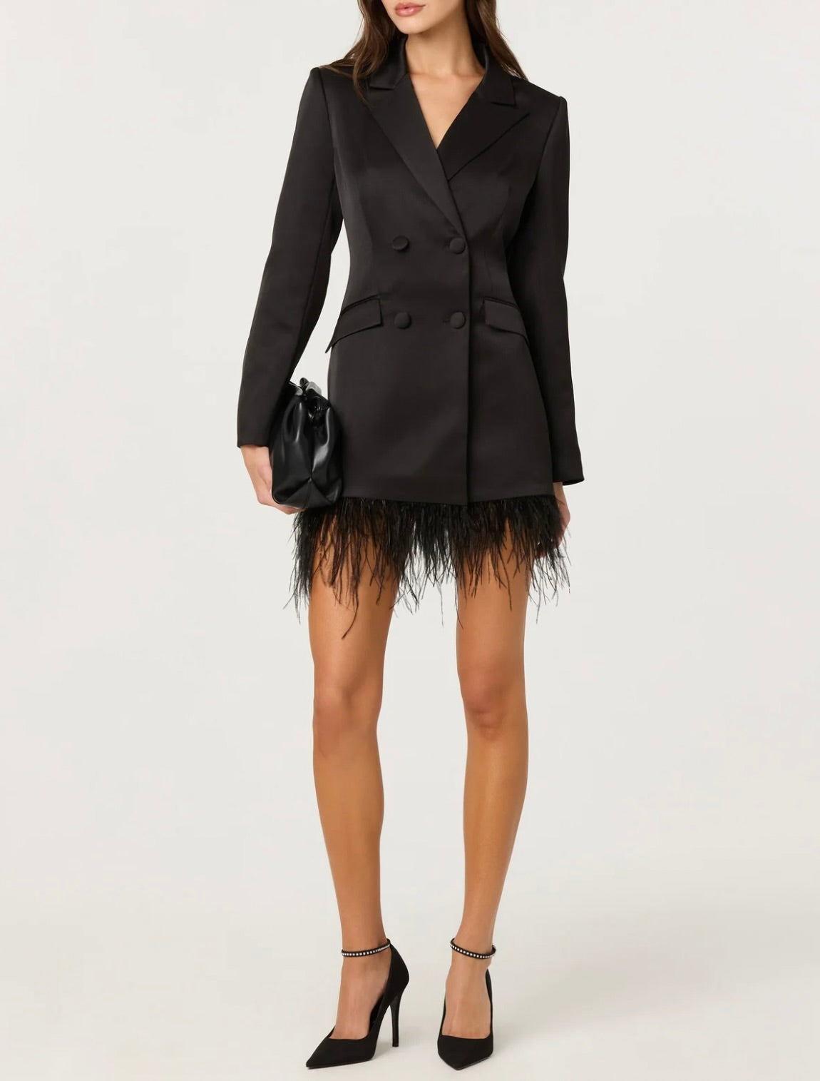 Make a refined statement with this elegant blazer dress, crafted for occasions demanding understated luxury. The sleek satin mini construction showcases exquisite feather trim along the hem, while a structured double-breasted silhouette with notched lapels and padded shoulders delivers timeless sophistication. From corporate celebrations to intimate evening affairs, this versatile piece combines polished tailoring with contemporary style, ensuring you're impeccably dressed for any upscale event.