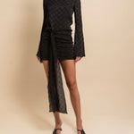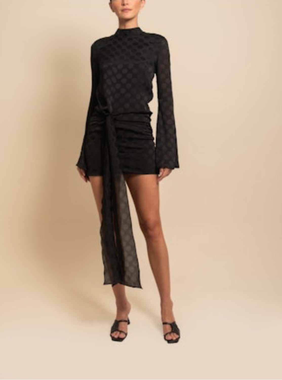 The Azulu Marianne Dress exudes sophistication with its luxurious polka dot satin fabric. Featuring long, flared sleeves and a refined mock neck, this dress offers a graceful, flowing silhouette. An adjustable tie waist allows for a tailored fit, enhancing your natural shape with elegance. Perfect for special occasions, it combines classic style with modern details for a polished, timeless look.