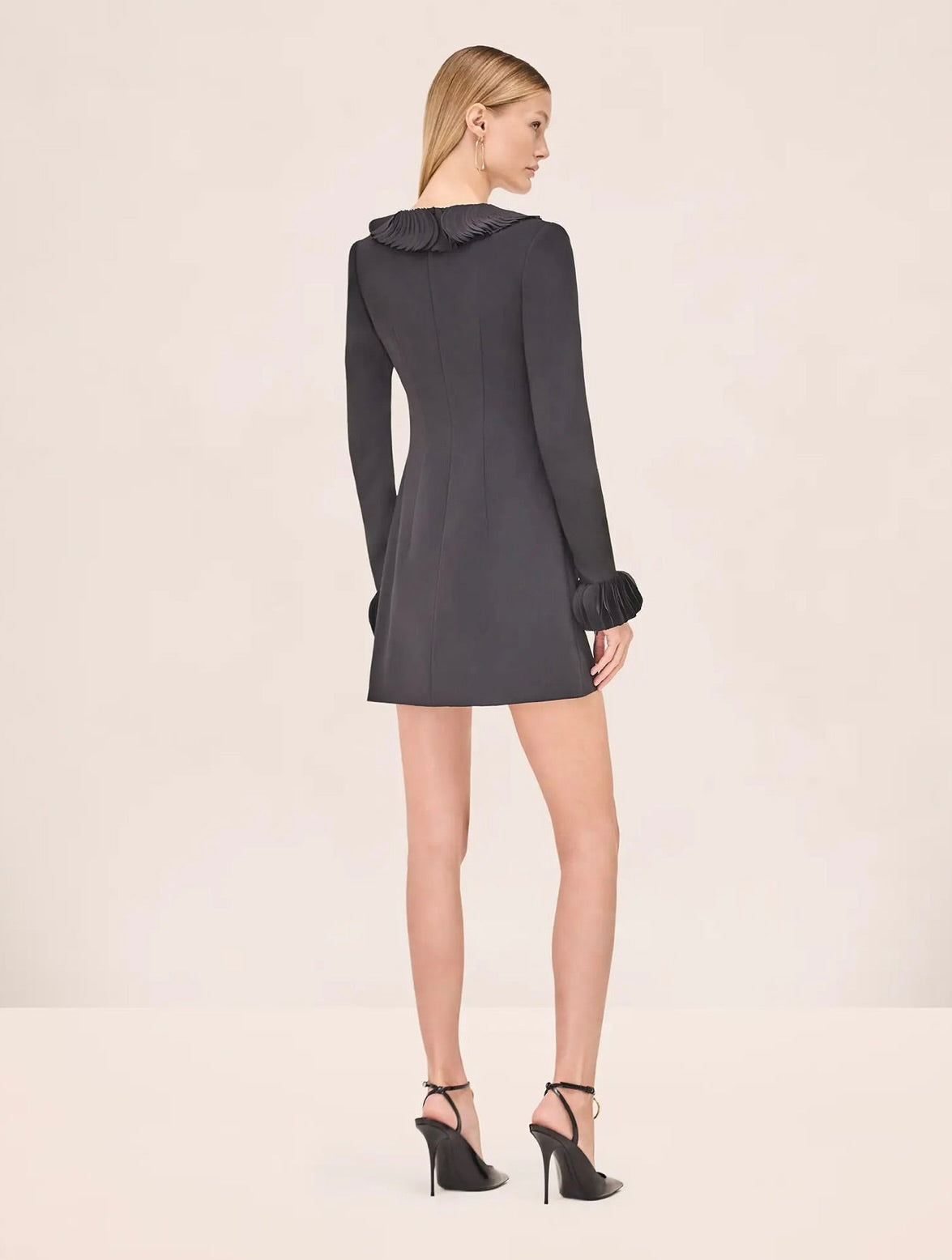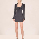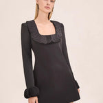 The ALEXIS Tyra Dress combines timeless elegance with contemporary flair. This long-sleeve mini dress features a refined square neckline adorned with delicate pleated ruffle detailing, while matching ruffles at the cuffs add a polished finishing touch. Perfect for elevated casual occasions or dressed-up evenings, this silhouette offers a sophisticated take on feminine style.